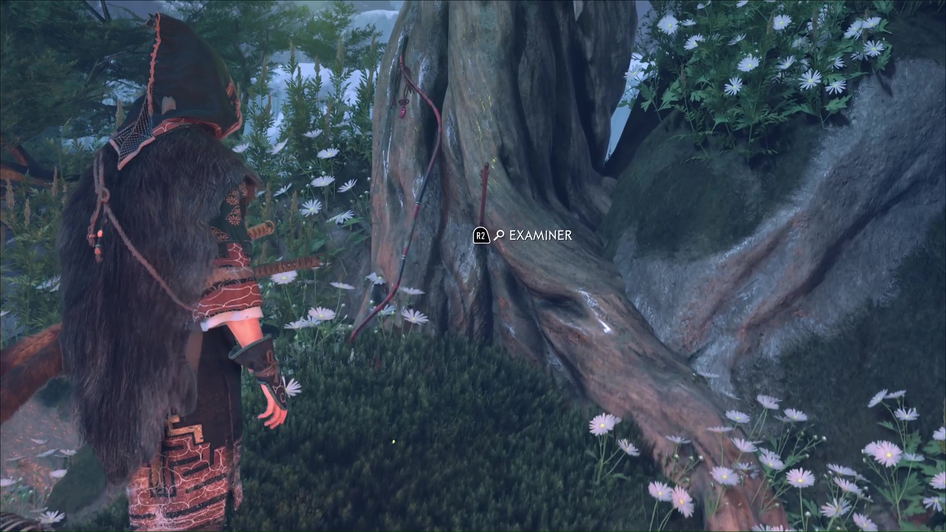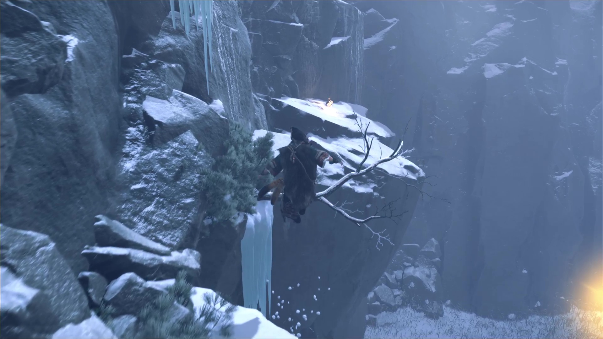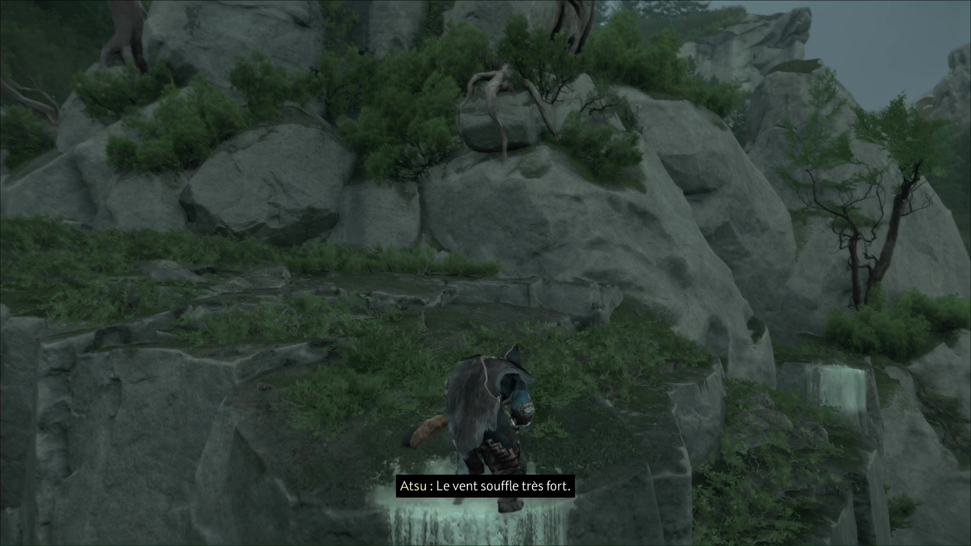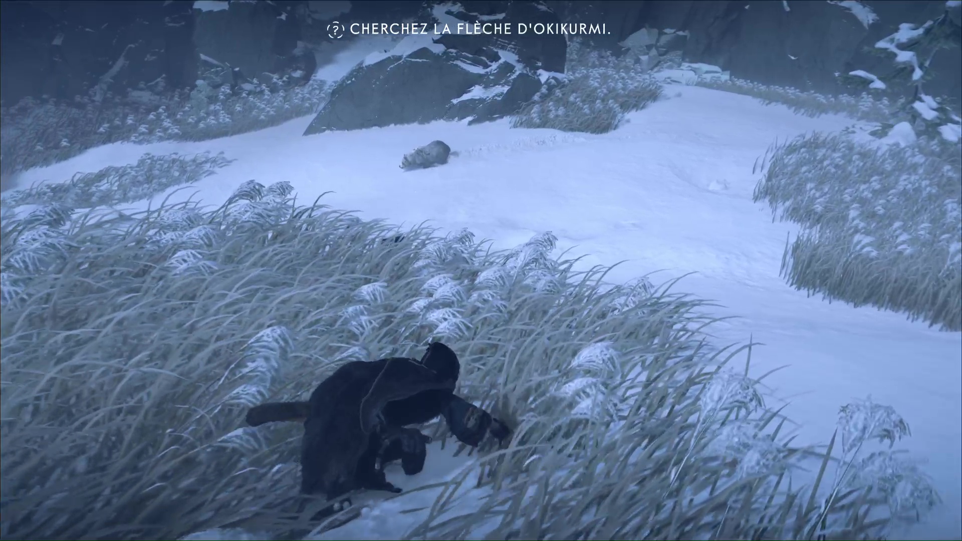 Ô surprise, d’autres prises rocheuses vous attendent pour continuer à prendre de la hauteur. Et une fois en haut, retournez-vous puis sautez sur la plateforme en face. Continuez et vous retrouverez l’aïnou du début de l’ascension. Il vous apprend que seule la flèche d’okikurmi peut vaincre l’ours, et qu’elle se trouve au milieu d’armoises.
