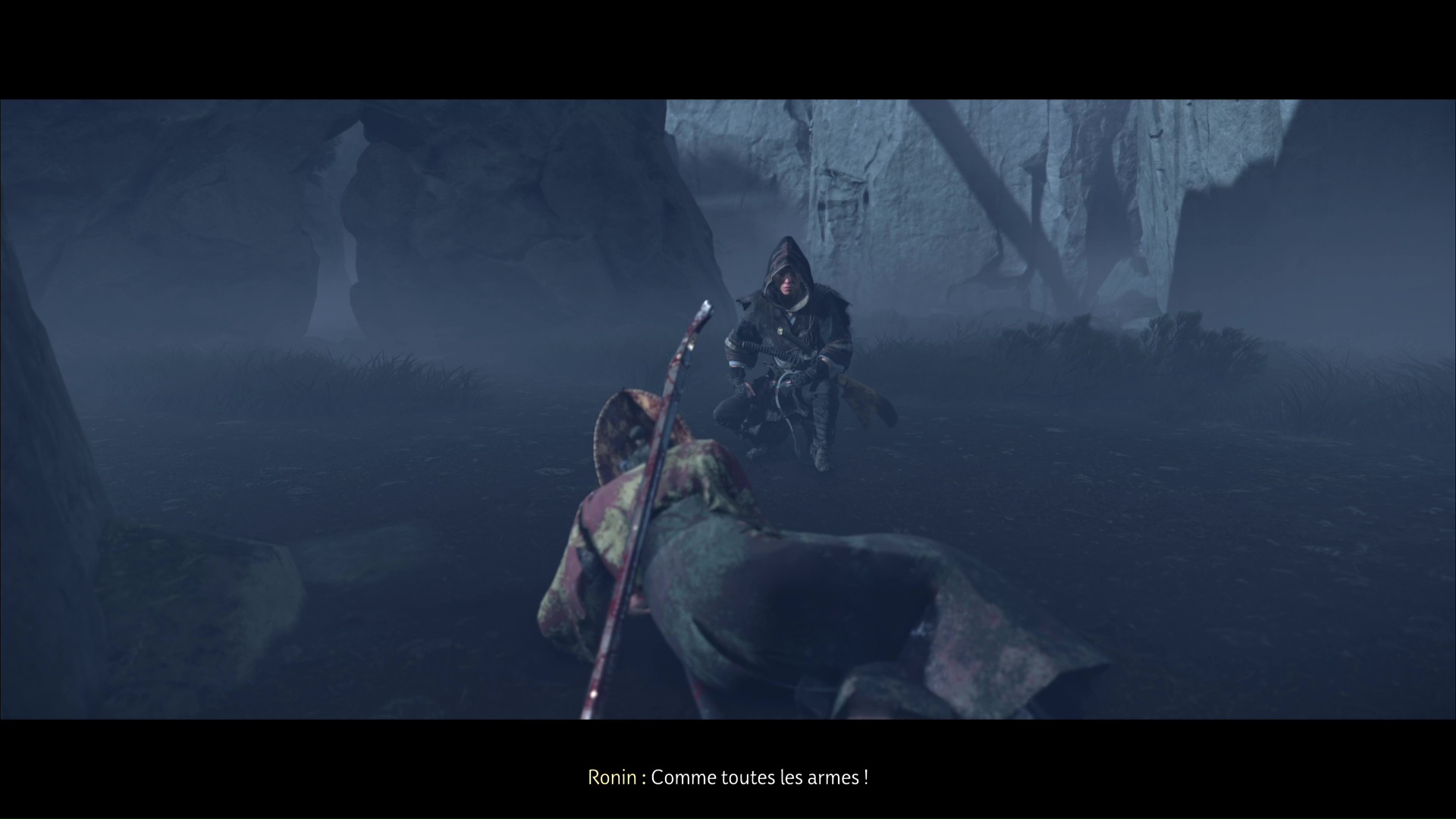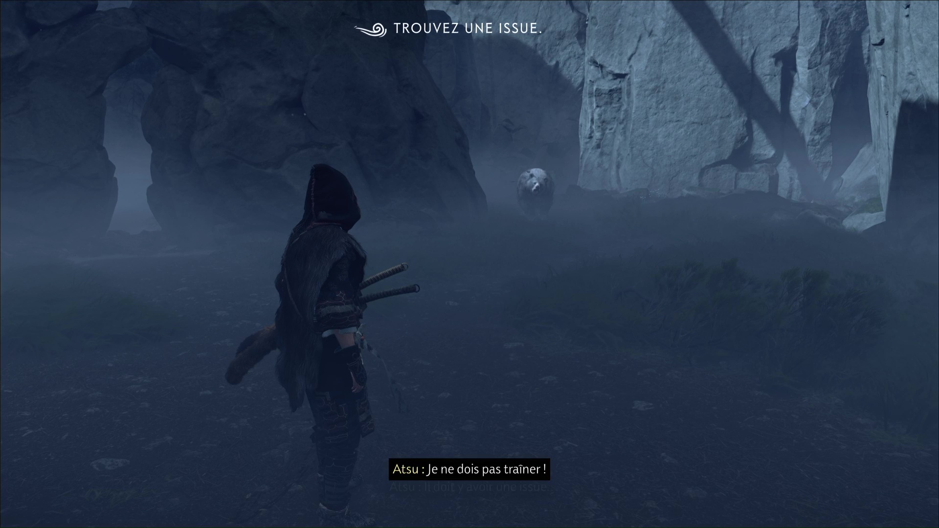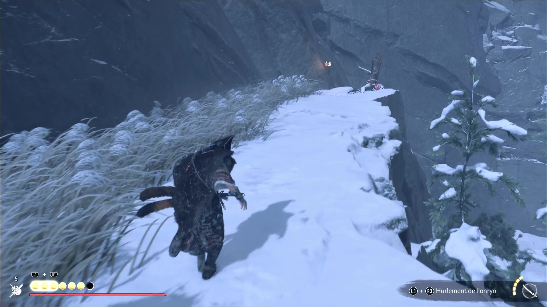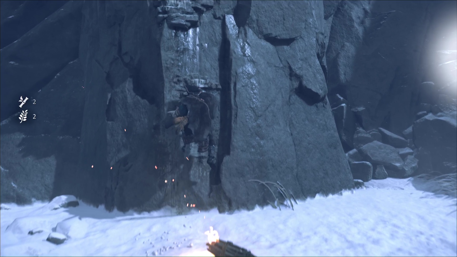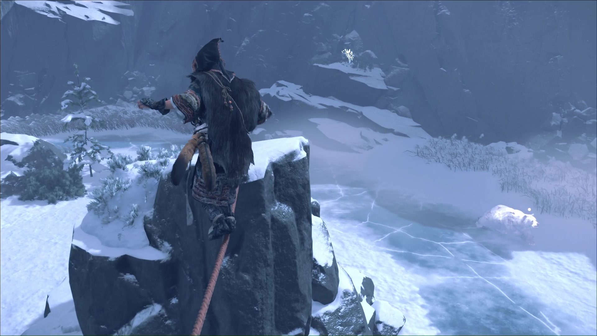Ô surprise, d’autres prises rocheuses vous attendent pour continuer à prendre de la hauteur. Et une fois en haut, retournez-vous puis sautez sur la plateforme en face. Continuez et vous retrouverez l’aïnou du début de l’ascension. Il vous apprend que seule la flèche d’okikurmi peut vaincre l’ours, et qu’elle se trouve au milieu d’armoises.