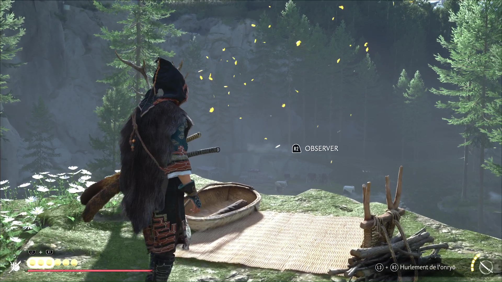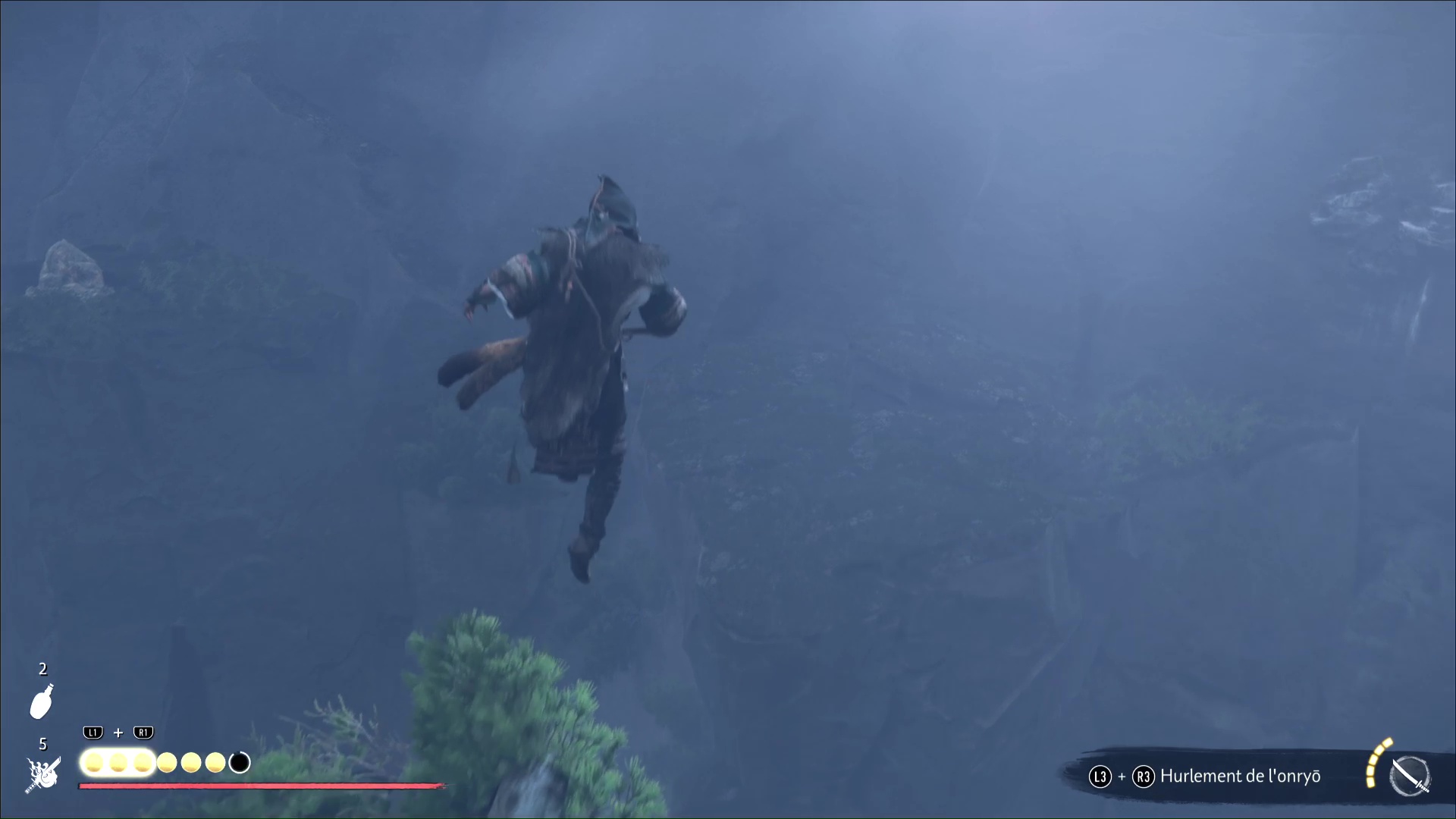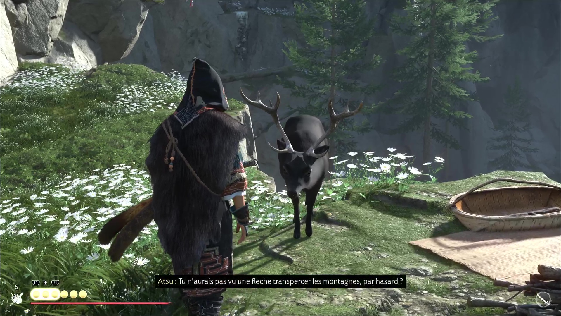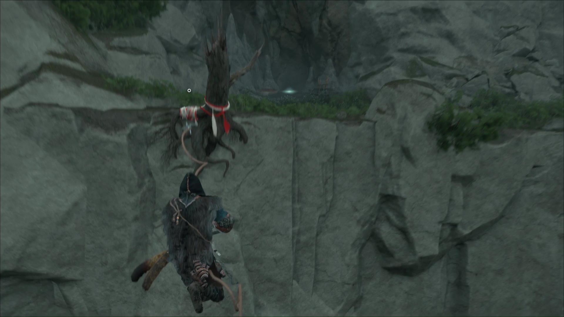 Visez le trou dans la montagne pour qu’Atsu fasse une remarque, puis suivez le cerf. Vous voici devant une branche à laquelle vous pouvez vous accrocher grâce au grappin. Sautez et atterrissez sur un arbre mort.