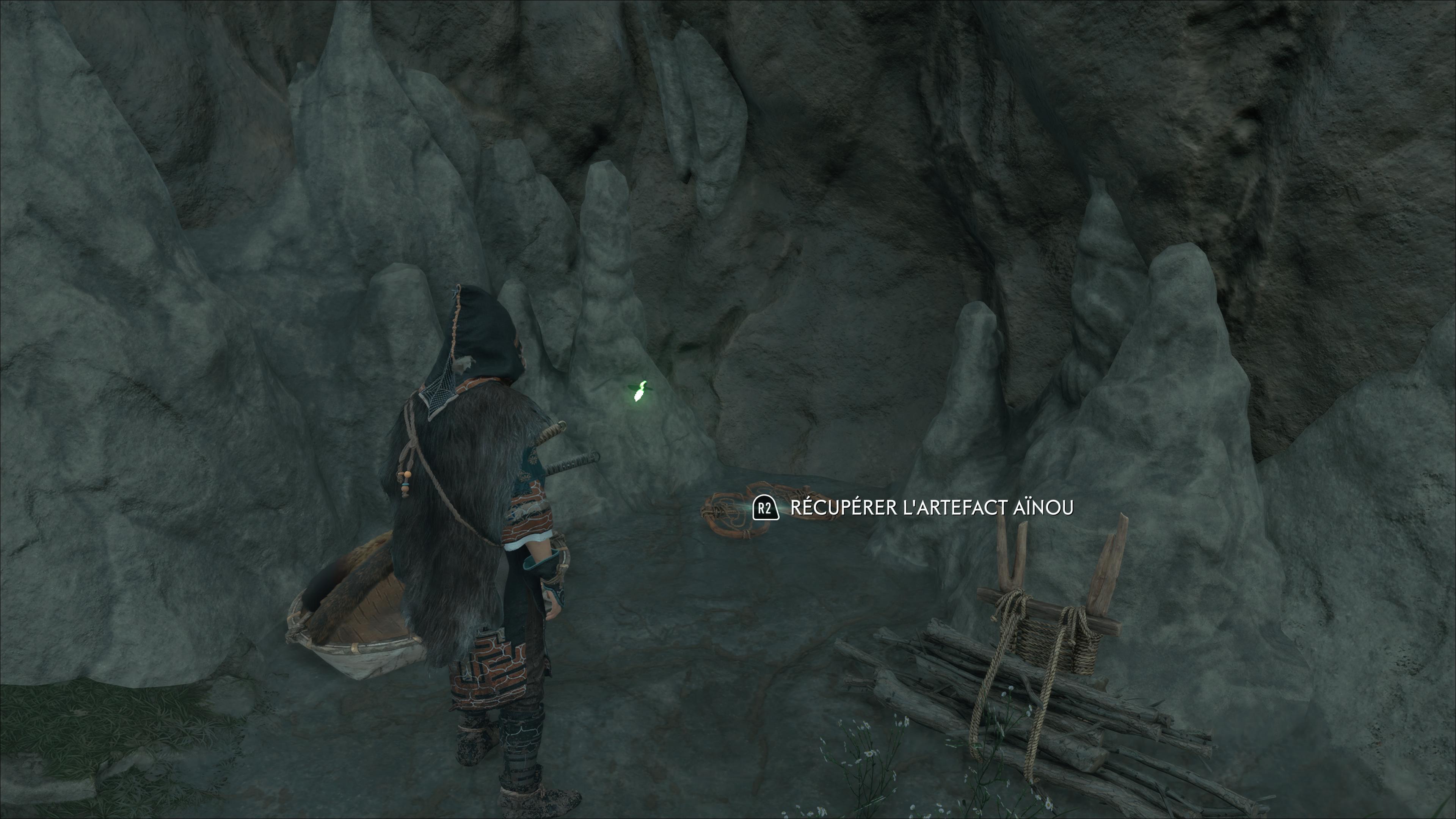 Tout d’abord, sautez en face. Une fois de l’autre côté, à gauche, l’artefact aïnou tesma vous attend. Pour le rejoindre, sautez puis sortez le grappin pour vous hisser grâce à un tronc.