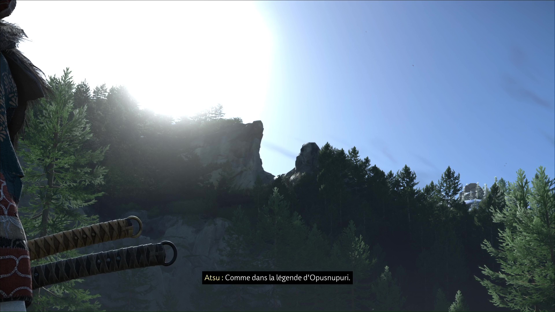 Parmi les légendes racontées sur l’île d’Ezo, le peuple aïnou possède aussi les siennes. Dans les Terres sauvages de Nayoro, Atsu peut entendre l’histoire d’une flèche géante tirée par okikurmi et qui aurait transpercé la montagne elle-même durant un concours d’archerie. Notre héroïne est donc intriguée par une telle flèche, et une nouvelle quête mythique de Ghost of Yōtei peut être suivie.