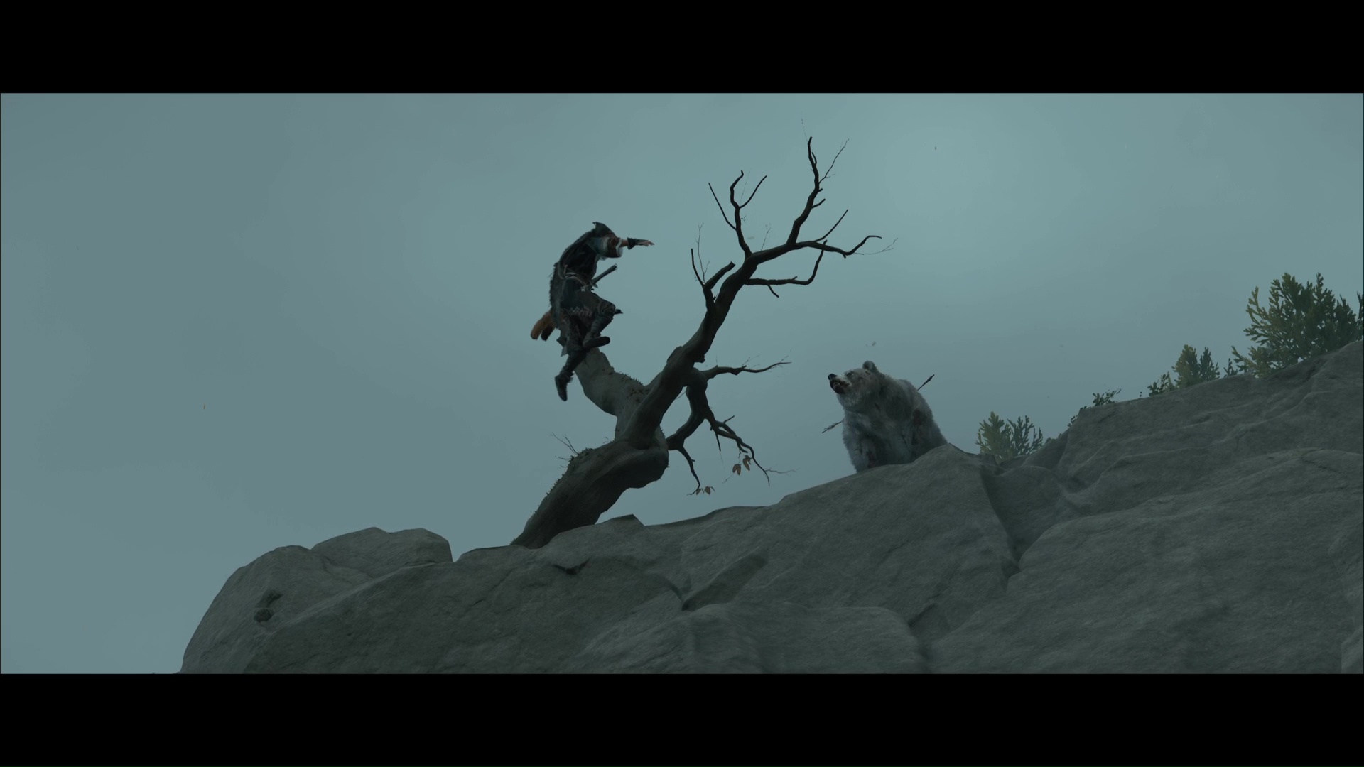 Une fois l’artefact ramassé, continuez le long du chemin et examinez le feu éteint puis la tache de sang. Un ours va alors débarquer pour vous jeter du haut de la falaise.