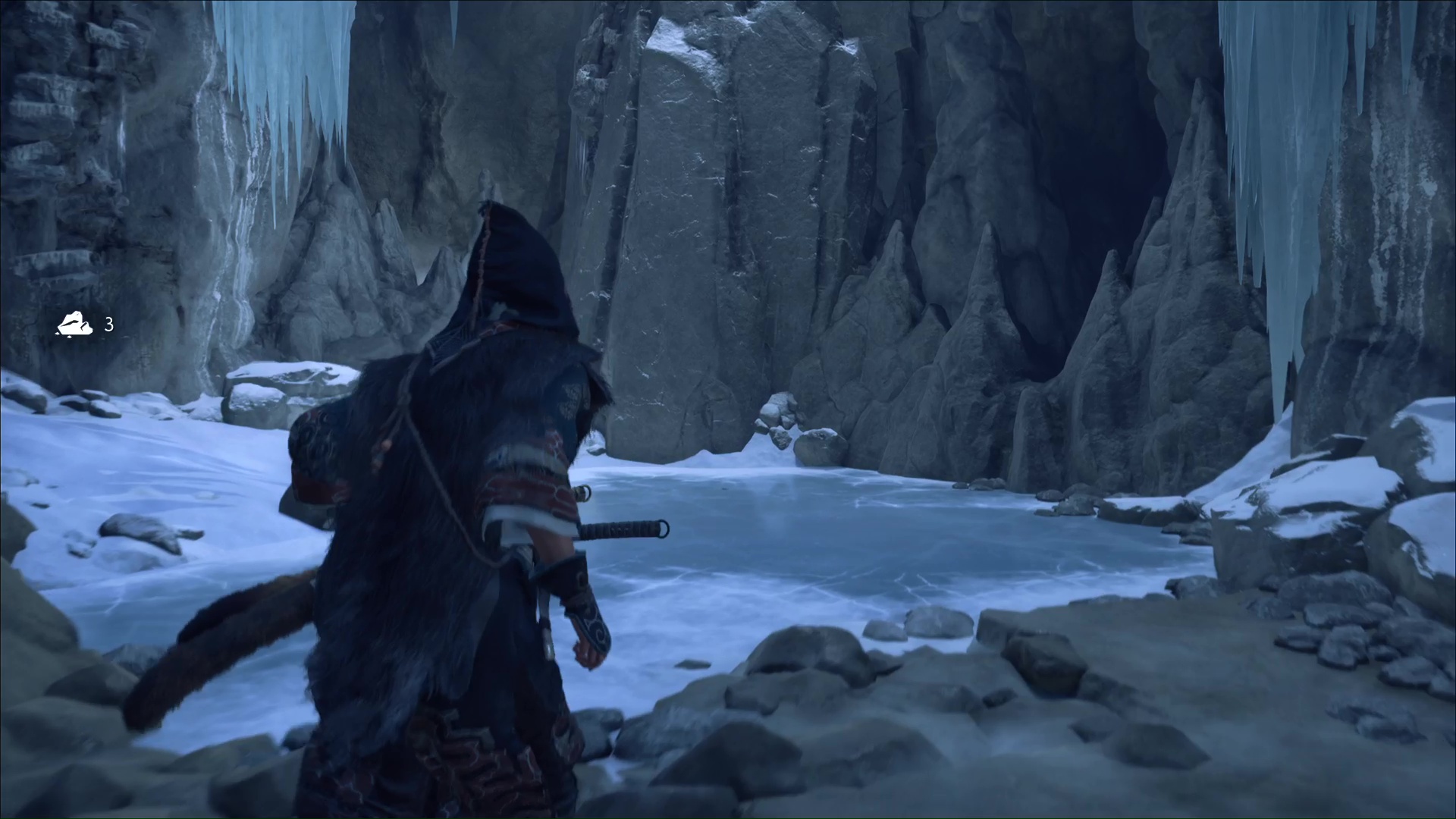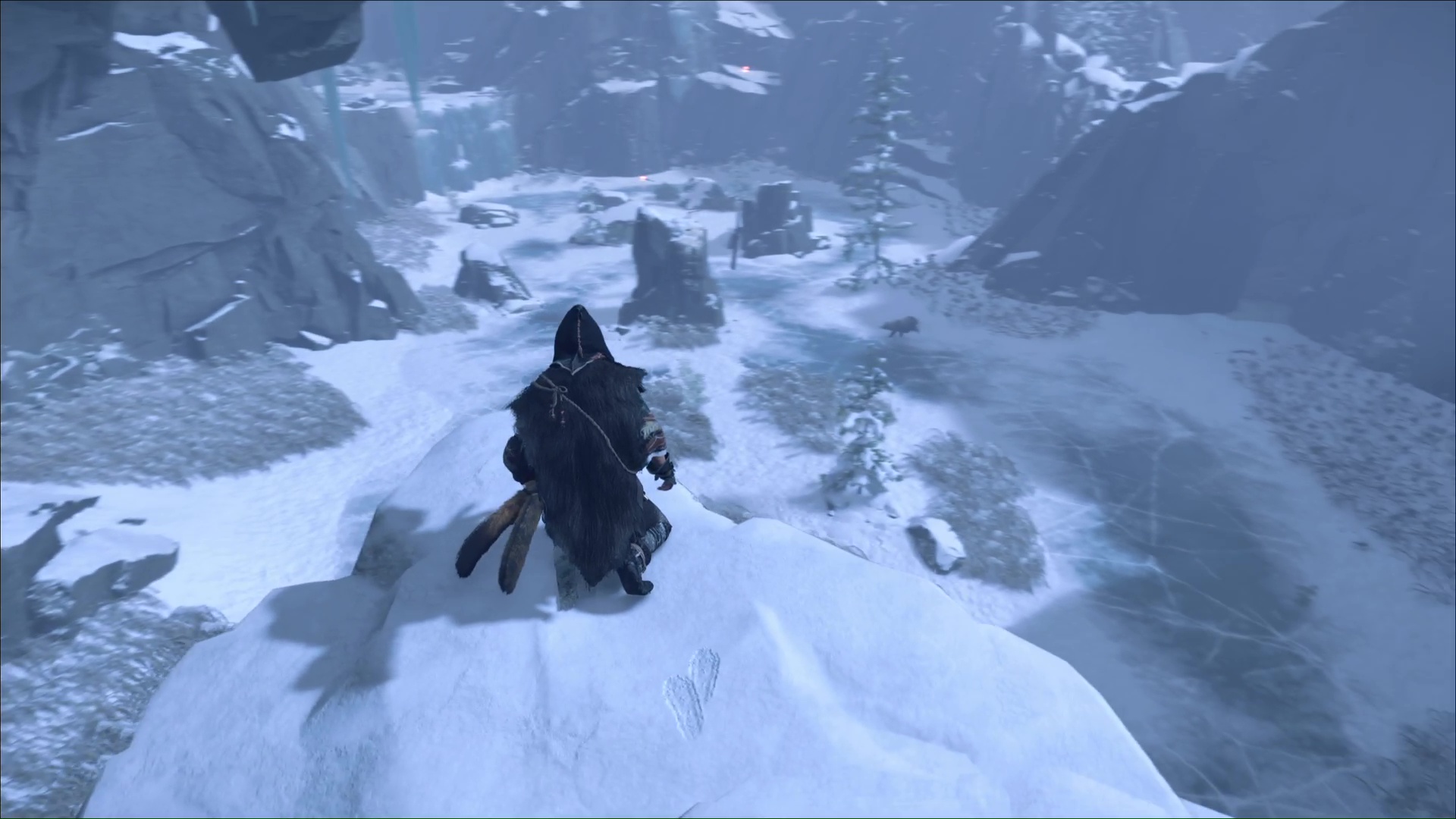 Une fois hissé, montez le chemin qui mène à une grotte. Un peu plus loin, vous verrez des prises rocheuses. Grimpez et avancez jusqu’à arriver à une zone gelée.