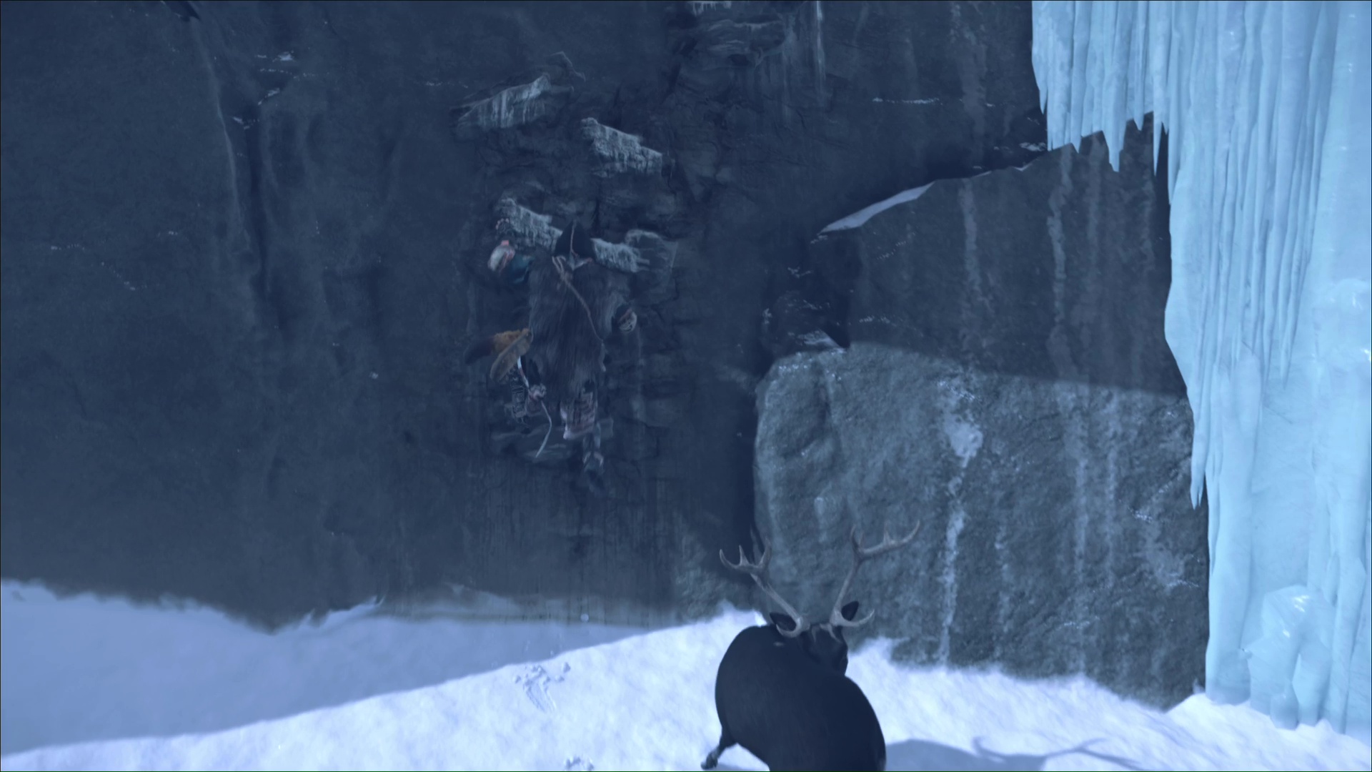 Allez examiner la flèche plantée dans le tronc : vous pouvez désormais tuer l’ours. Passez derrière l’arbre et escaladez la paroi à gauche de la cascade gelée.