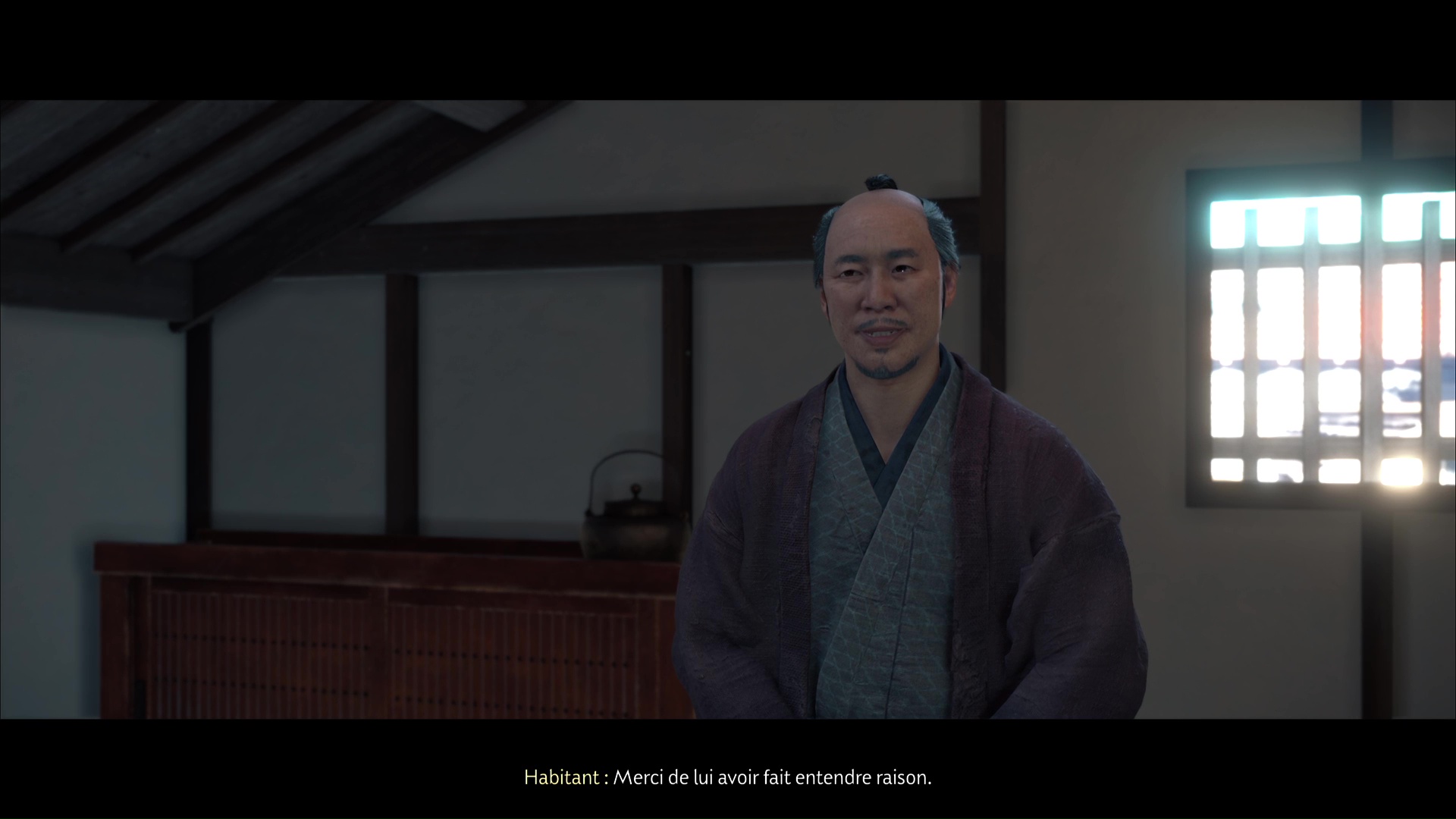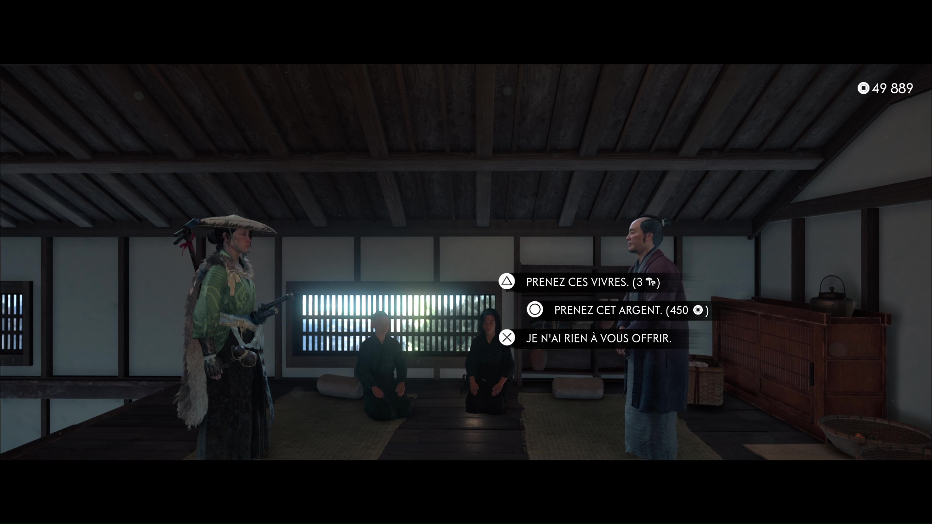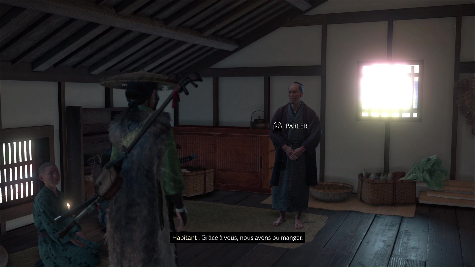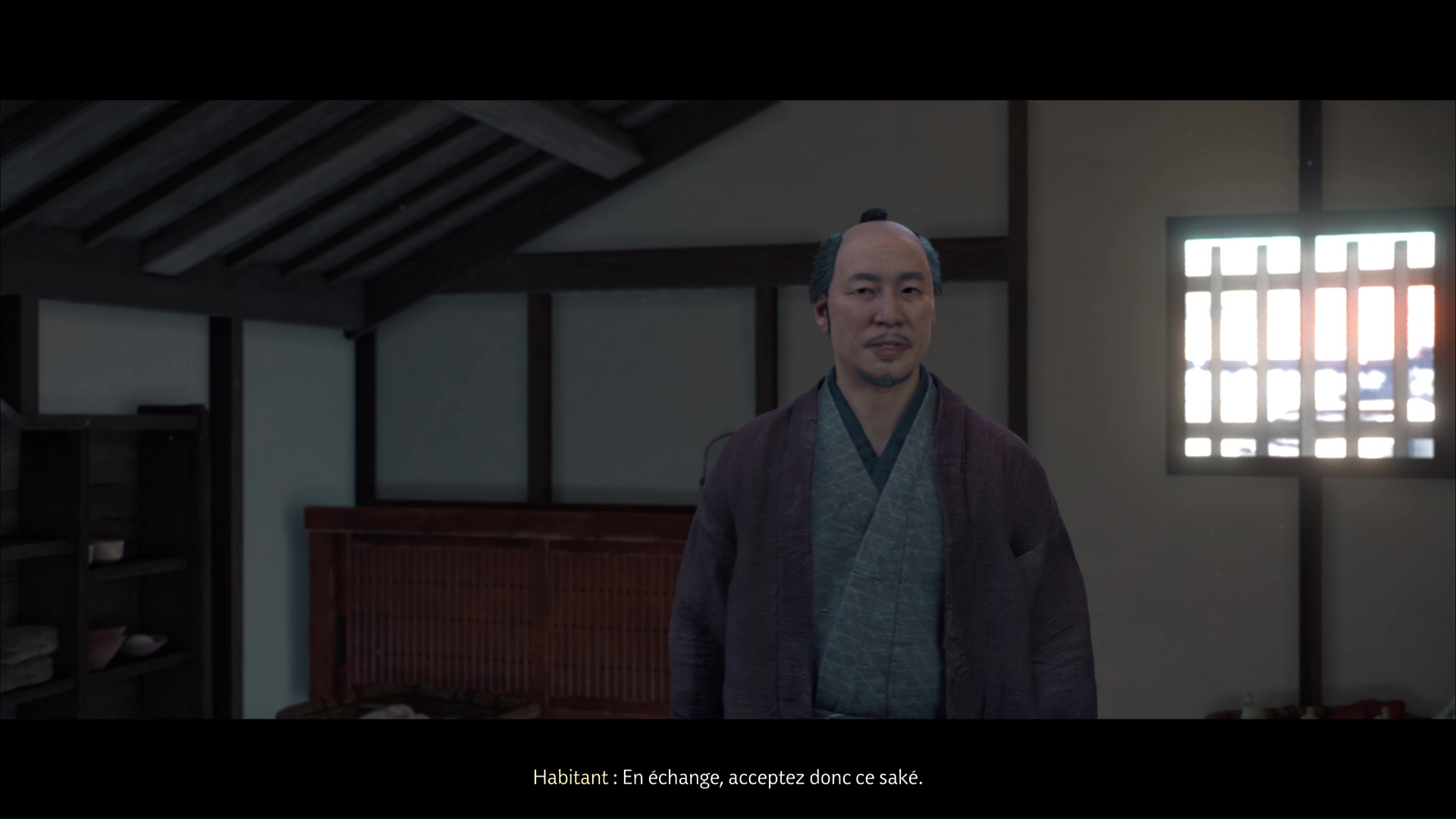 Il vous informe que Masa s’est remis sur le droit chemin et vous remercie d’avoir participé à ce changement. Ensuite, il est possible de leur offrir d’autres vivres ou 750 pièces. Faites preuve de bonté et le père vous offrira une bouteille de saké, s’il vous reste de la place.