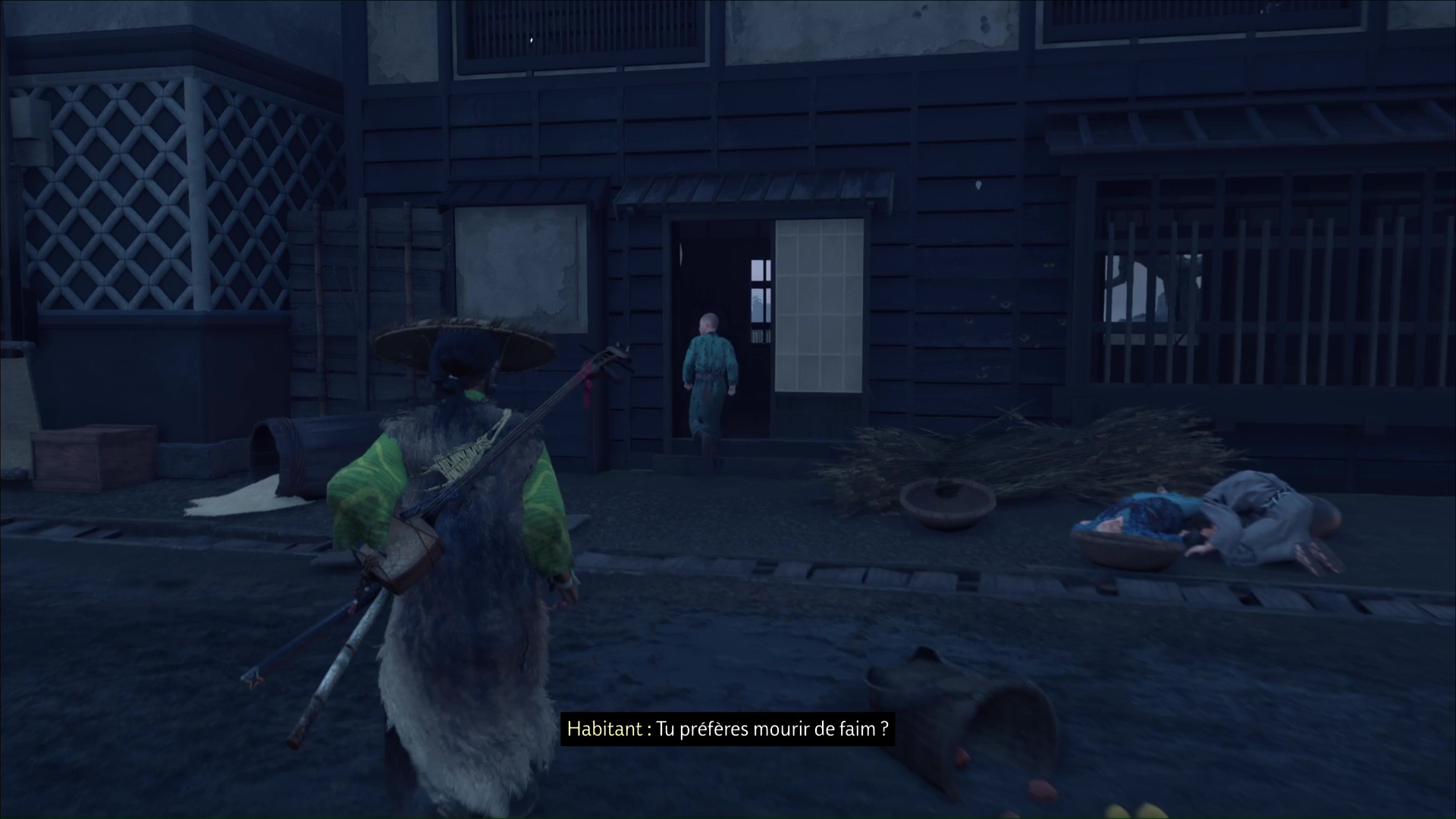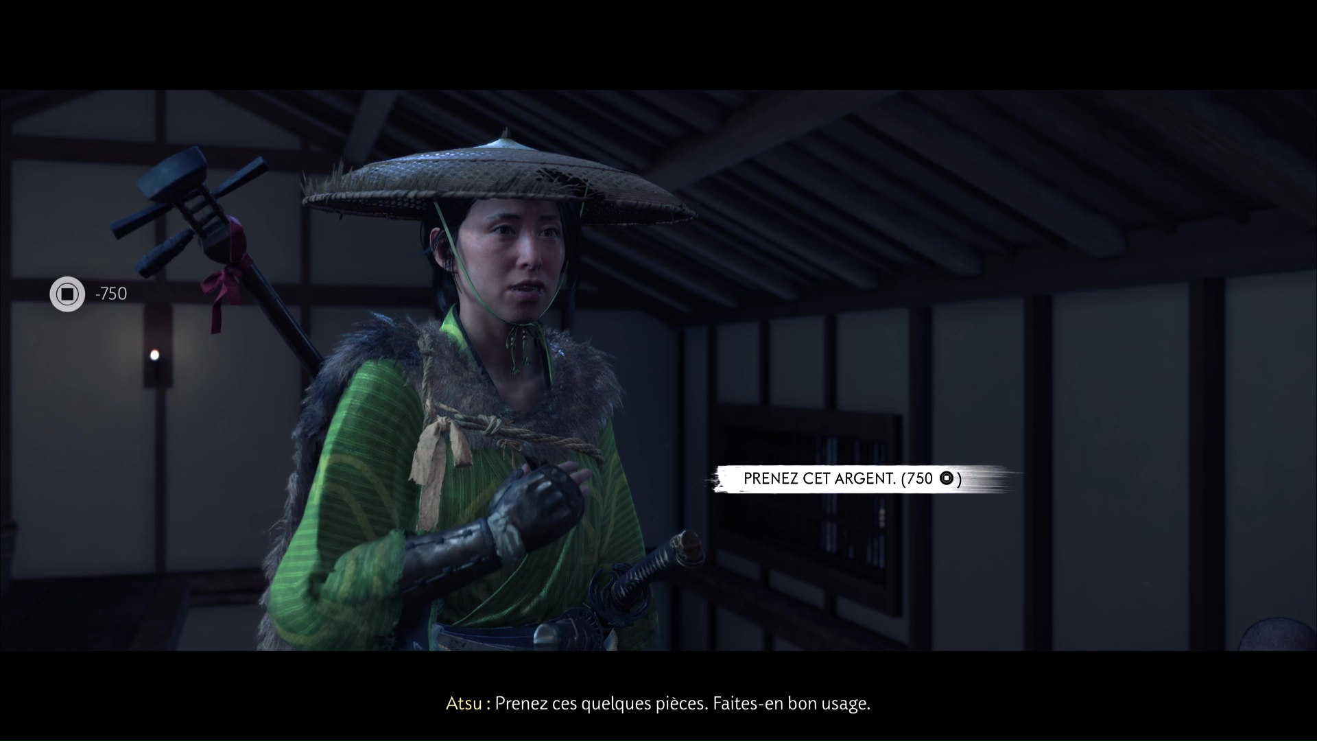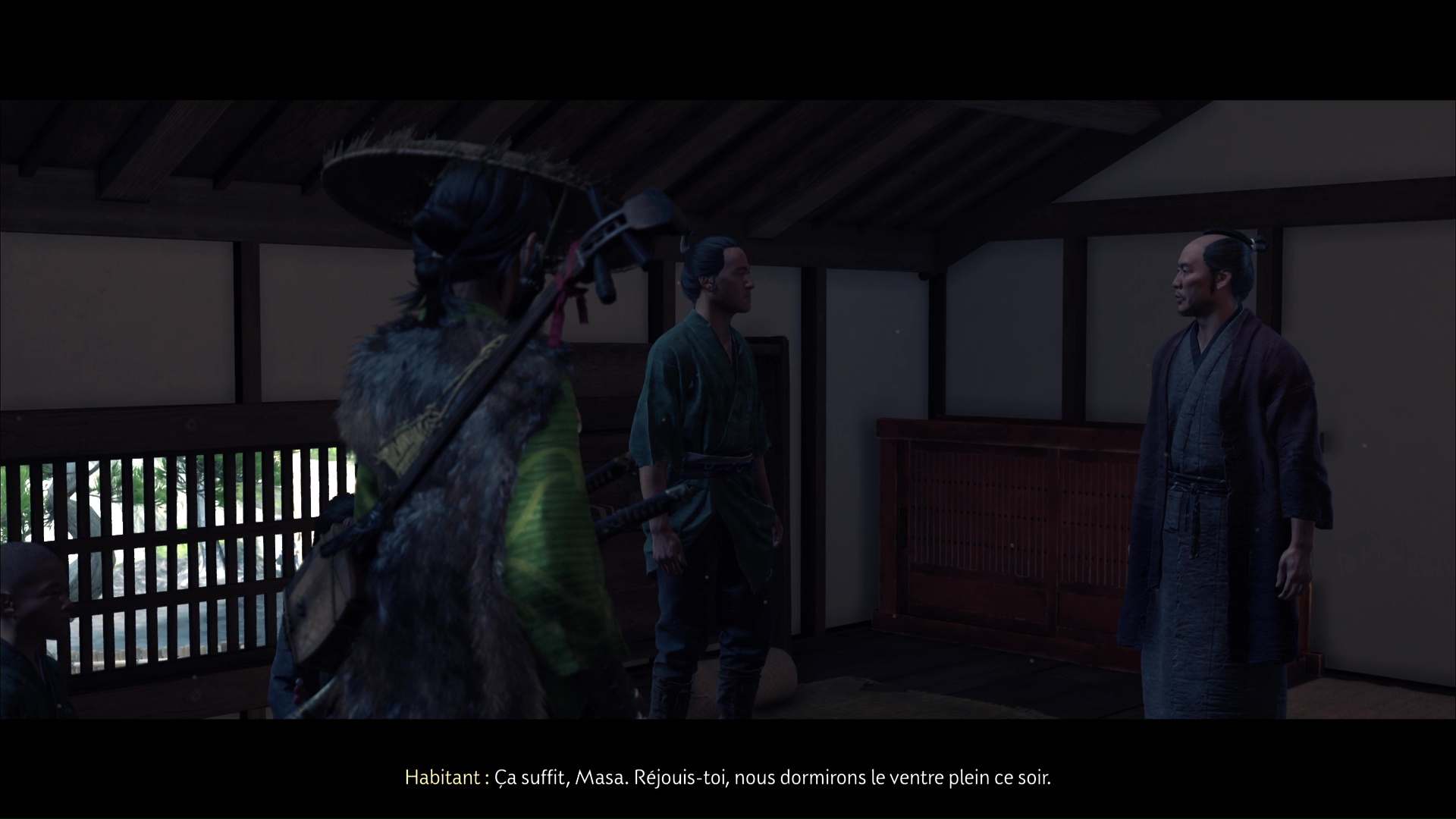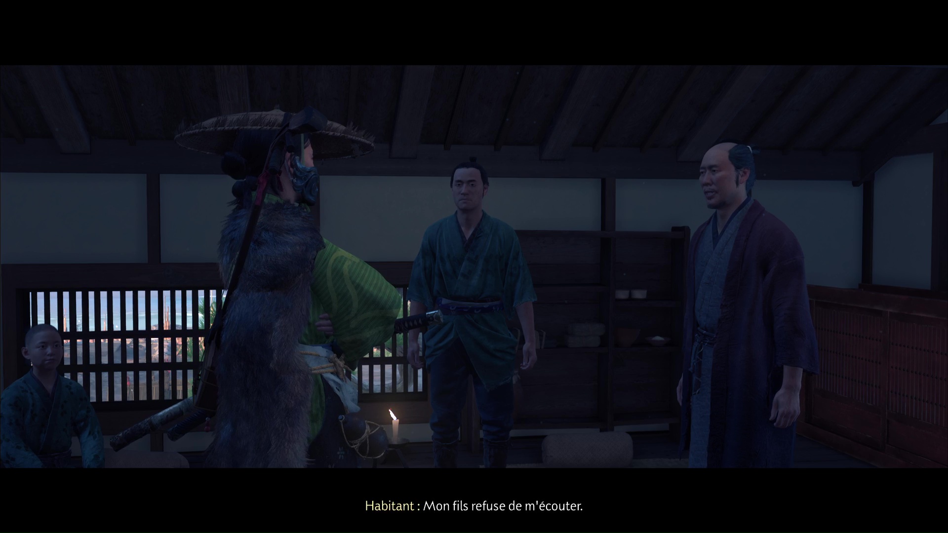 Il vous informe que Masa s’est remis sur le droit chemin et vous remercie d’avoir participé à ce changement. Ensuite, il est possible de leur offrir d’autres vivres ou 750 pièces. Faites preuve de bonté et le père vous offrira une bouteille de saké, s’il vous reste de la place.