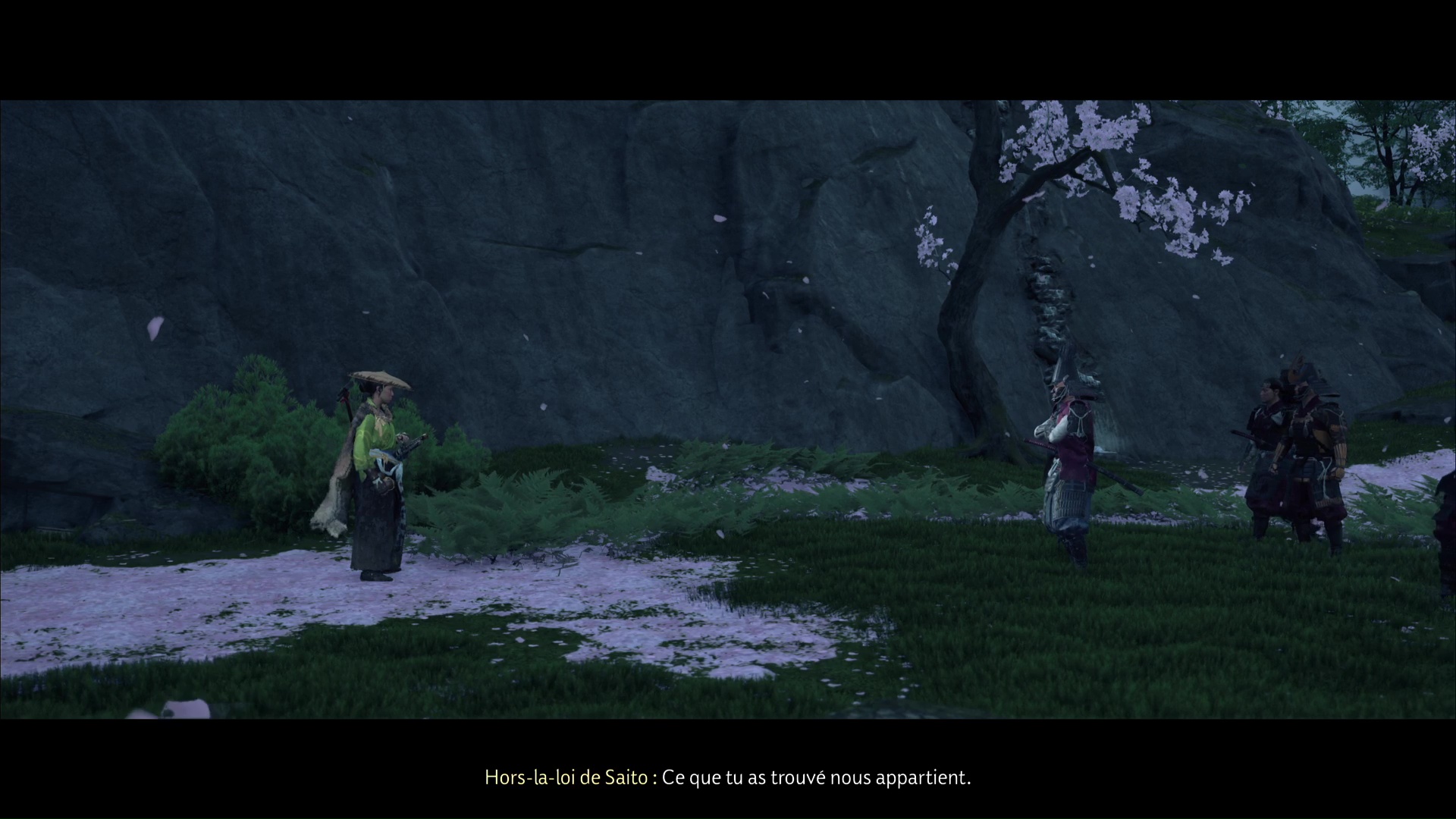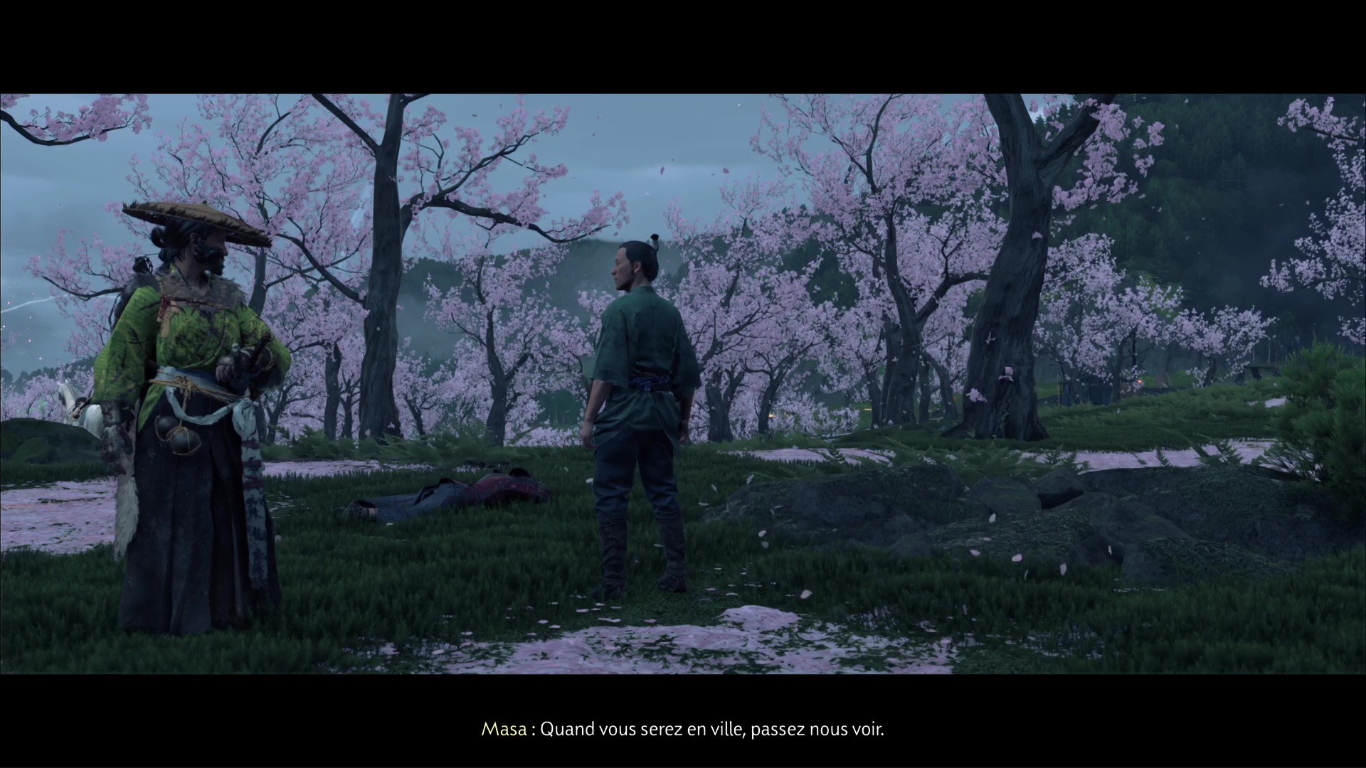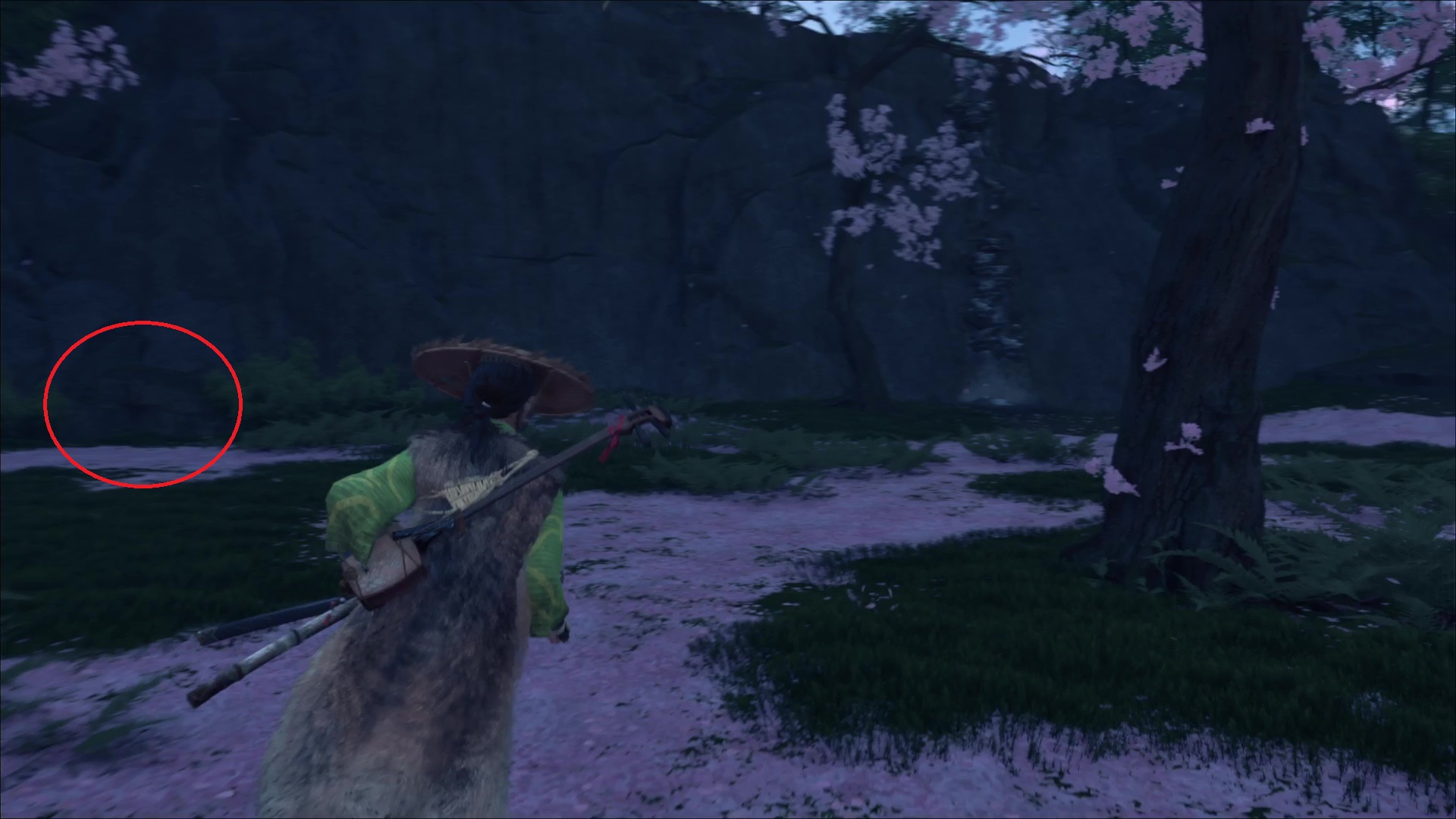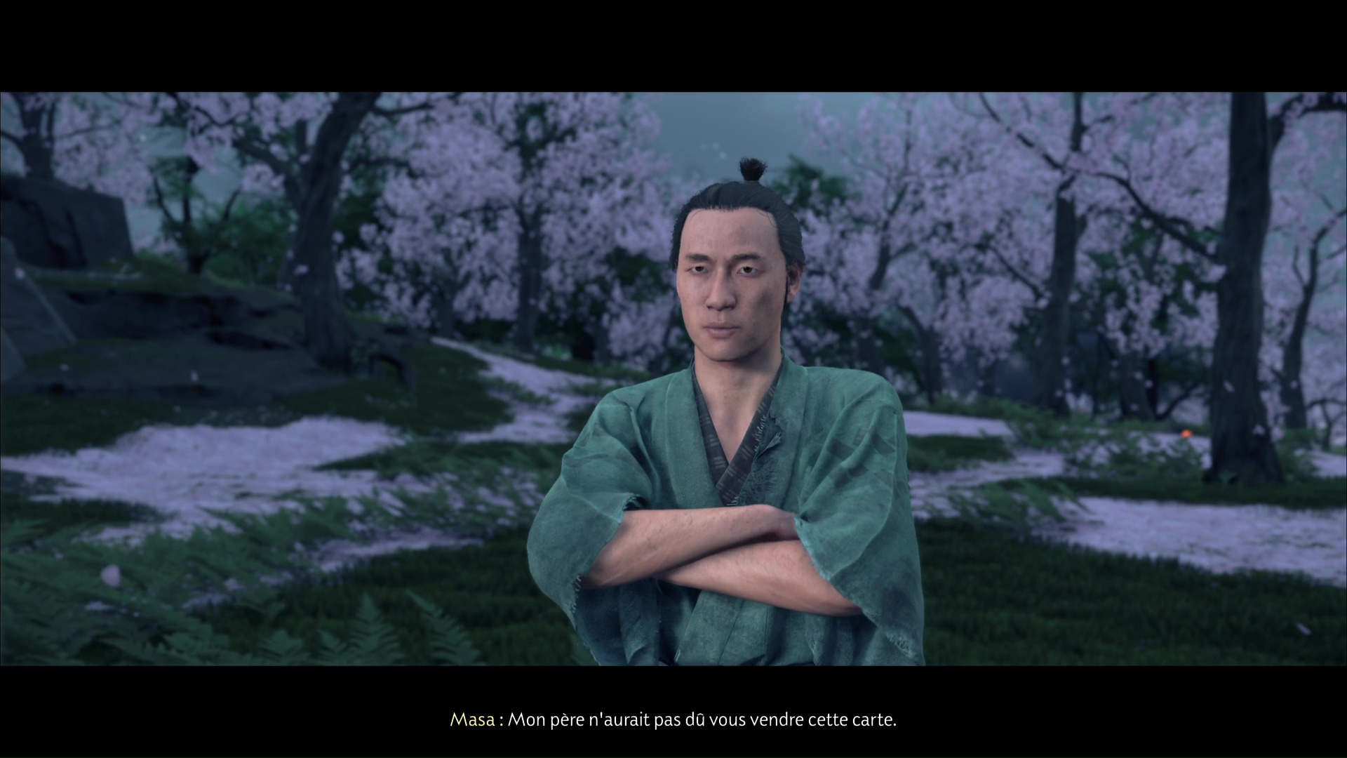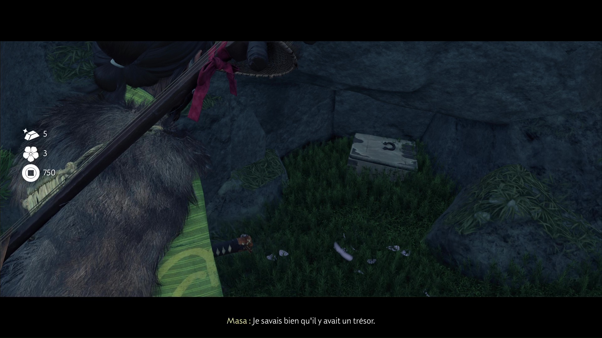 Allez ensuite au nord, dans la zone du trésor, et cherchez une paroi rocheuse qu’il est possible d’escalader, tout près des cerisiers. À gauche de cette paroi, longez la falaise pour trouver, au milieu de deux buissons, une cachette. C’est là que se trouve le coffre. Fouillez-le pour obtenir 750 pièces, 3 fleurs et 5 métaux rares. Soudain, Masa débarque derrière vous.