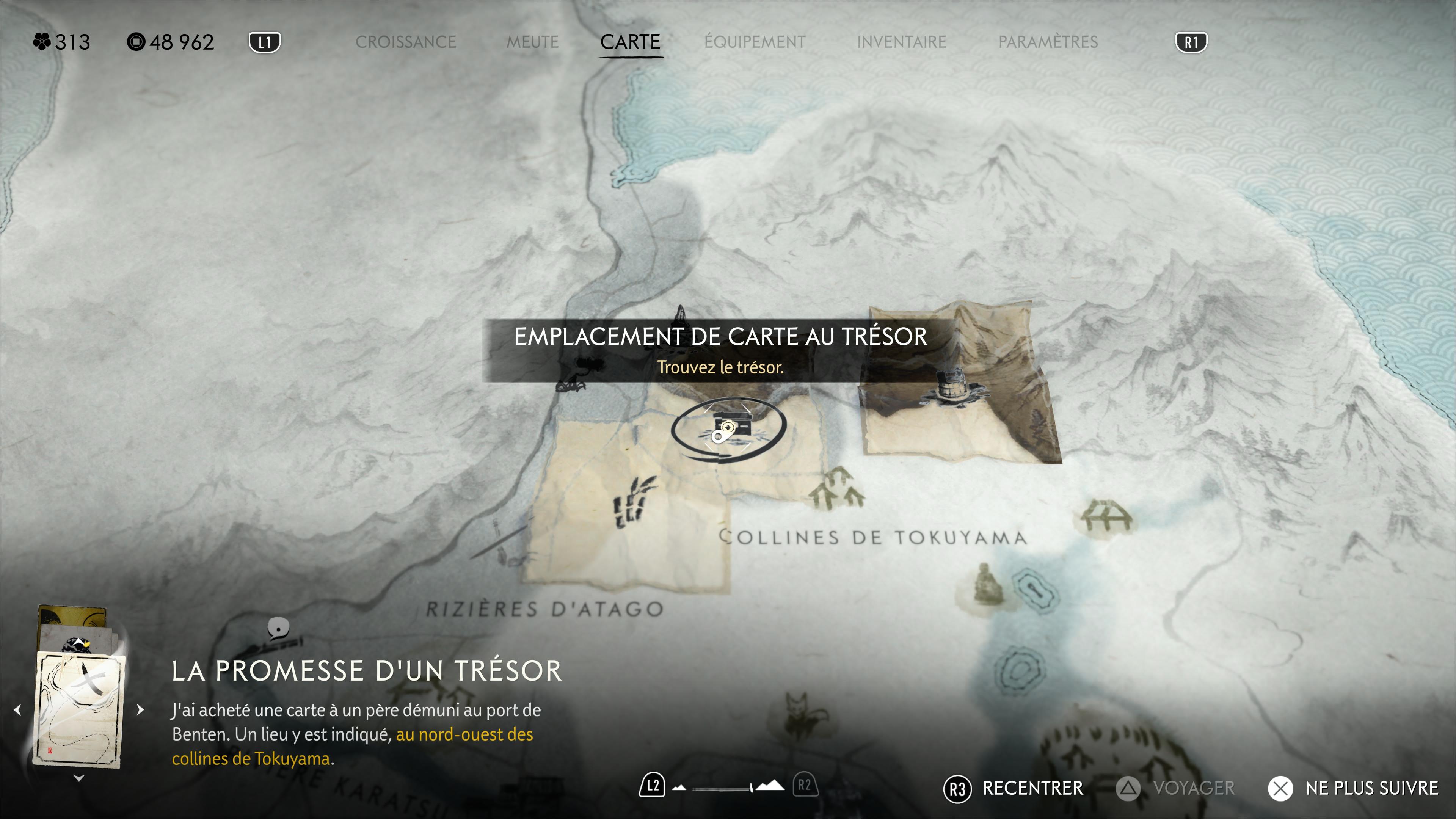 Le père vous demande alors si l’acheter vous intéresse. Acceptez en dépensant 750 pièces ou en donnant 5 champignons. Désormais en possession de la carte, allez donc tenter de mettre la main sur le trésor. Ouvrez votre carte et placez le fragment de carte du voyageur au nord, près de l’entrée de la région.