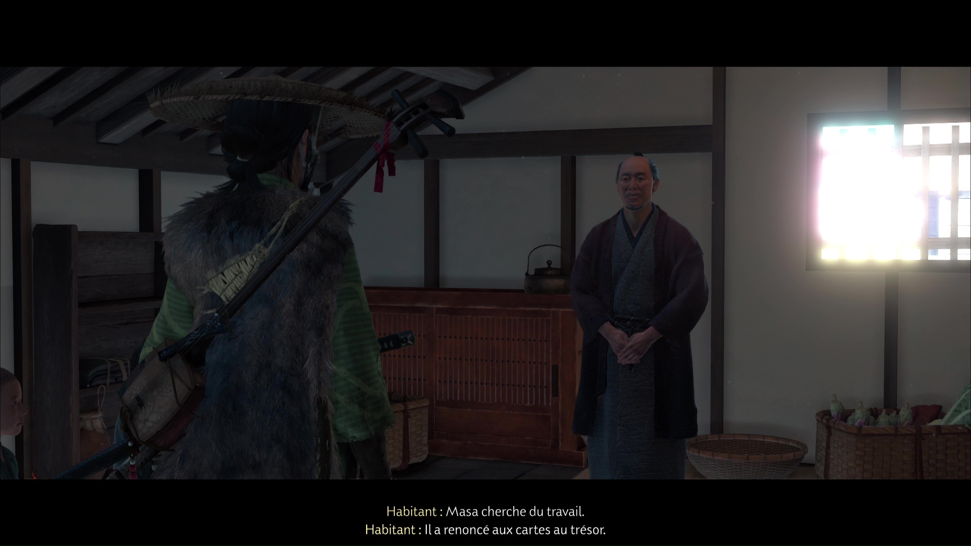Une fois le danger écarté, vous reparlez avec Masa. Dites-lui ce que vous voulez, en lui conseillant par exemple d’arrêter ces histoires de carte et d’aller trouver du travail en ville. Masa vous invite à revenir le voir lui et sa famille. Faites donc et parlez au père.