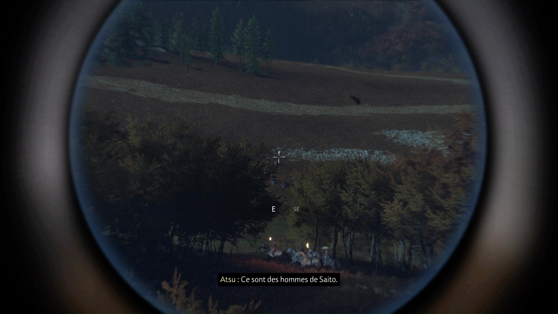 Levez-vous, sortez votre longue-vue et regardez les chevaux en contrebas, direction est-sud-est. Remontez ensuite vers l’est, pour apercevoir des marchands, à l’arrêt cette fois. Enfin, juste au-dessus, des hommes de Saito sont en position.
