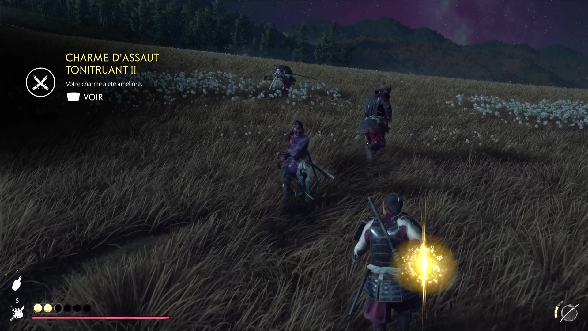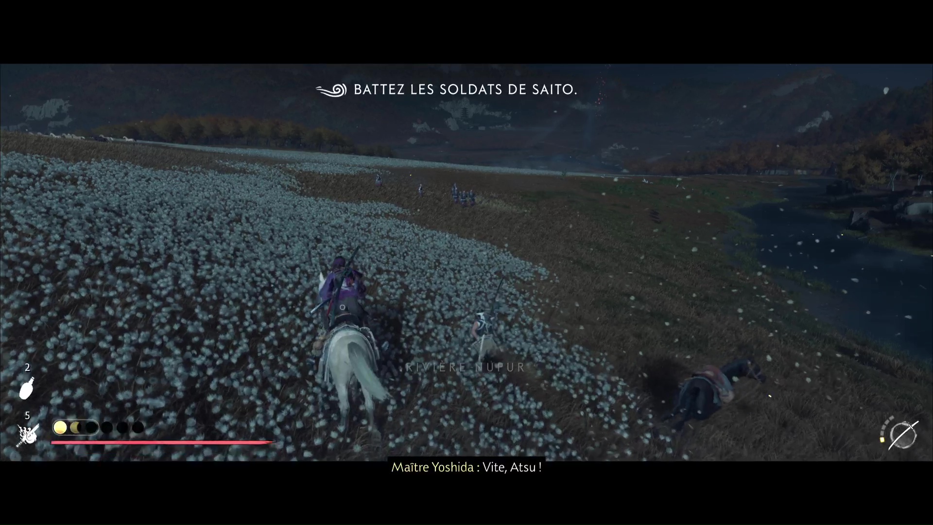 Les ennemis vont se mettre à exécuter des tirs de bō-hiya vers vous. Prenez vos jambes à votre cou, montez sur votre cheval et descendez la colline pour rejoindre vos assaillants.