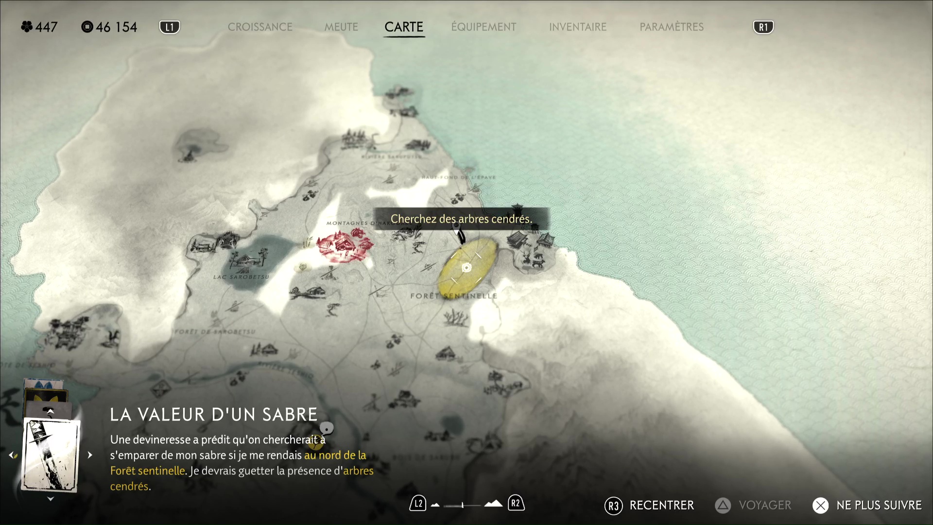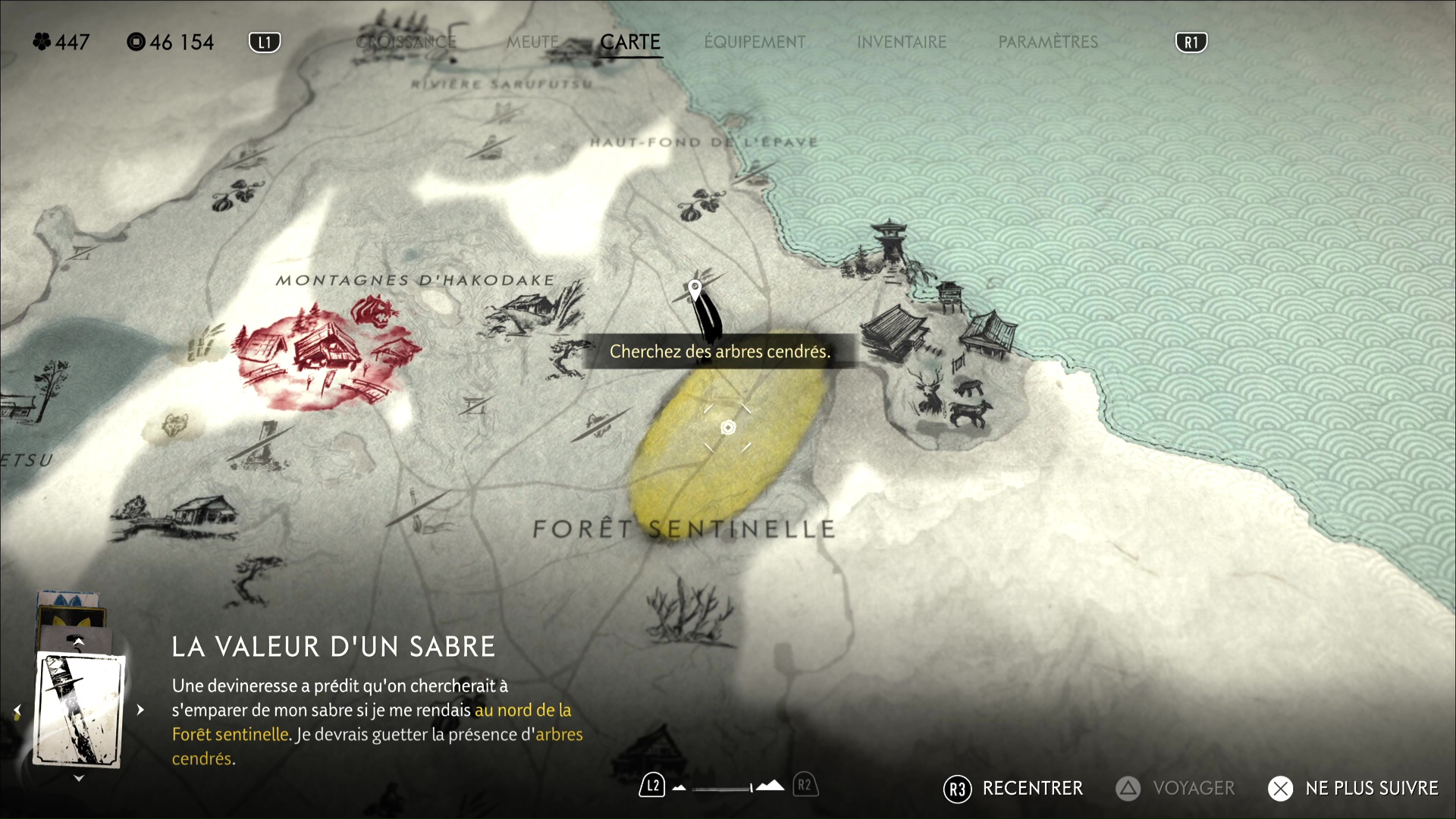 Accepter vous coûtera 200 pièces. Sortez ensuite votre katana et la voyante vous dira que quelqu’un le convoite. Ce quelqu’un, vous l’aurez compris, se trouve aux arbres cendrés. Peu importe le départ de votre quête, parlez à l’individu au feu de camp des arbres cendrés.