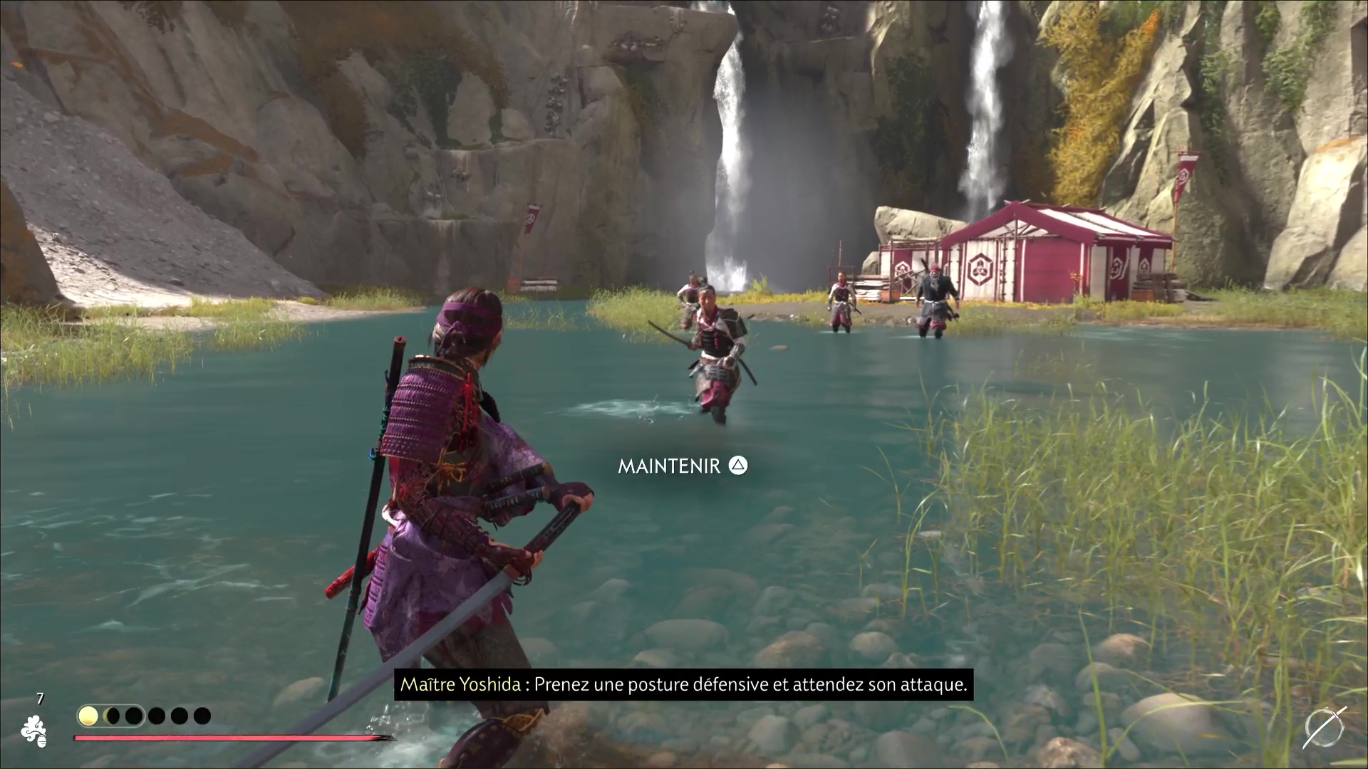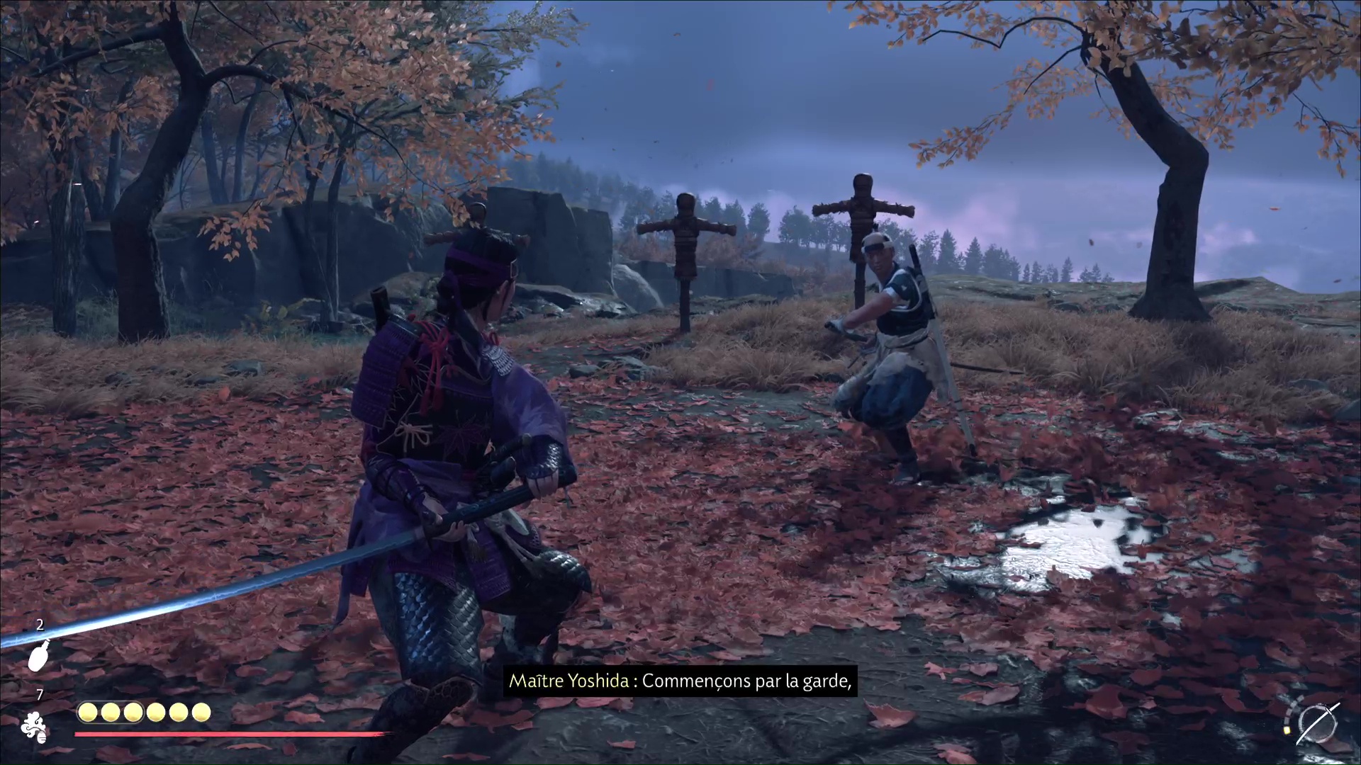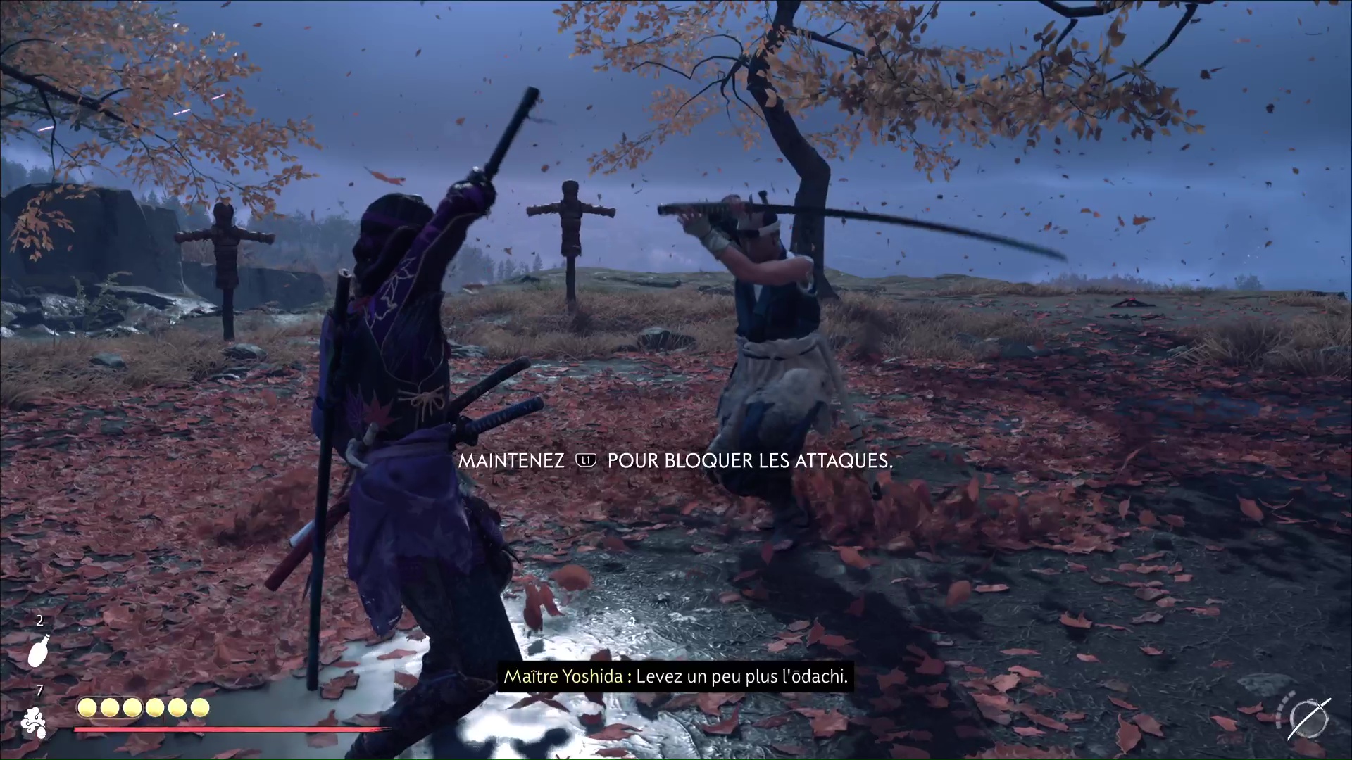 Vous commencez par la garde, et vous n’avez qu’à maintenir le bouton de garde comme pour n’importe quelle arme. Au bout de quelques coups, Yoshida vous demandera ensuite d’effectuer des frappes lourdes.