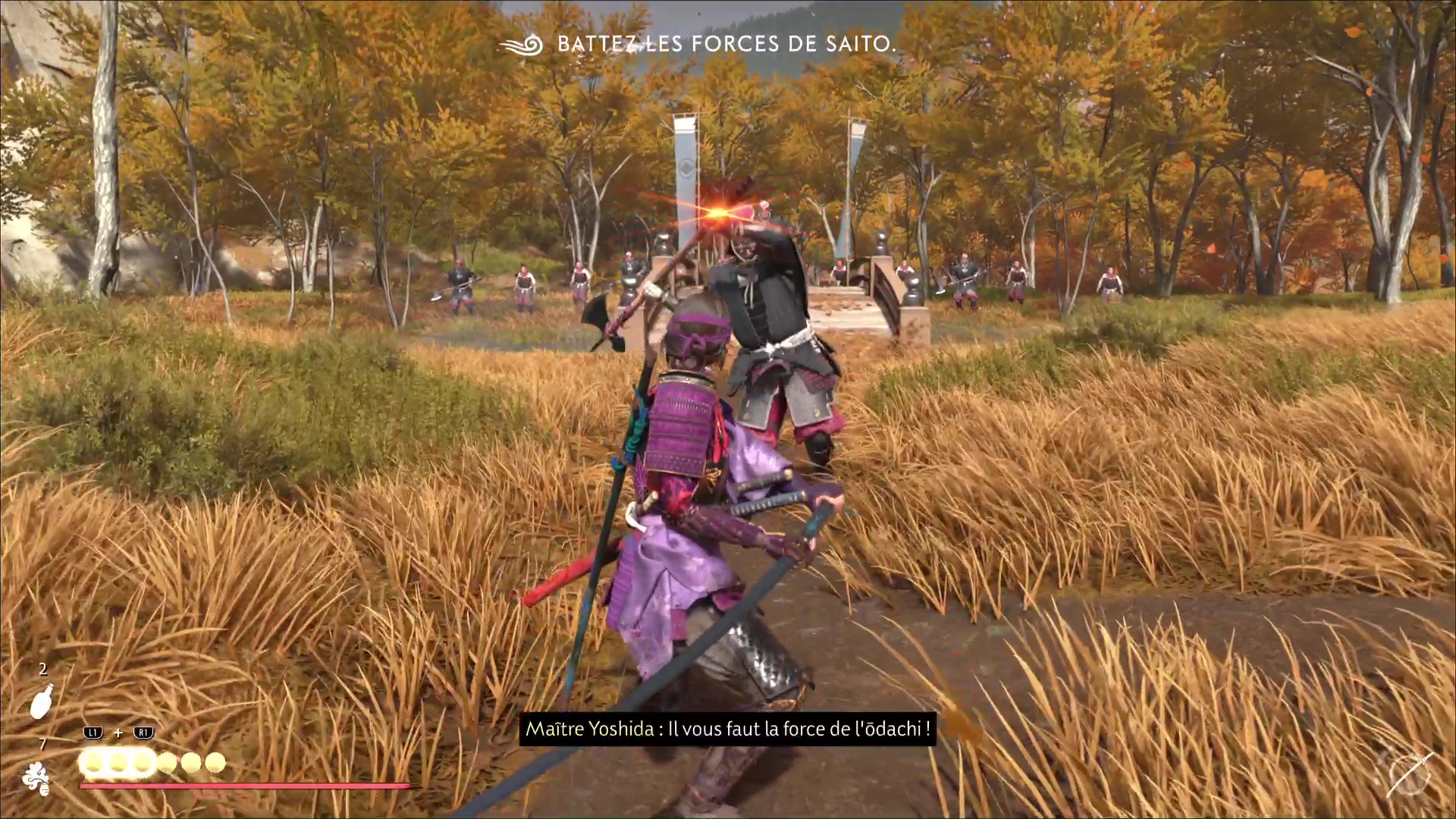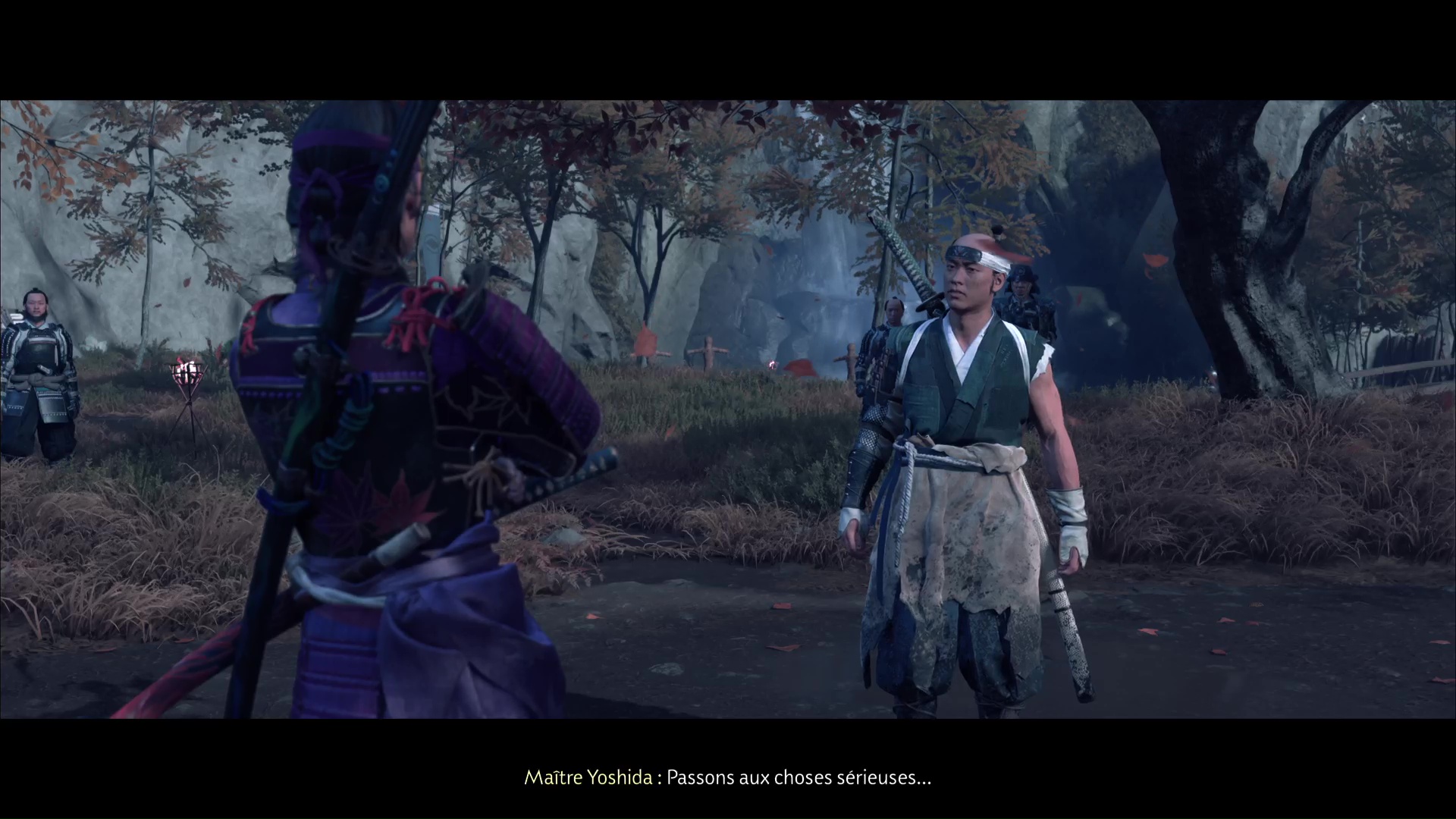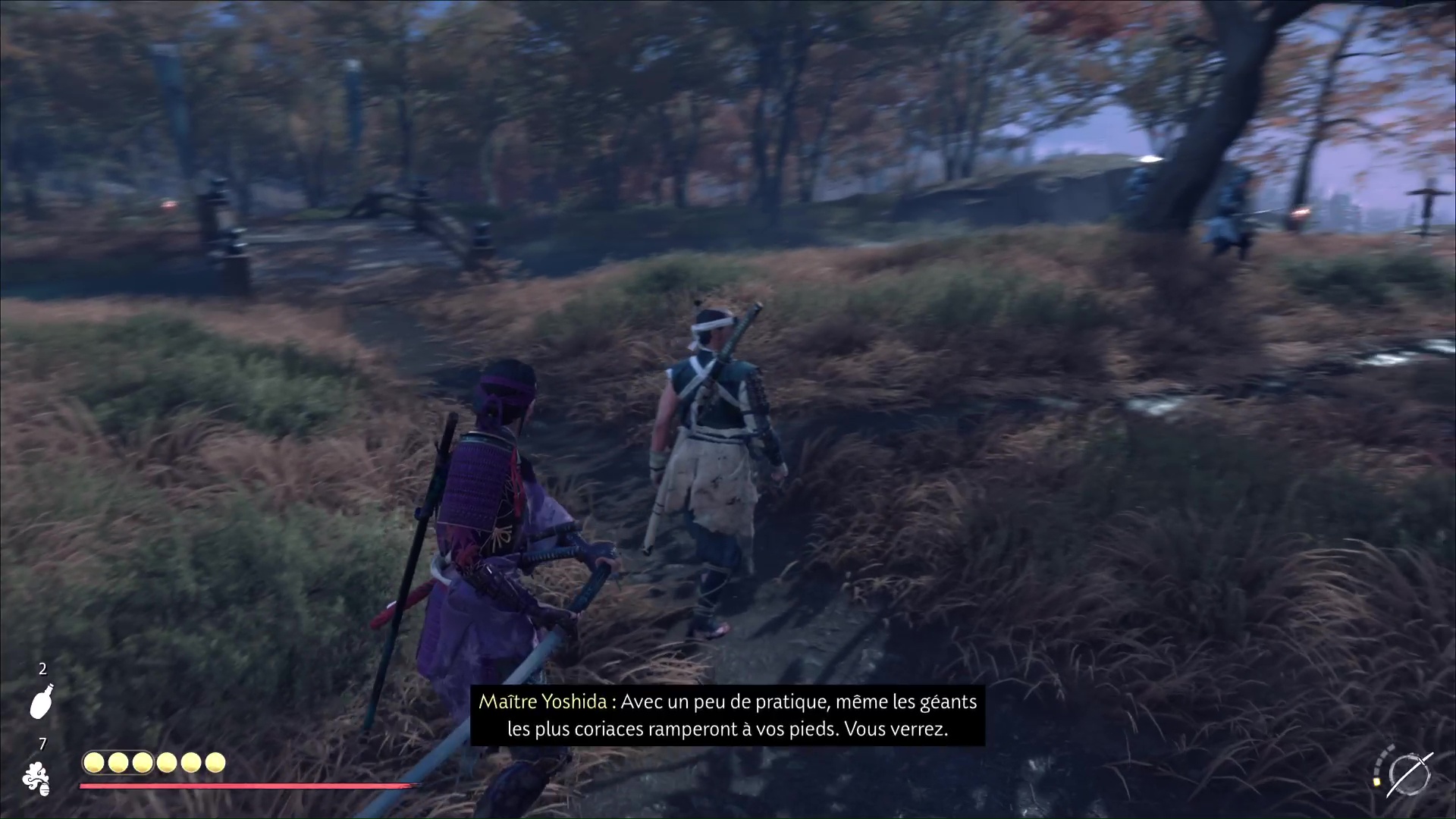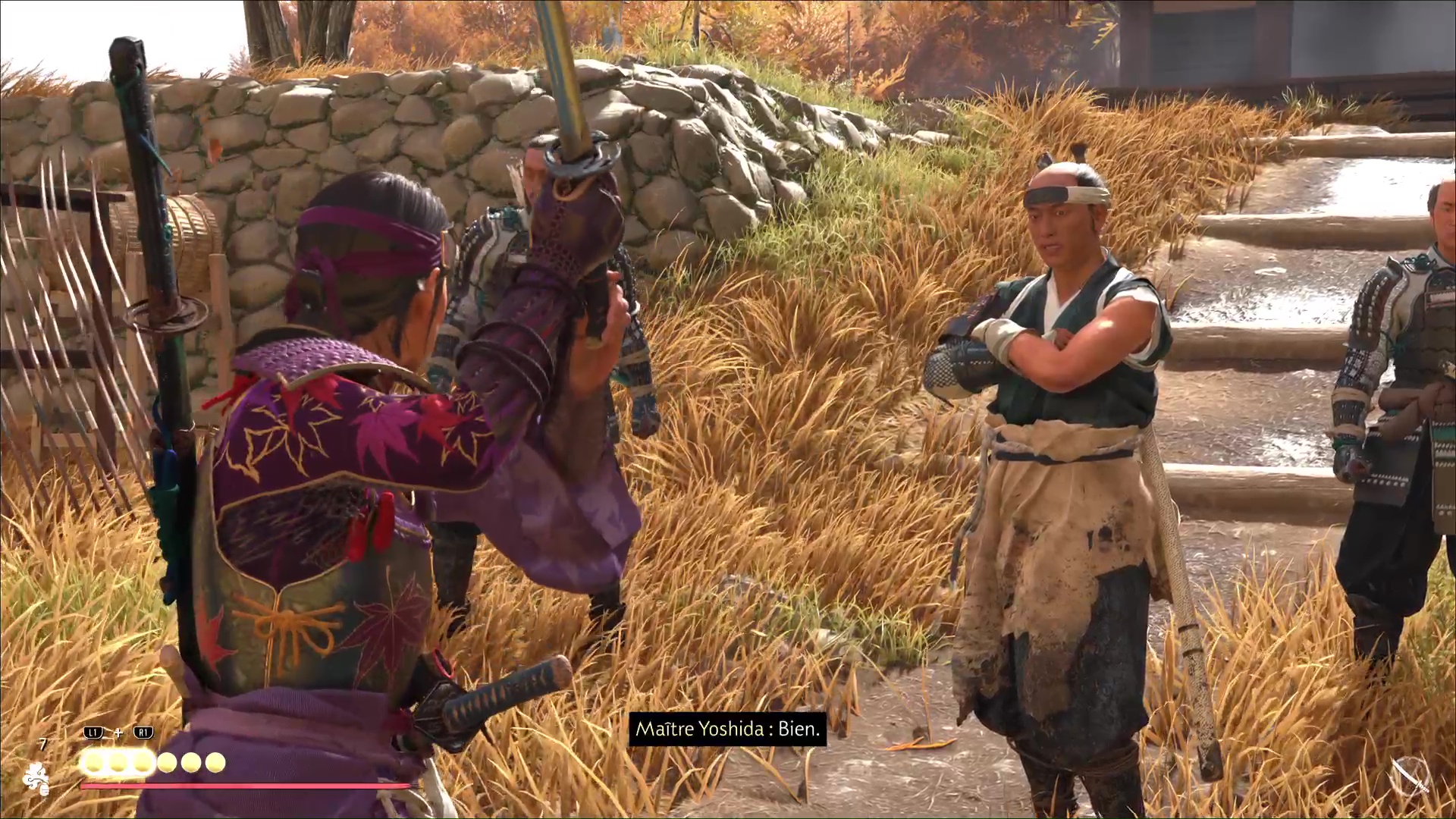 Une fois arrivé en haut, Yoshida vous met en garde : d’autres brigands de Saito vous attendent. Le maître en profite pour vous apprendre un nouveau mouvement que vous allez mettre en pratique immédiatement.