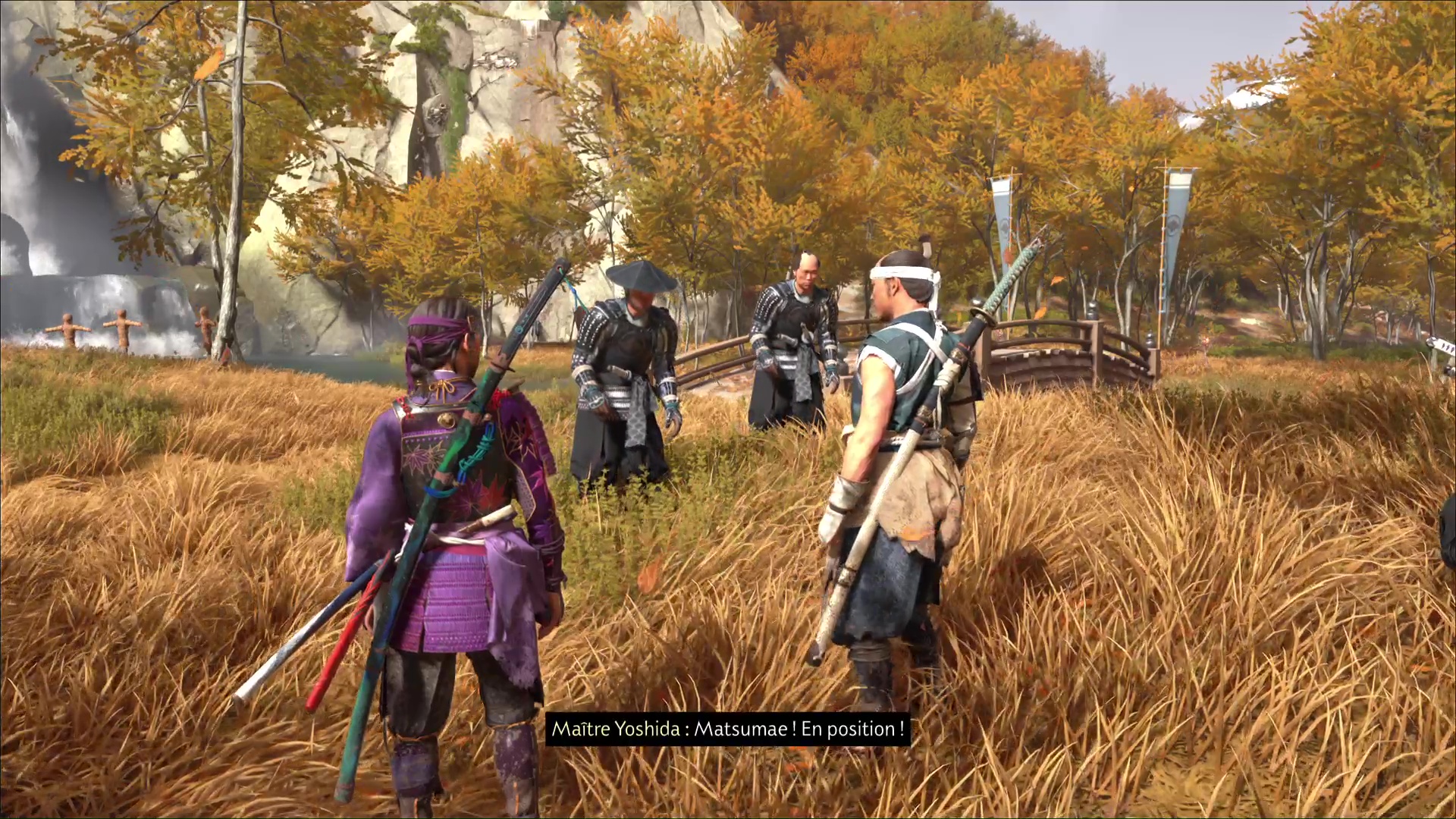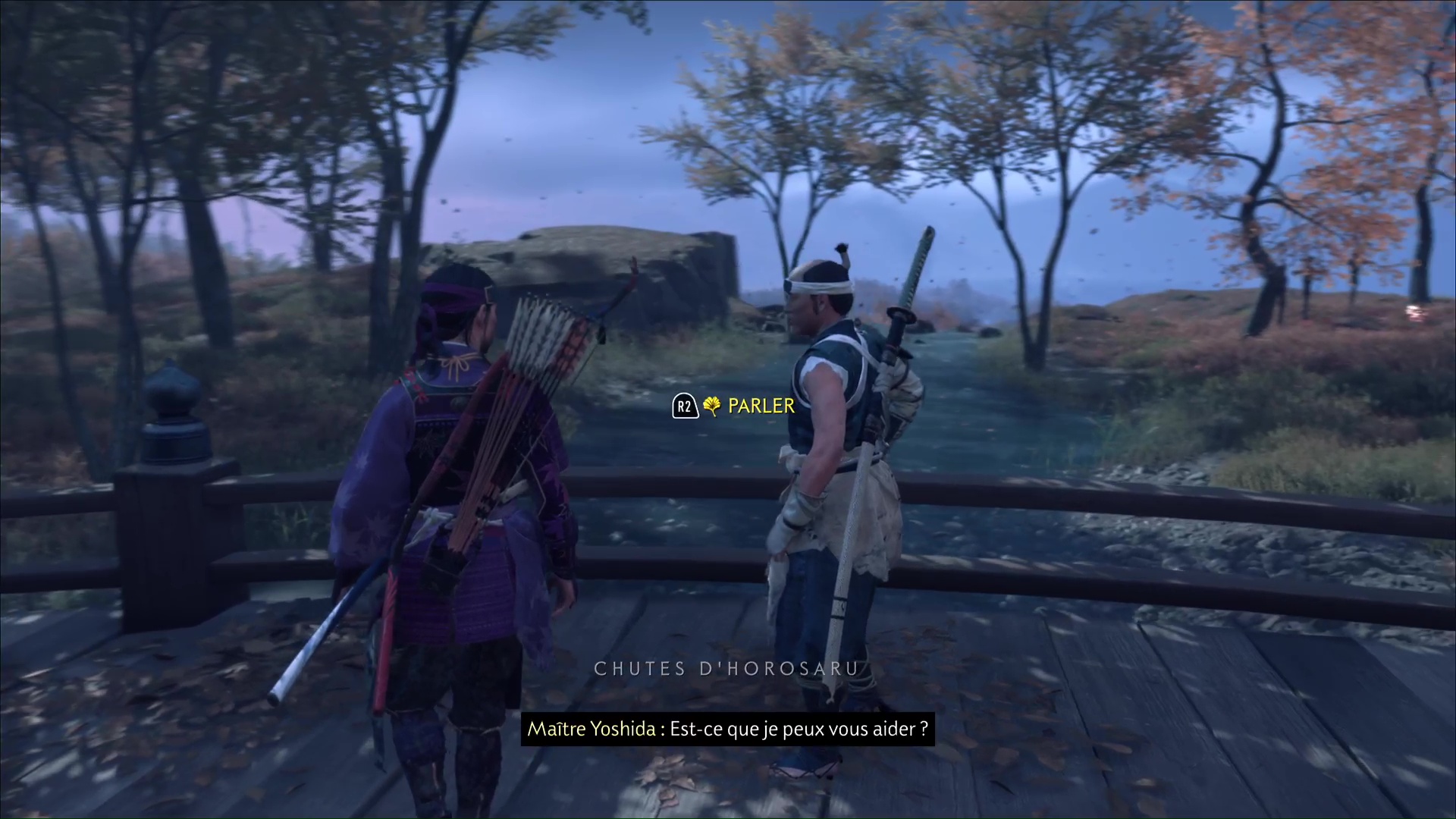 Une fois arrivé au dojo, dirigez-vous vers le pont pour trouver maître Yoshida. Lui aussi veut se débarrasser des frères Saito, mais il ne vous donnera ses informations qu’à ceux en qui il place sa confiance. Pour ce faire, il faut prouver que vous êtes capable de manier l’ōdachi.
