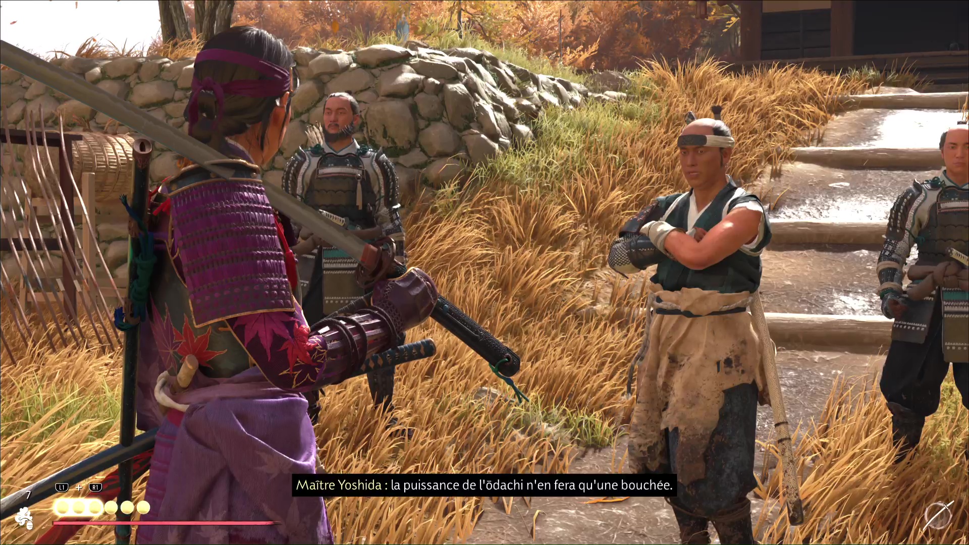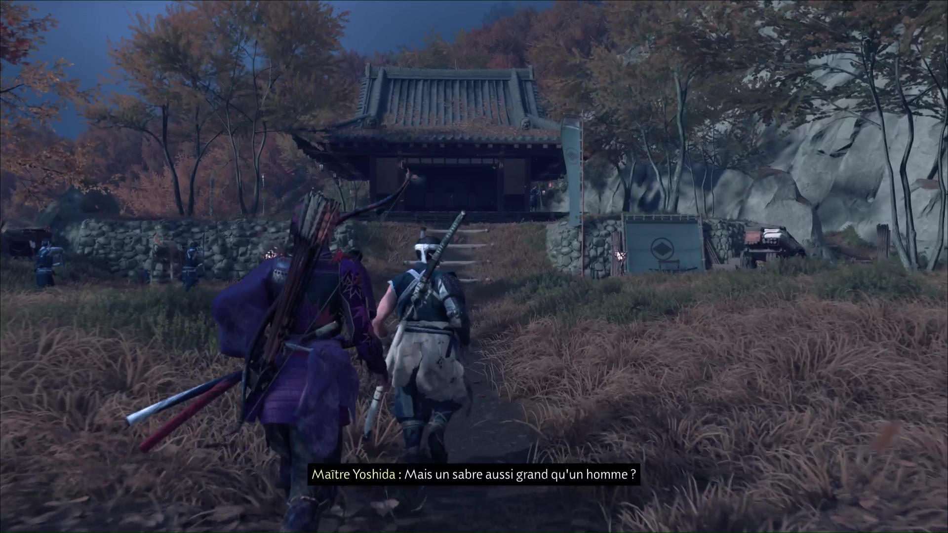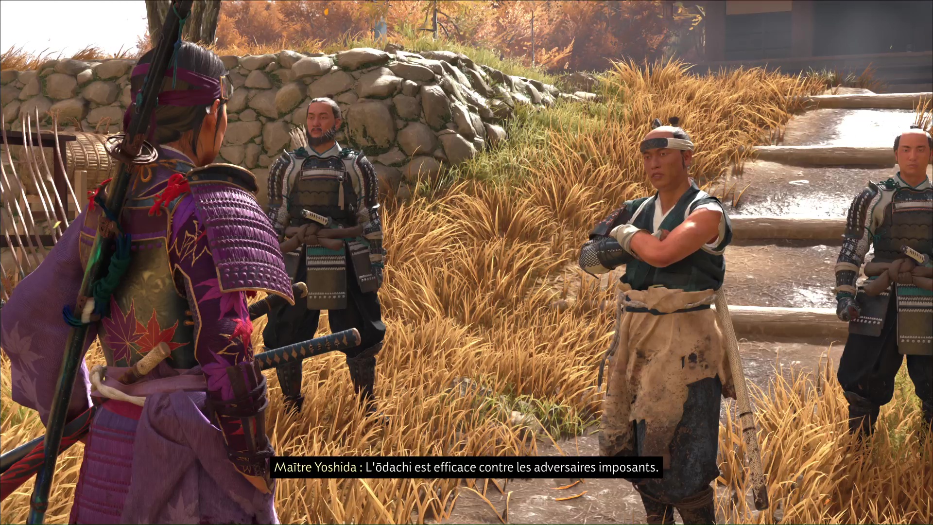 Suivez ensuite maître Yoshida pour que celui-ci vous laisse prendre un ōdachi. Saisissez-vous-en et traînez la lame péniblement jusqu’à la zone de combat. L’entraînement peut commencer.