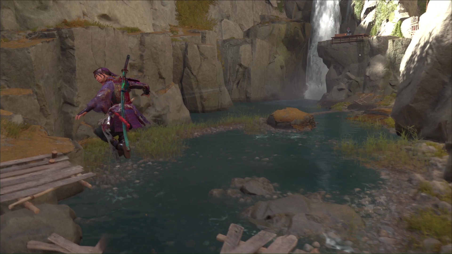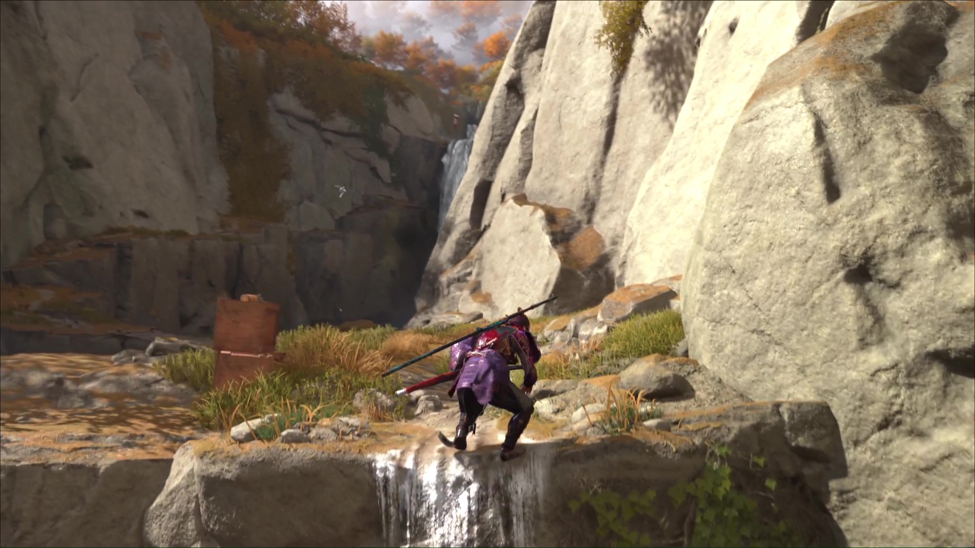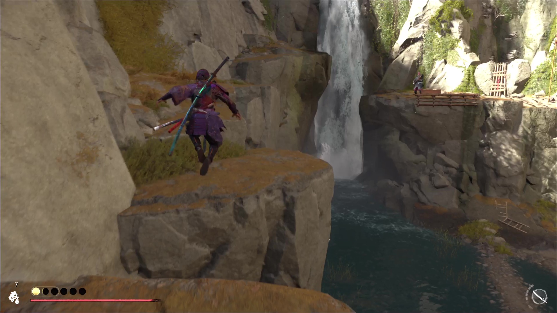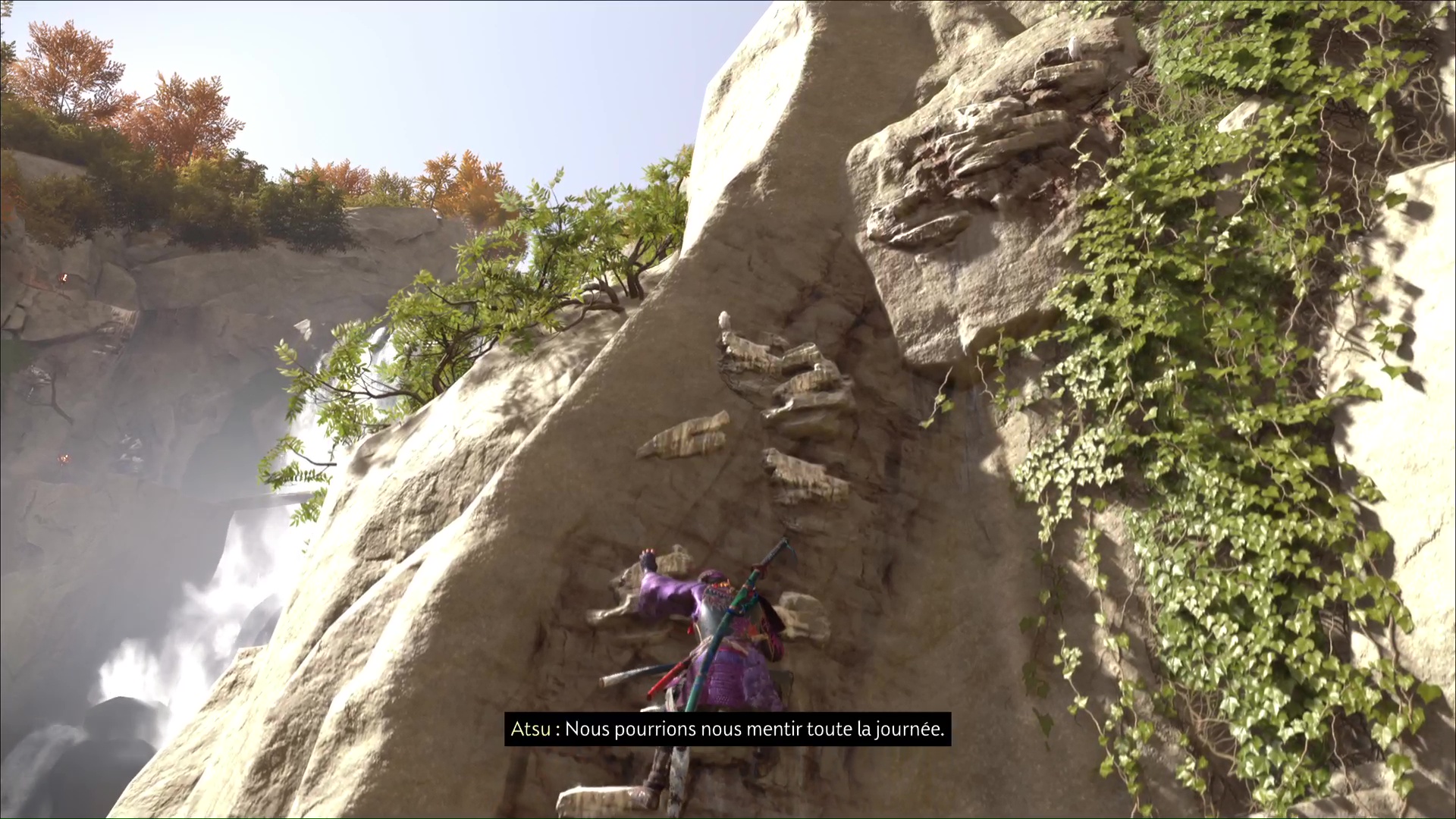Au niveau supérieur, sautez au-dessus le vide près d’une cascade, et repartez pour une autre session d’escalade. En haut, vous êtes accueilli par le retour d’un bō-hiya.
