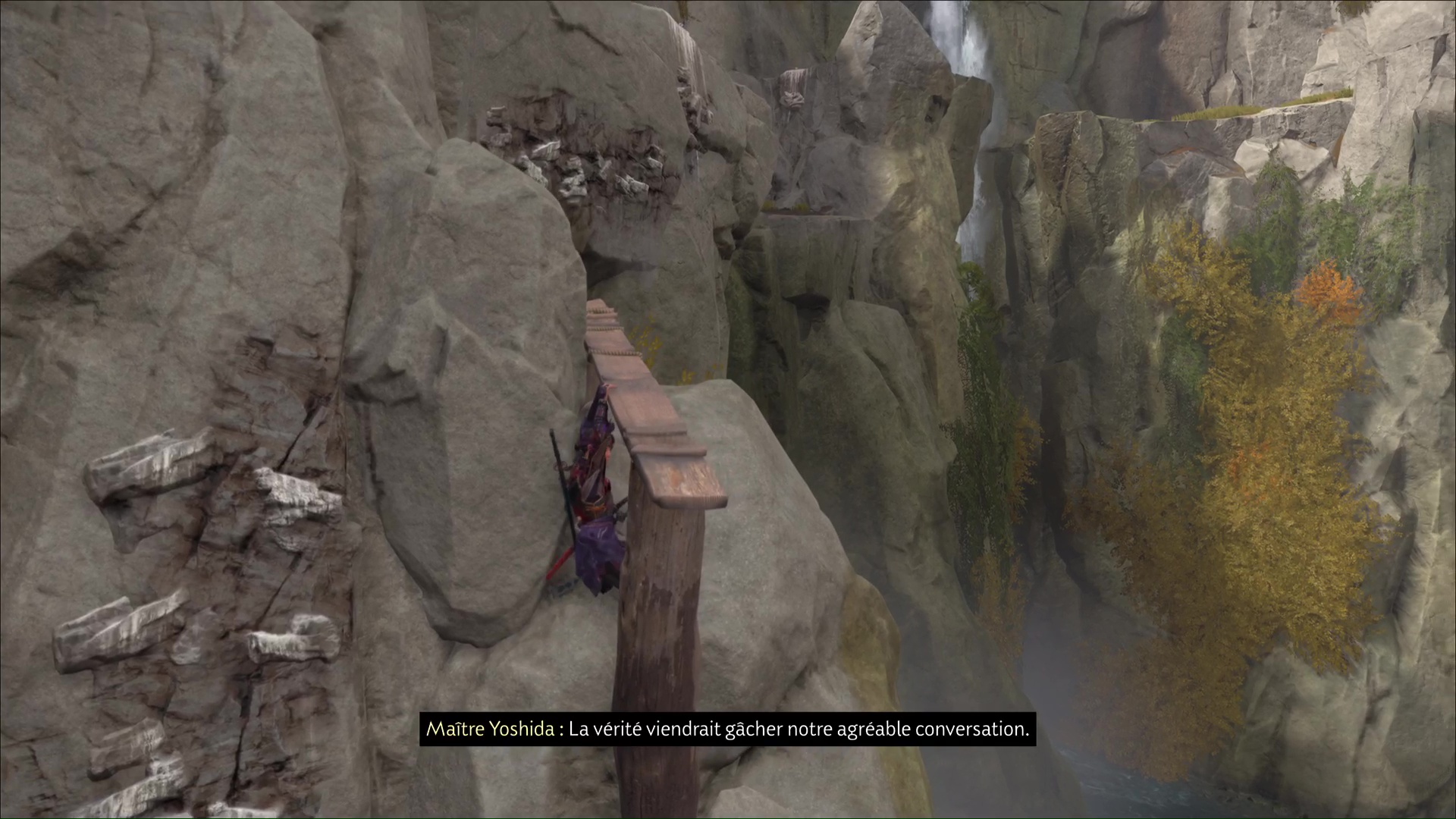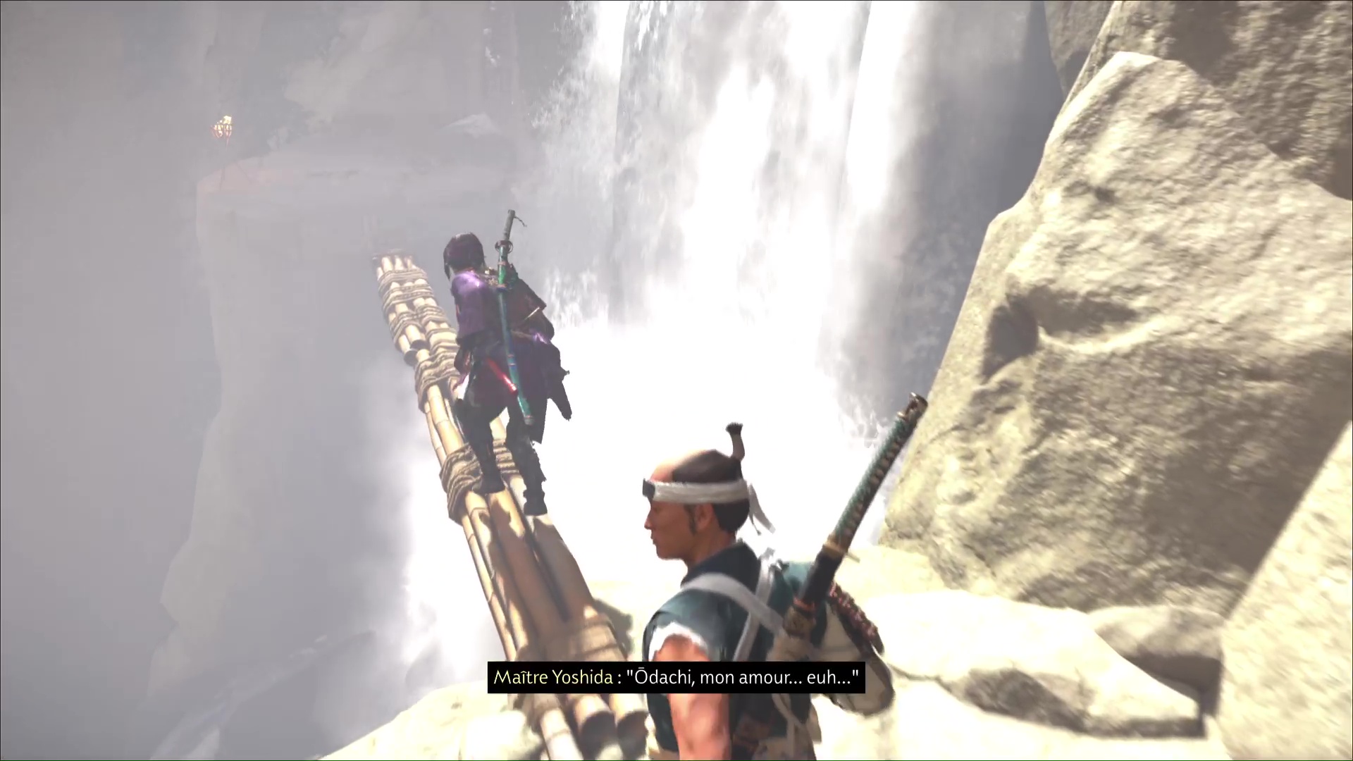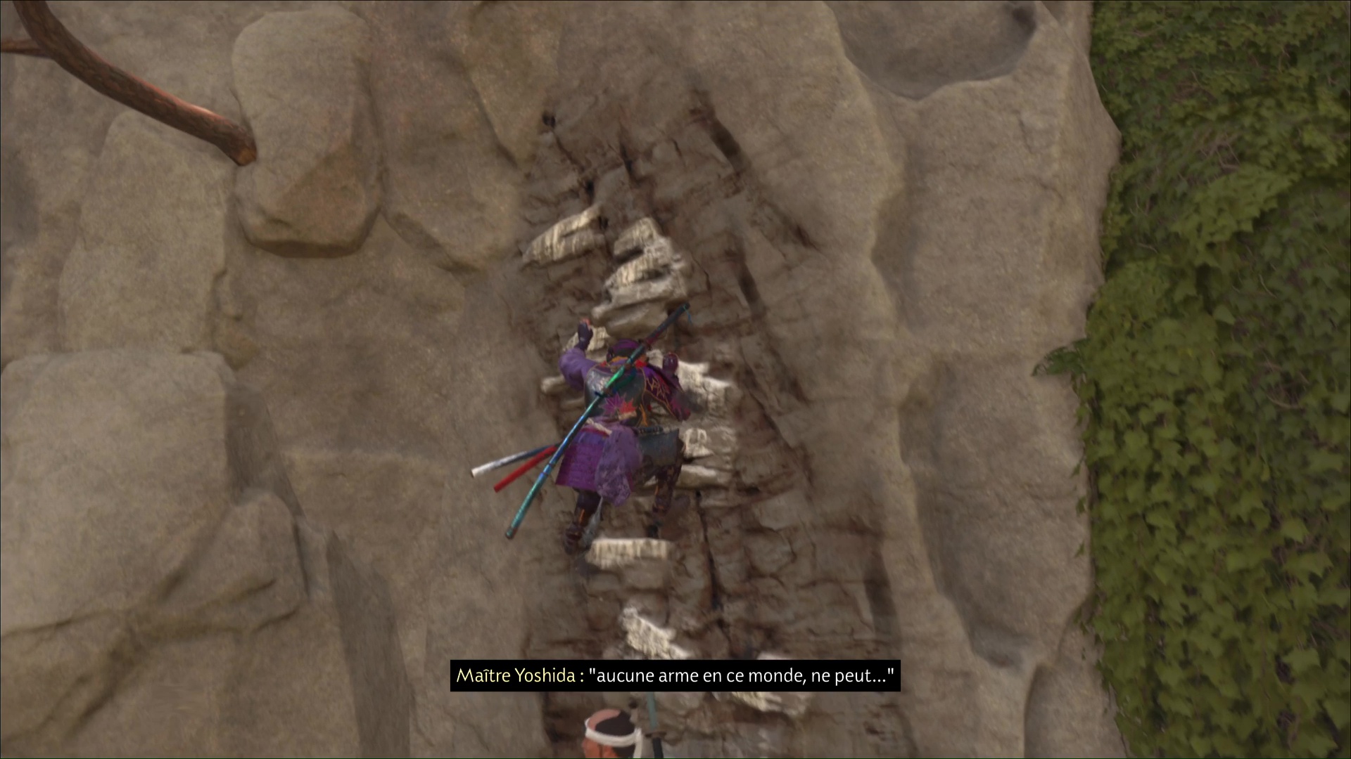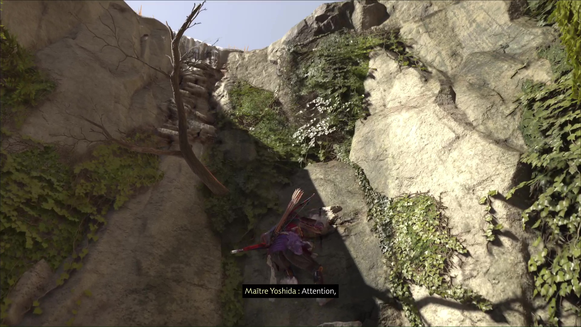 Mettez-vous en route avec maître Yoshida. Rapidement, il va falloir escalader. Grimpez les prises rocheuses et sautez sur les branches pour arriver plusieurs mètres plus haut. Traversez ensuite un pont de bambous