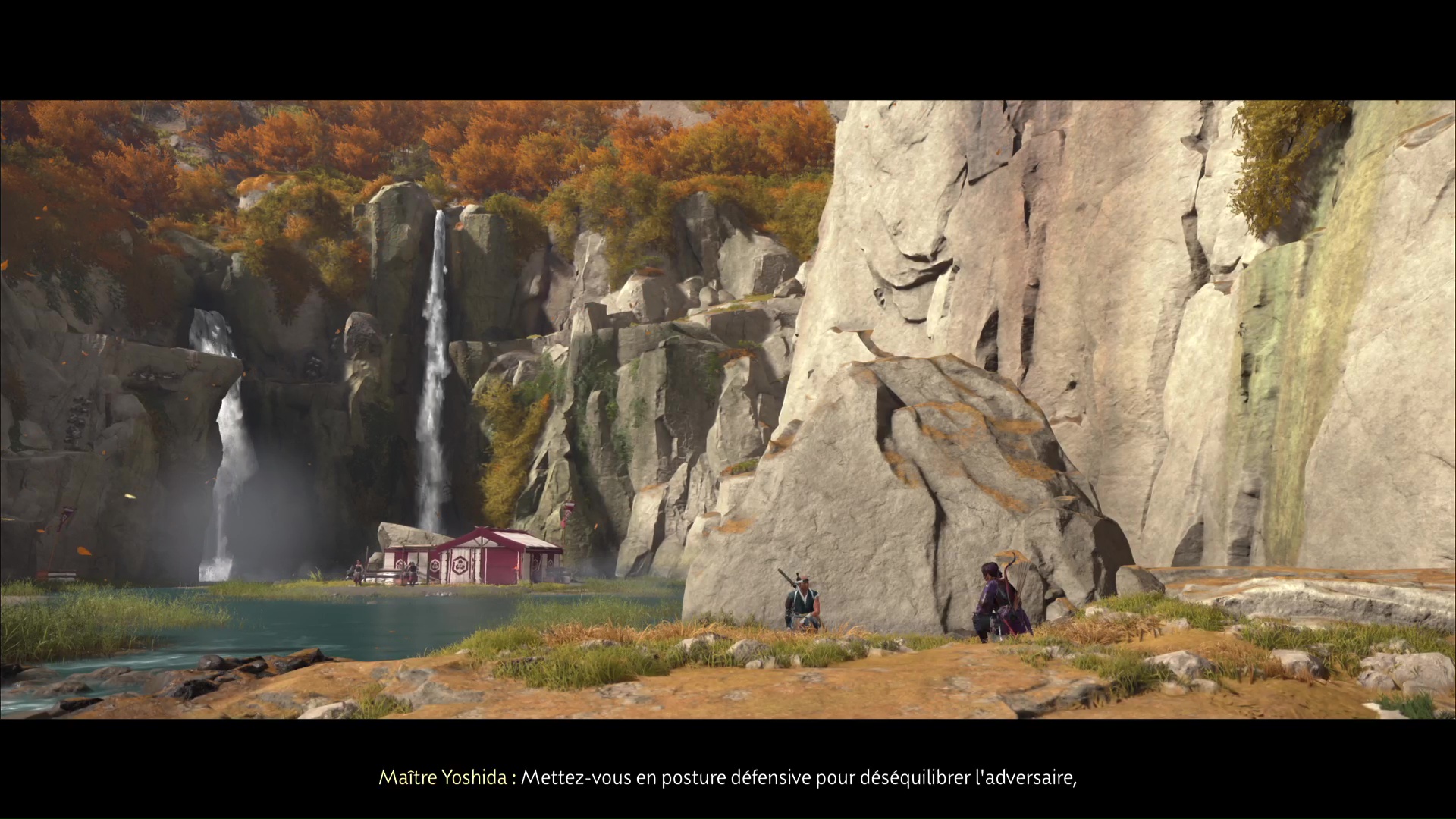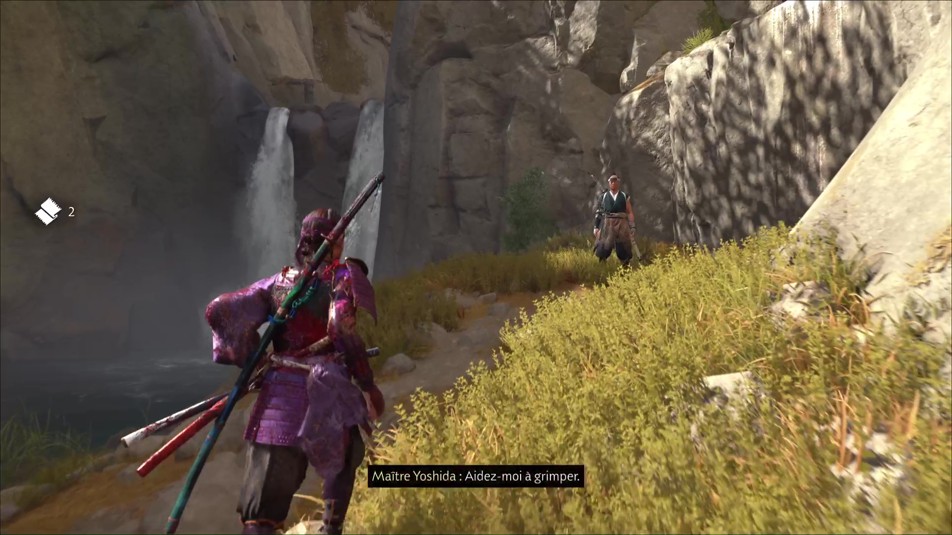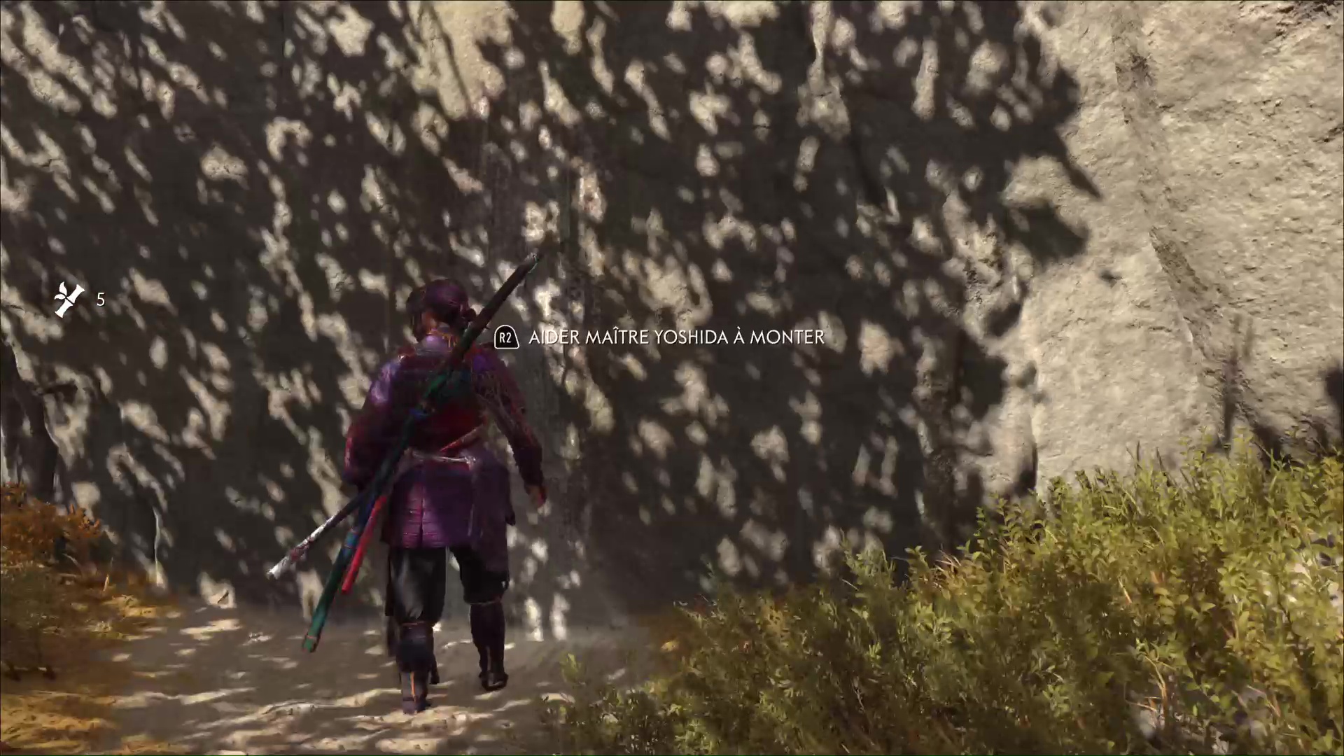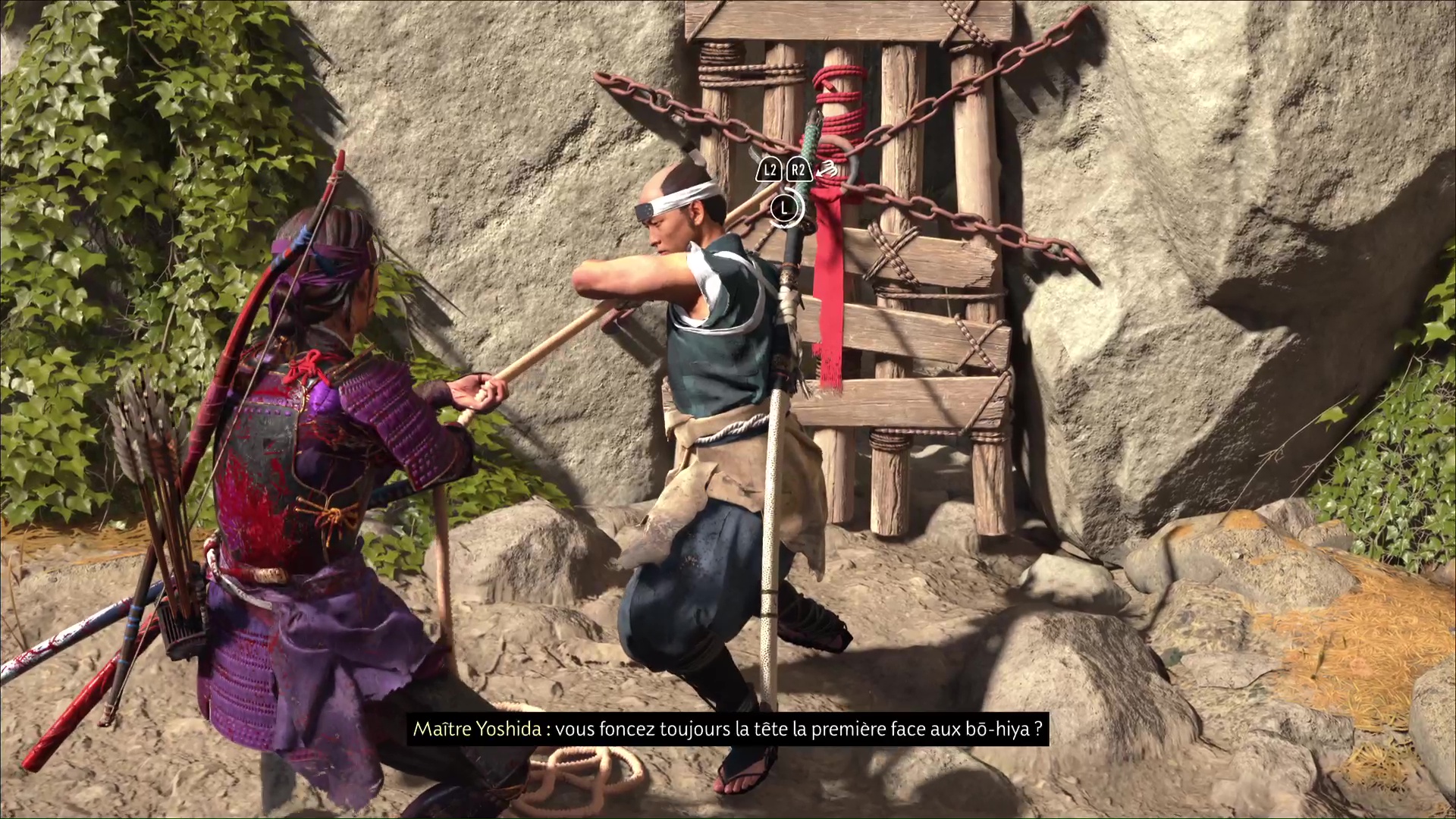 Mettez-vous en route avec maître Yoshida. Rapidement, il va falloir escalader. Grimpez les prises rocheuses et sautez sur les branches pour arriver plusieurs mètres plus haut. Traversez ensuite un pont de bambous