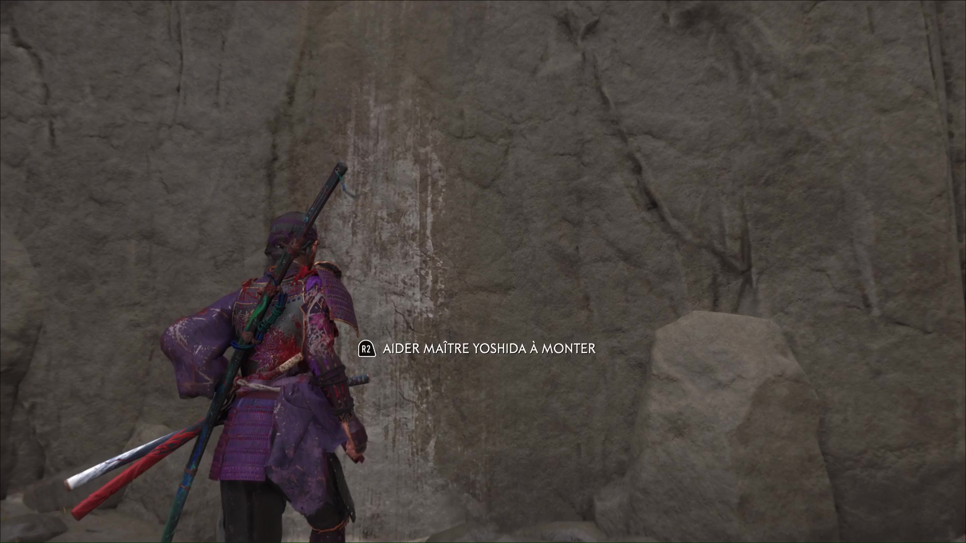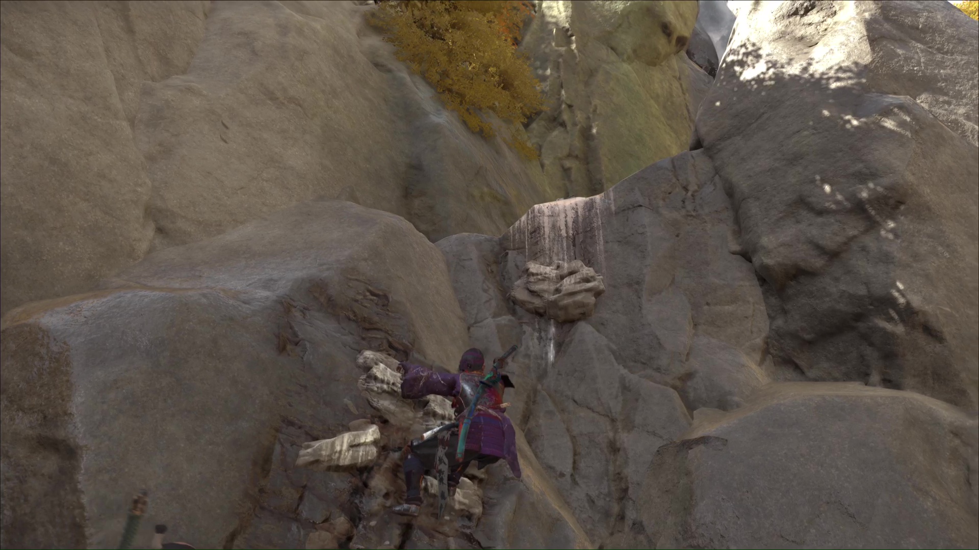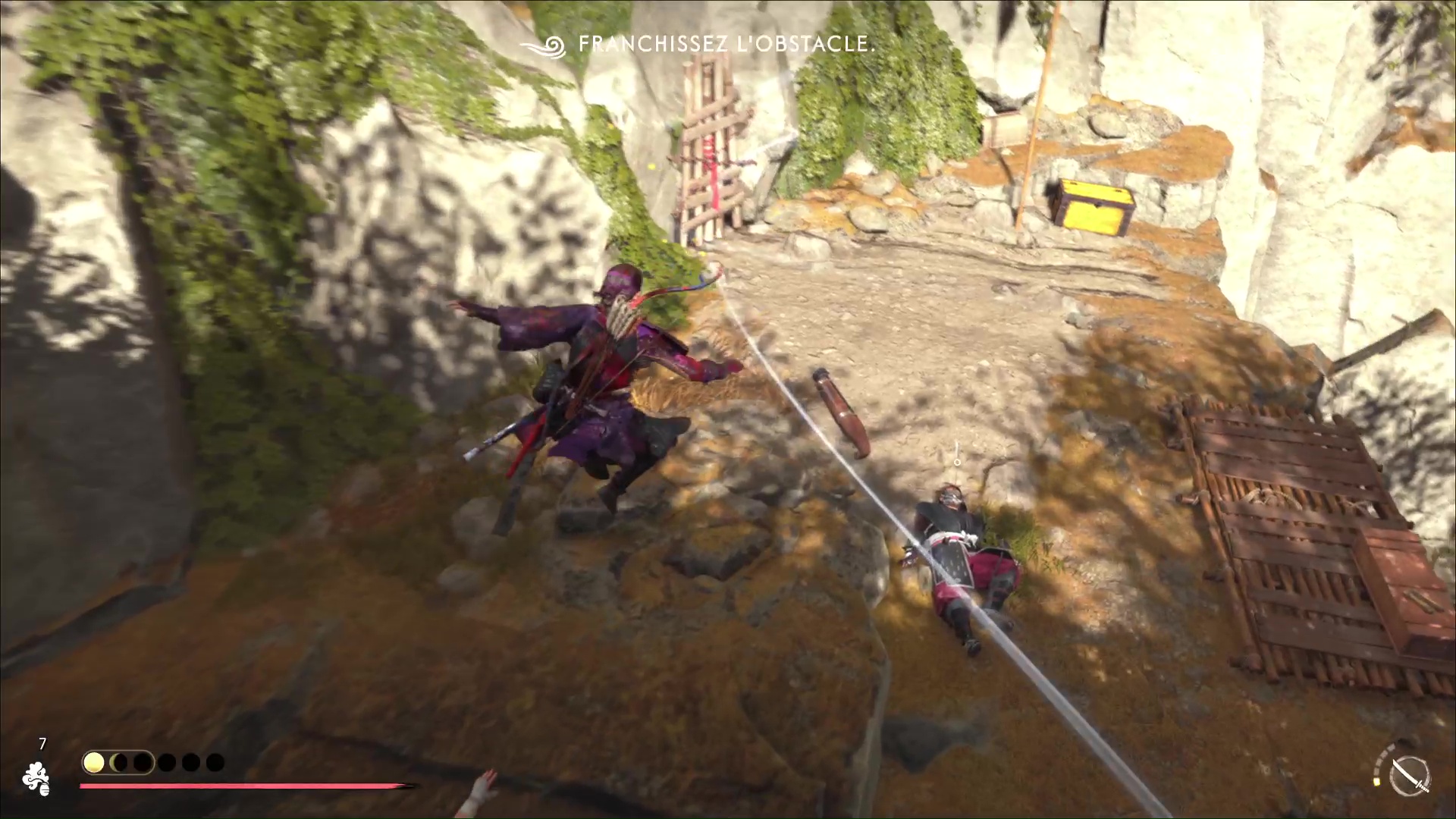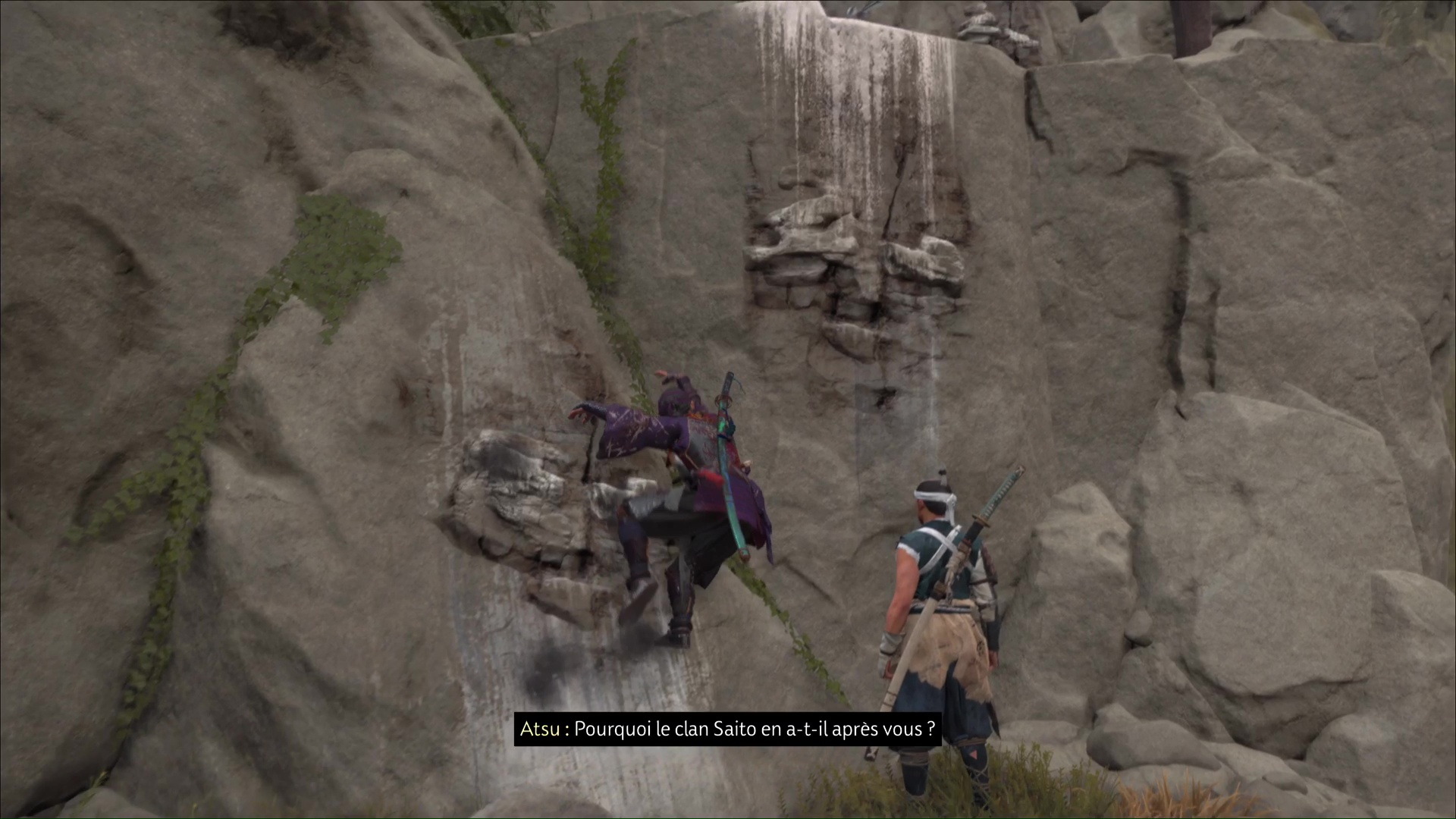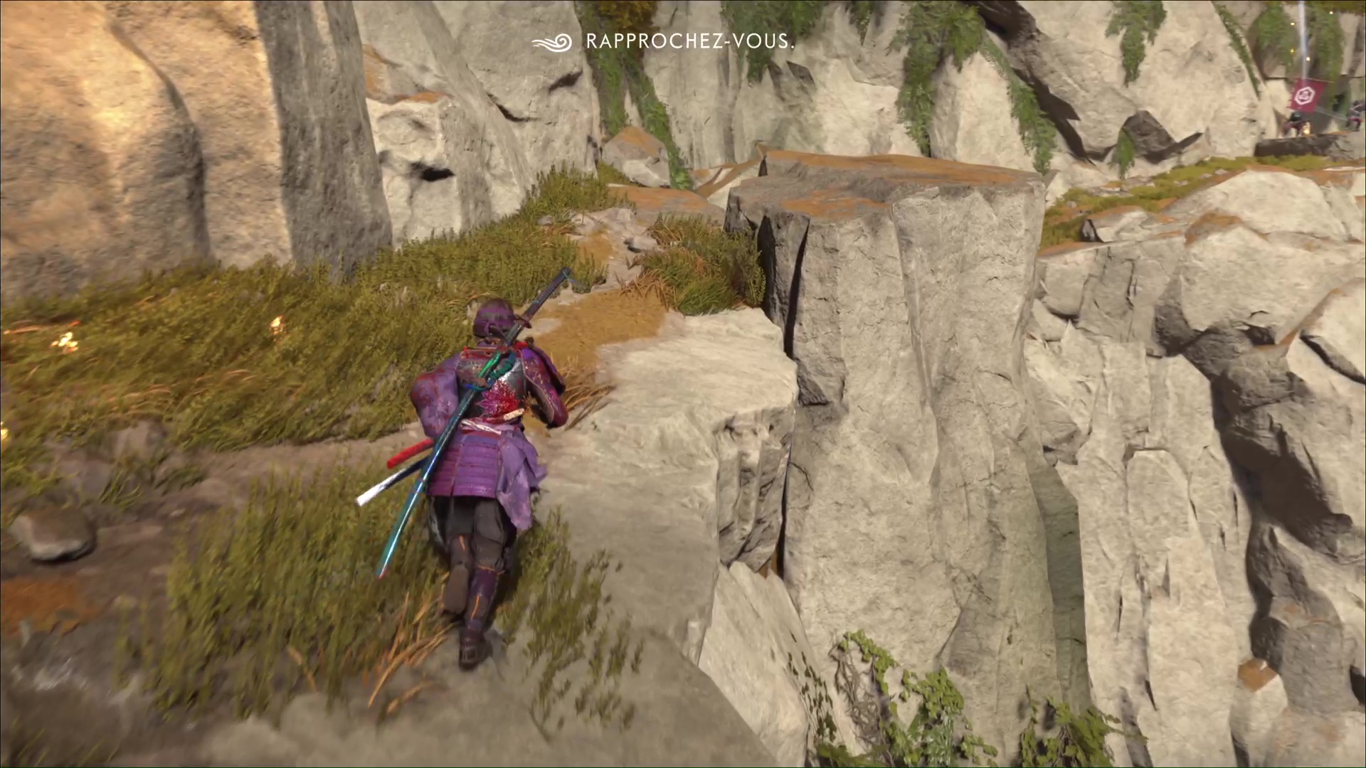 Puis, de l’autre côté, escaladez de nouvelles prises rocheuses. Une fois hissé en haut, vous apercevez un premier camp de hors-la-loi de Saito.