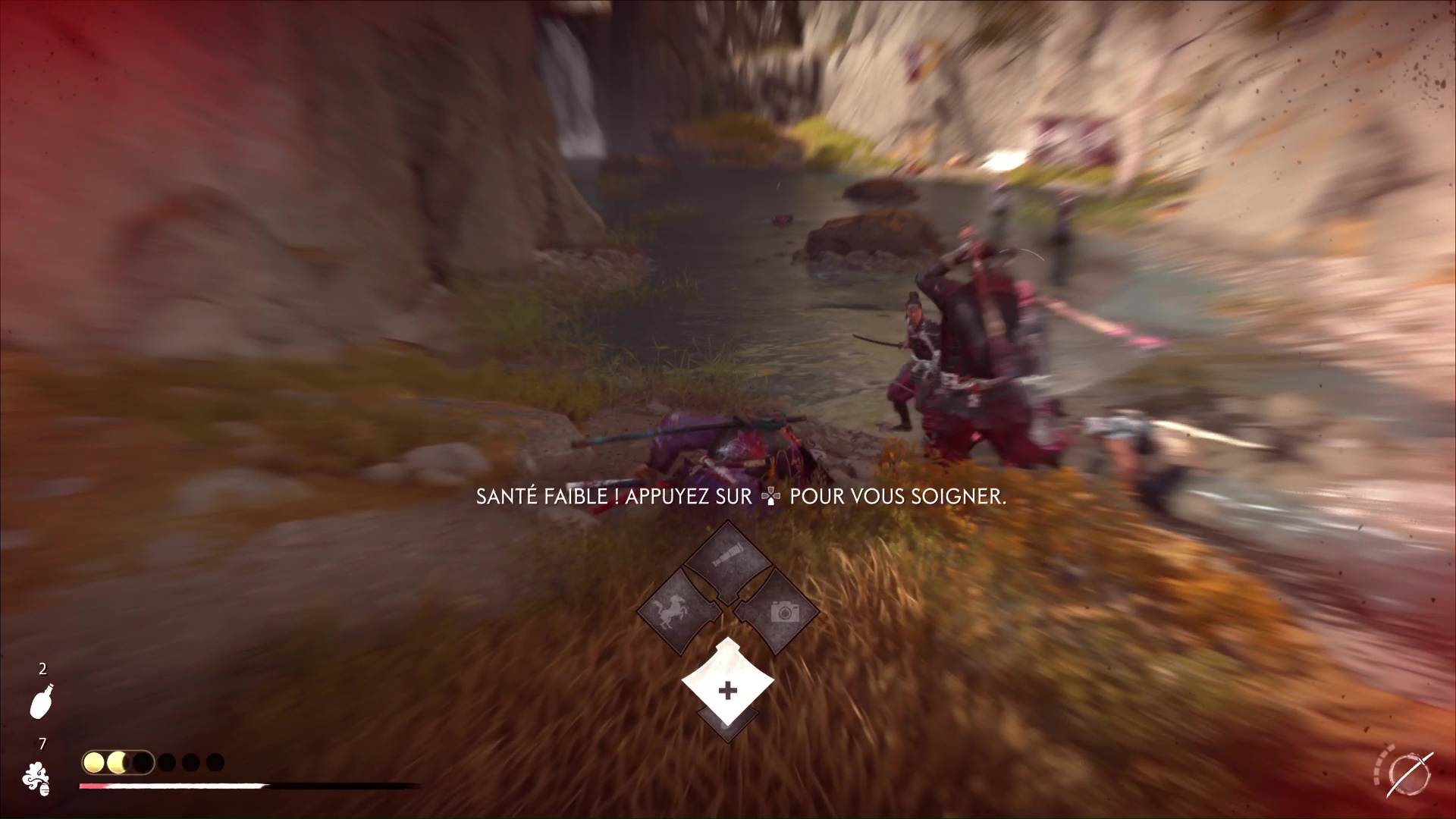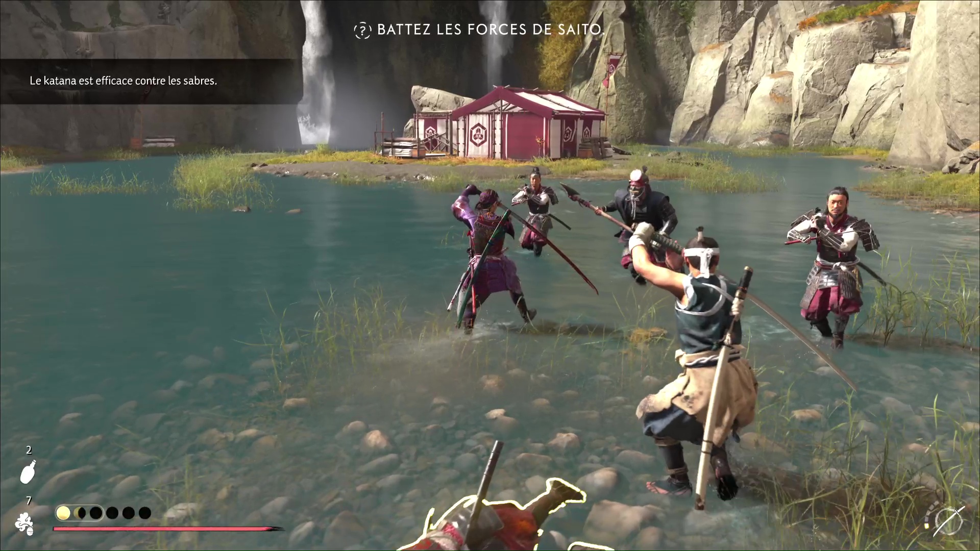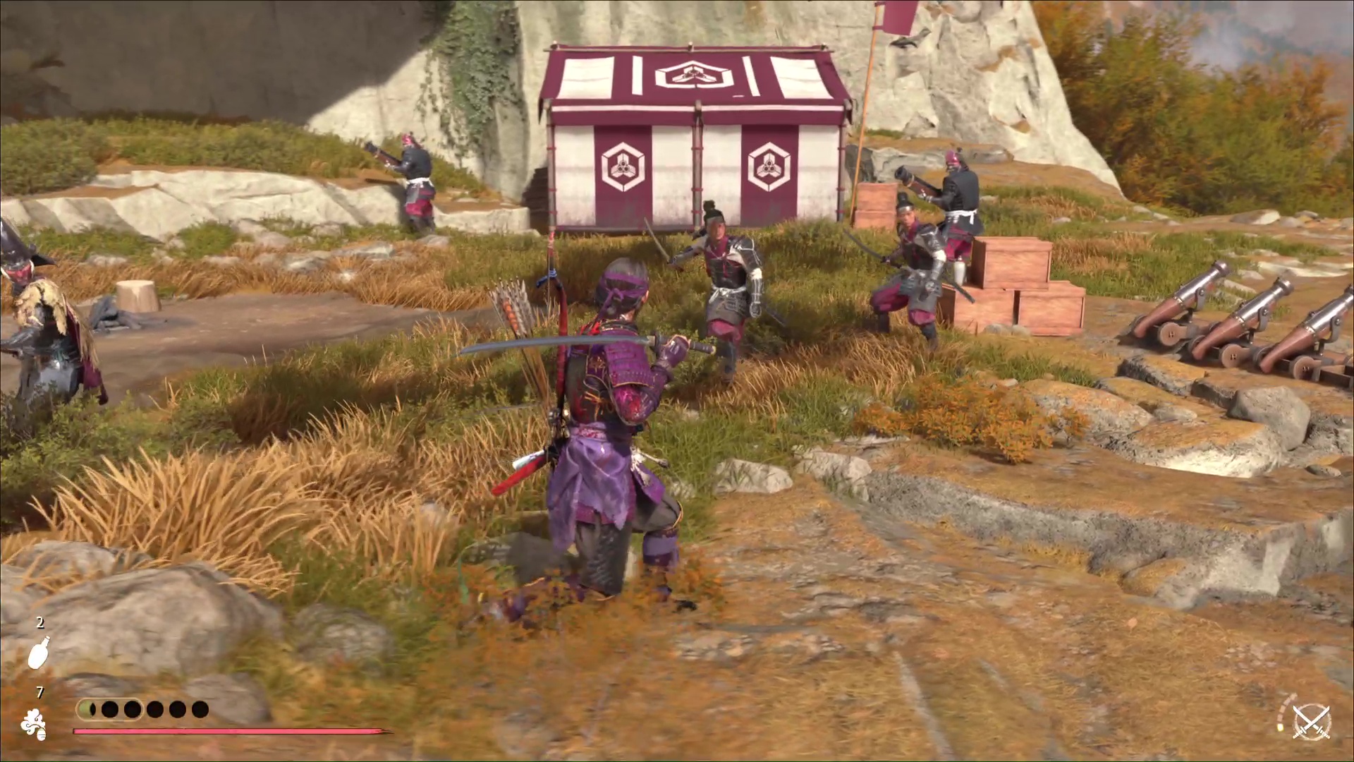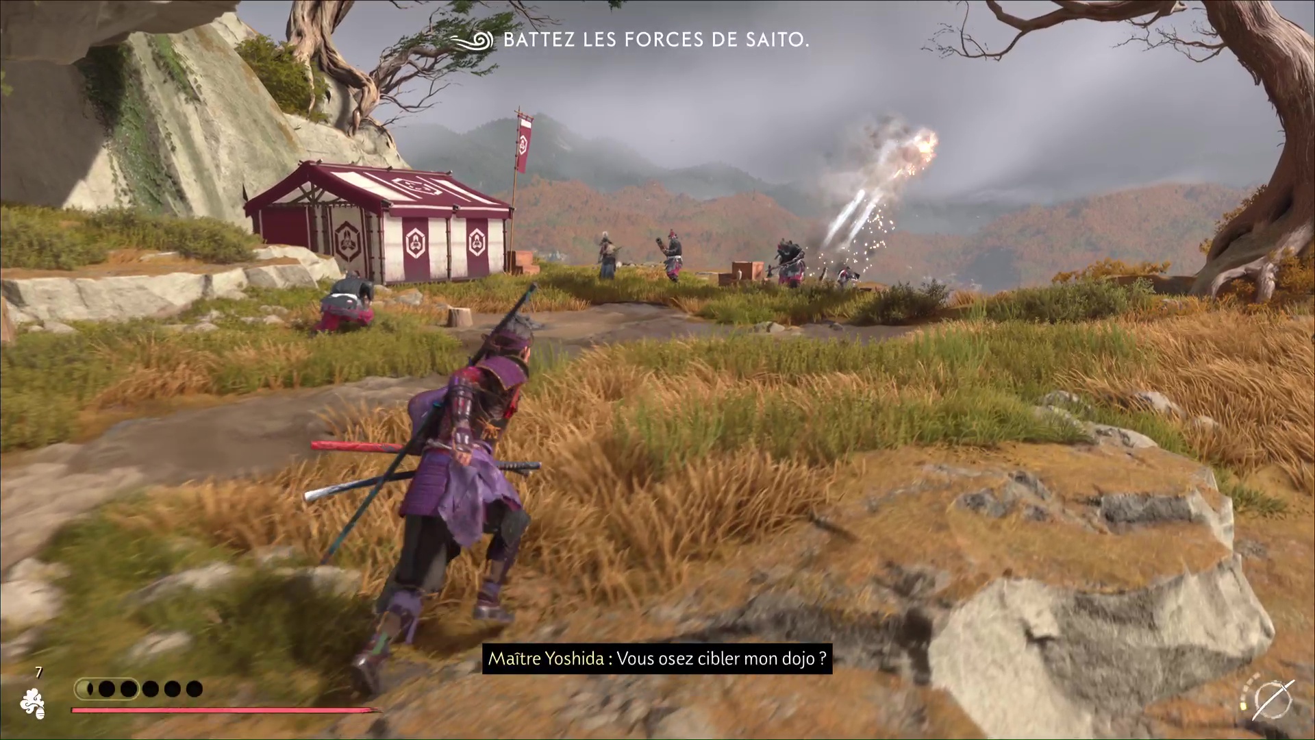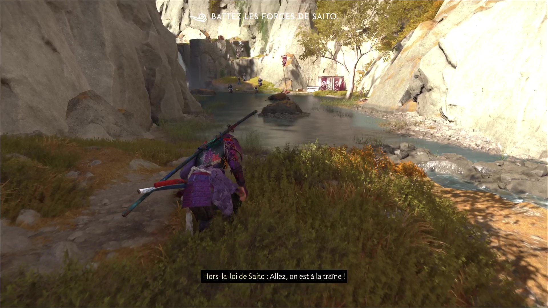 Courez et longez la falaise pour vous rapprocher des hommes de Saito. Au bout du chemin, vous atteignez le dernier campement à nettoyer.