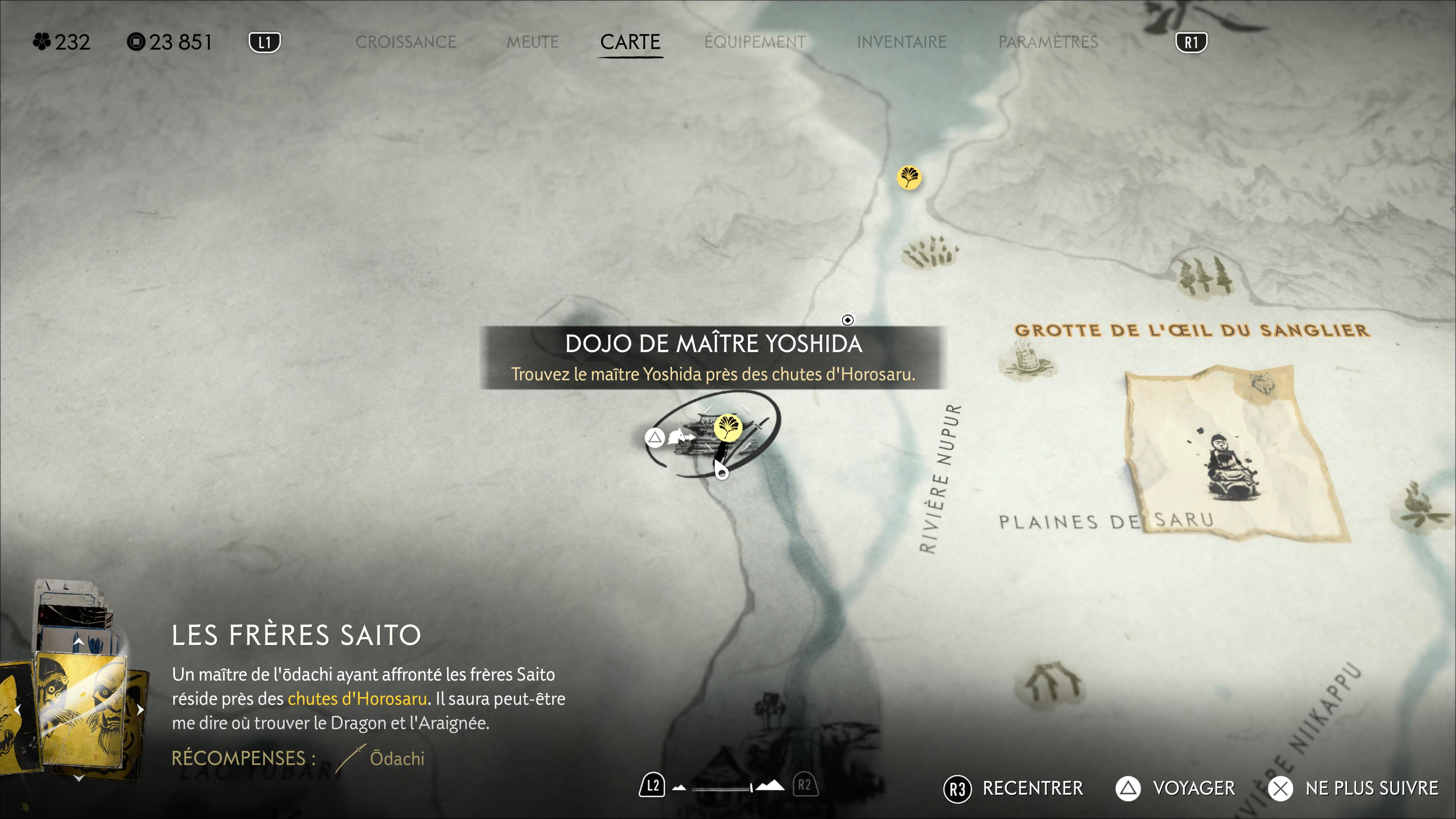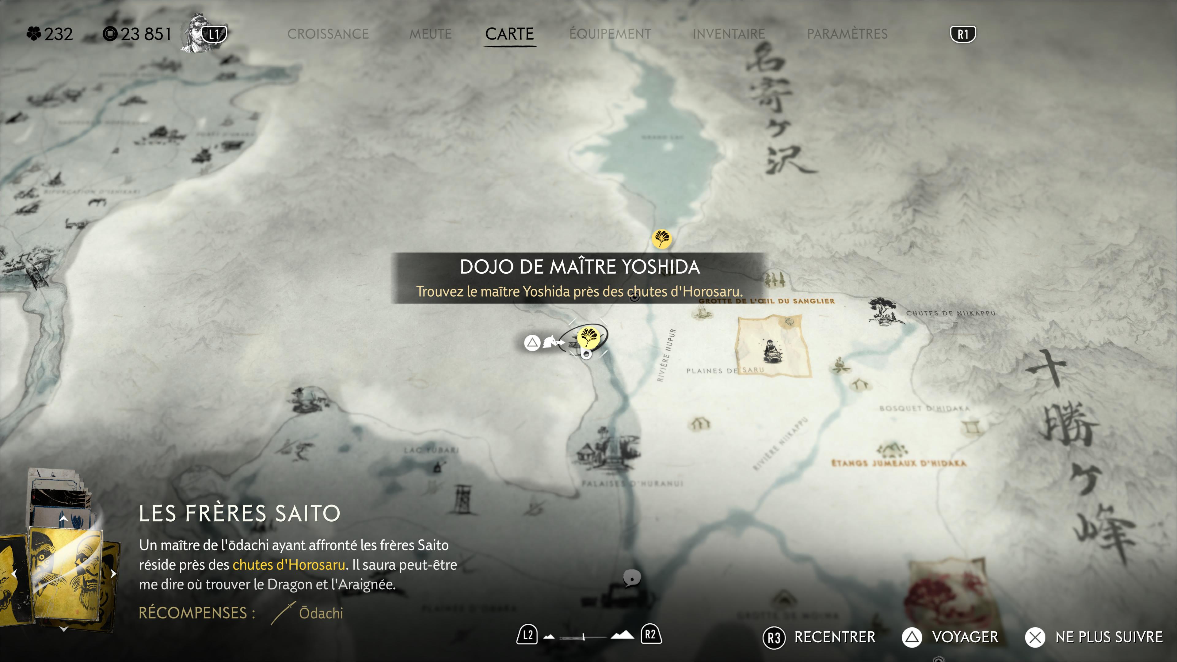 Lorsque vous vous concentrerez sur le Dragon et l’Araignée, les frères Saito, votre chemin vous mènera auprès de maître Yoshida, l’expert de l’ōdachi. Il se trouve au nord-ouest des Monts Tokachi, et en plus de faire avancer vos recherches, vous disposerez de l’enseignement lié au maniement de l’ōdachi, un katana géant capable de causer de gros dégâts. Voici le début d’une nouvelle quête principale de Ghost of Yōtei.