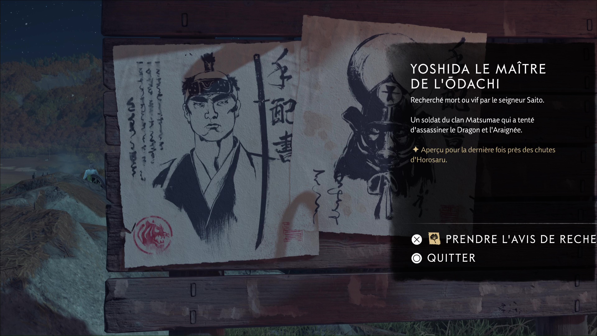 Le maître Yoshida est à son dojo dans les hauteurs du nord-ouest des Monts Tokachi. Vous avez d’ailleurs la possibilité de tomber sur un avis de recherche à son effigie, vous donnant un indice sur sa localisation.
