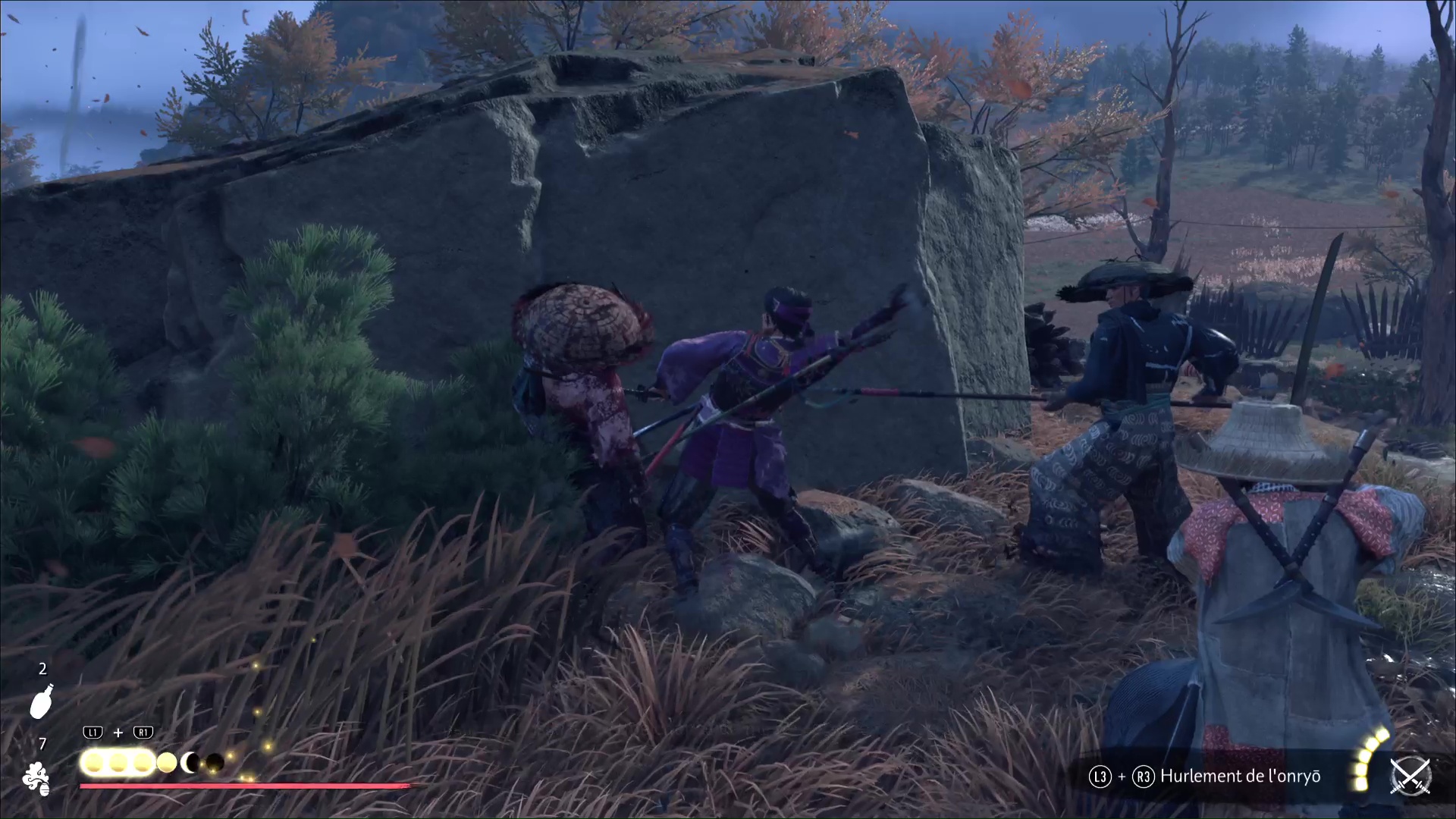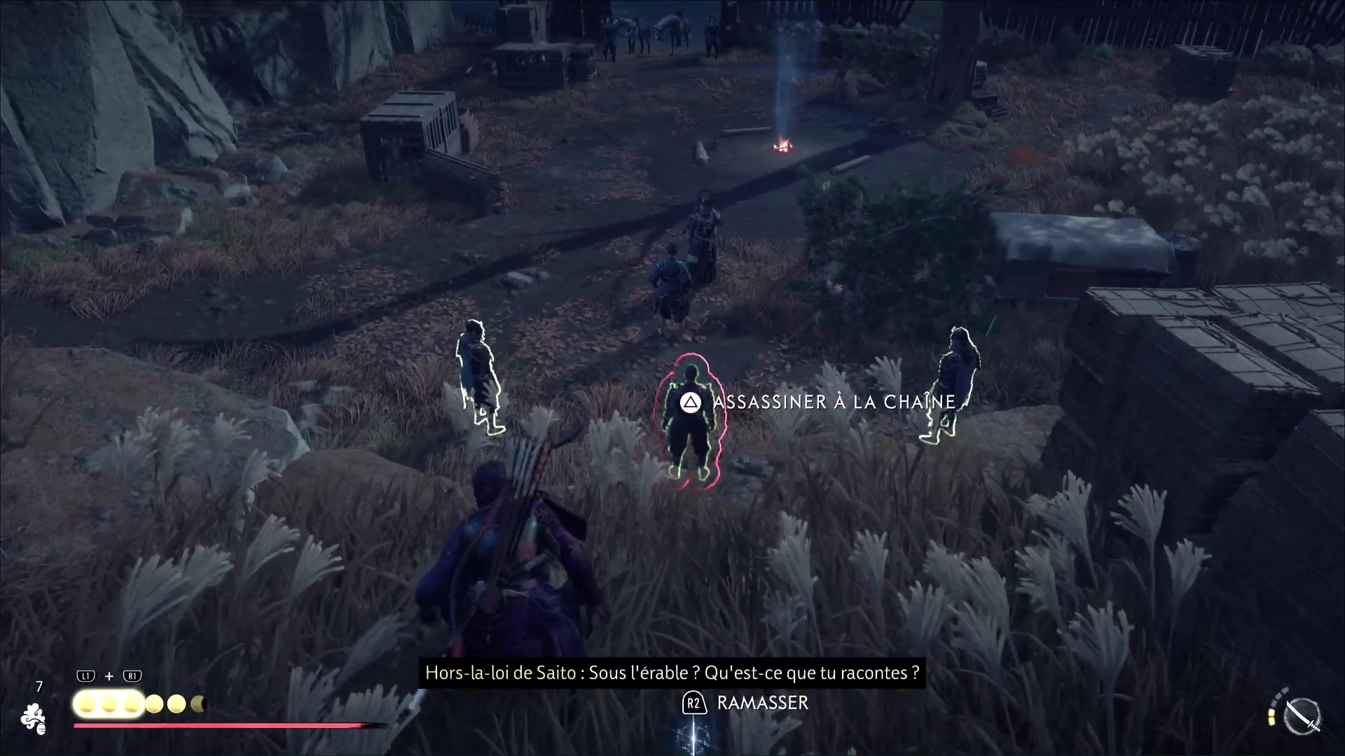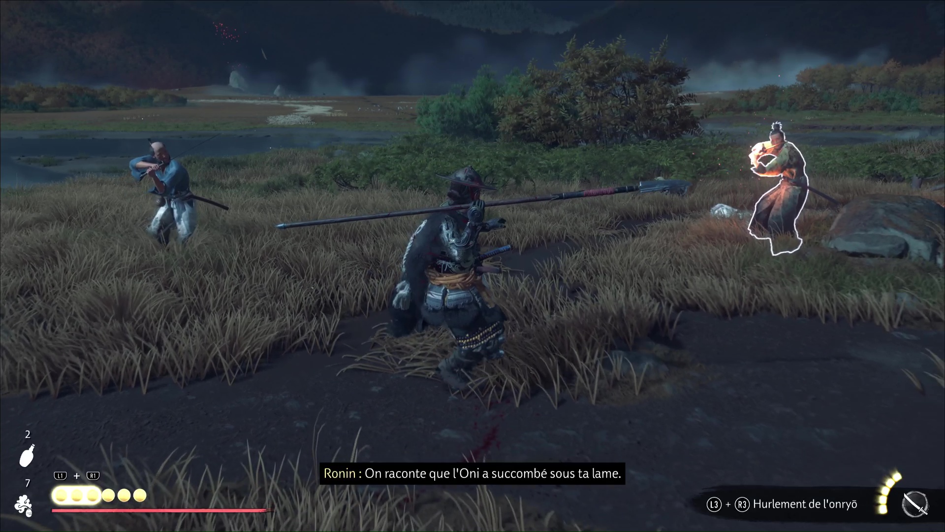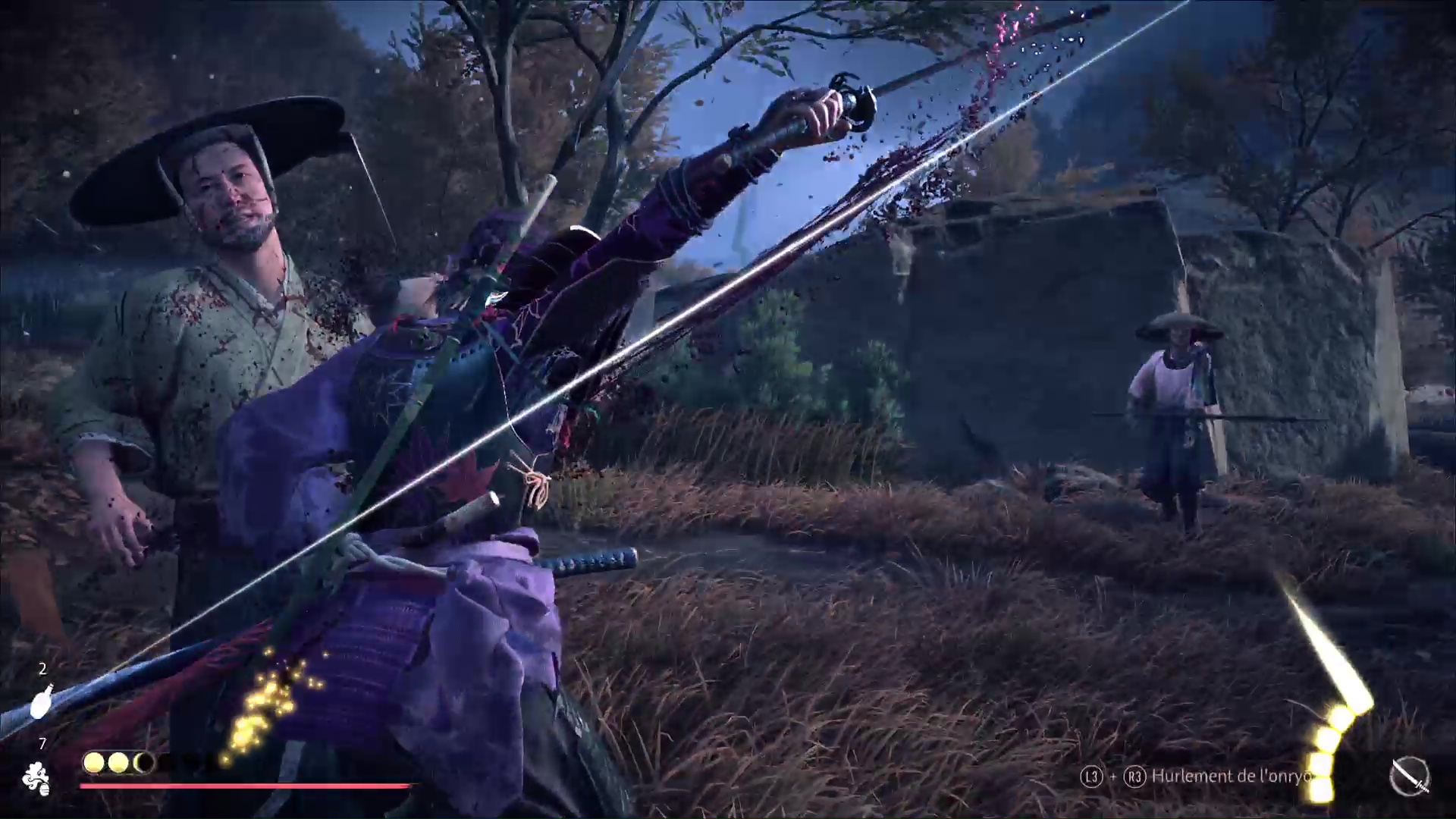 À ce moment-là, remarquez que trois ennemis vont vous tourner le dos. Si vous disposez de l’assassinat à la chaîne, régalez-vous. Enchaînez avec le cri de l’onryo s’il est chargé, puis éliminez les ennemis restants.