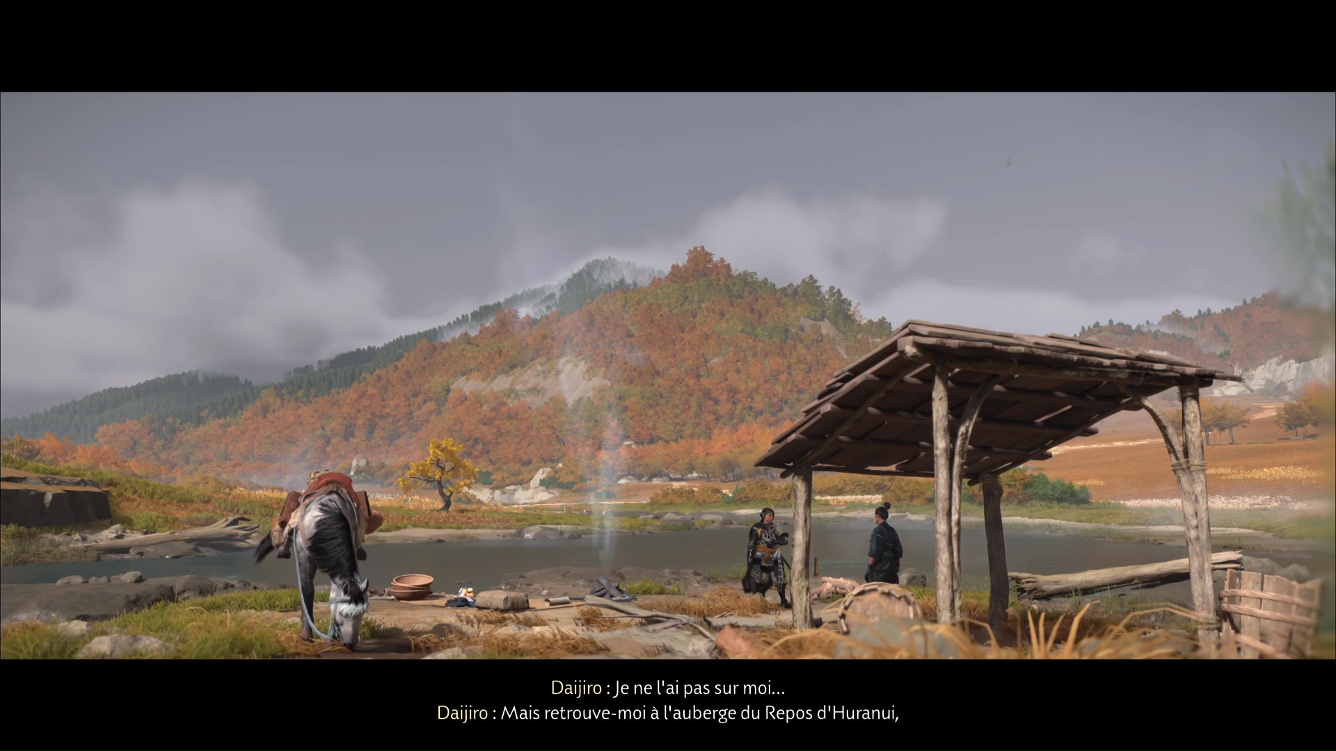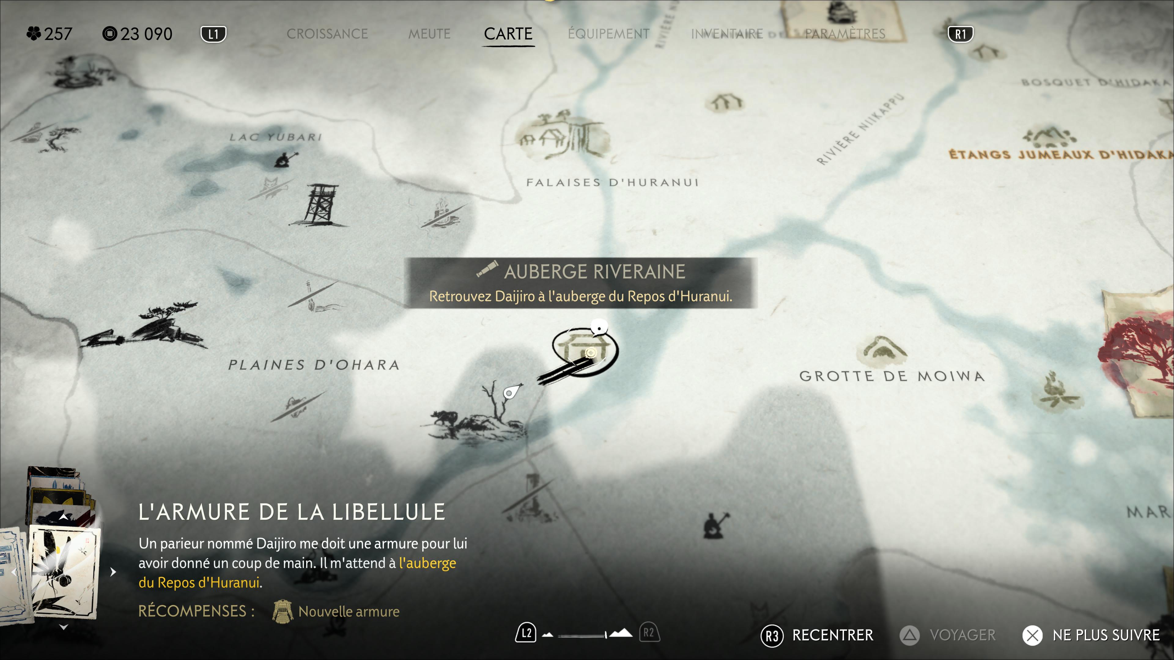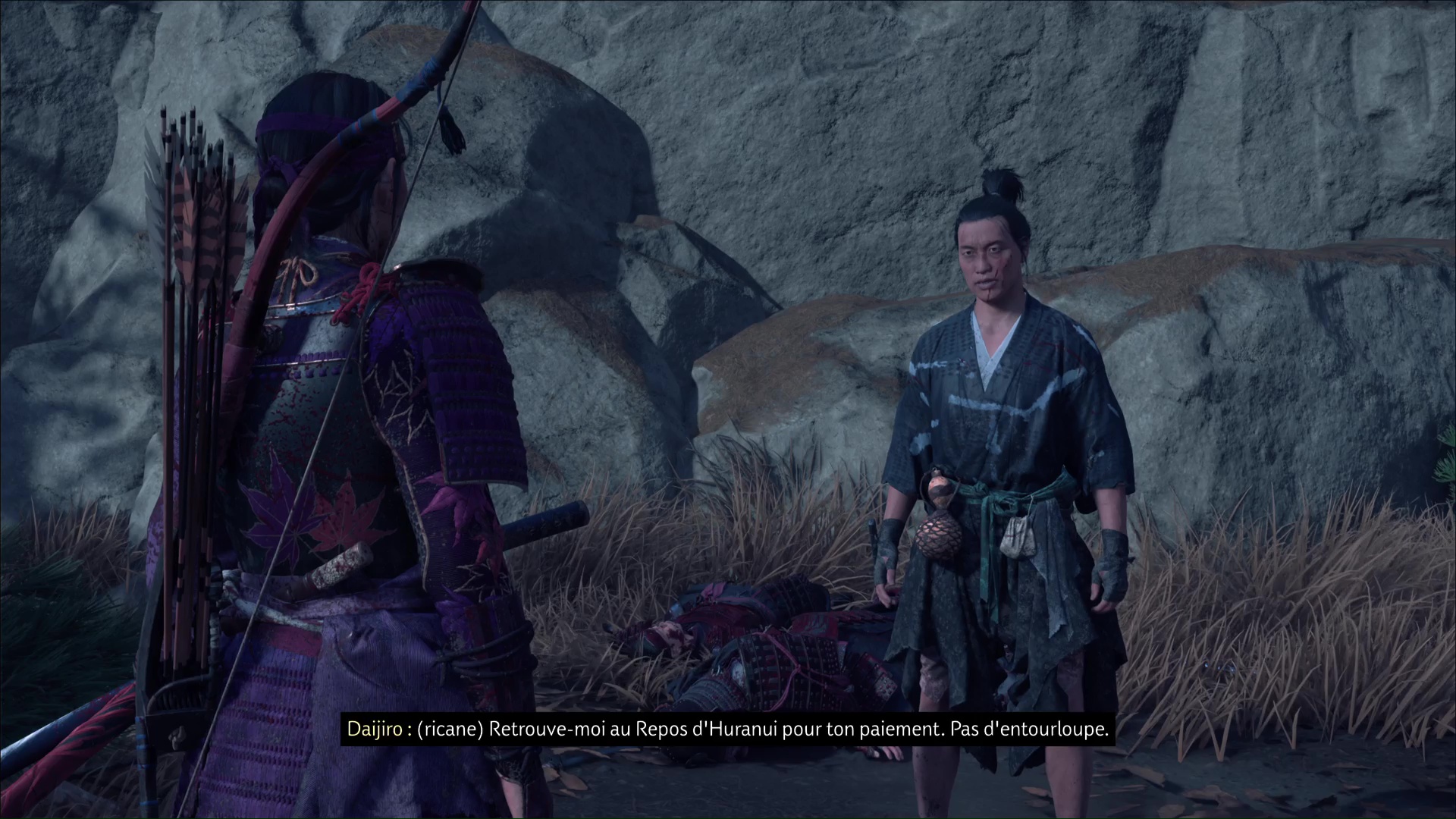Daijiro vous apprend alors que l’armure n’est pas là, et vous demande de le rejoindre à l’Auberge du Repos d’Huranui. Allez sur place et parlez-lui.