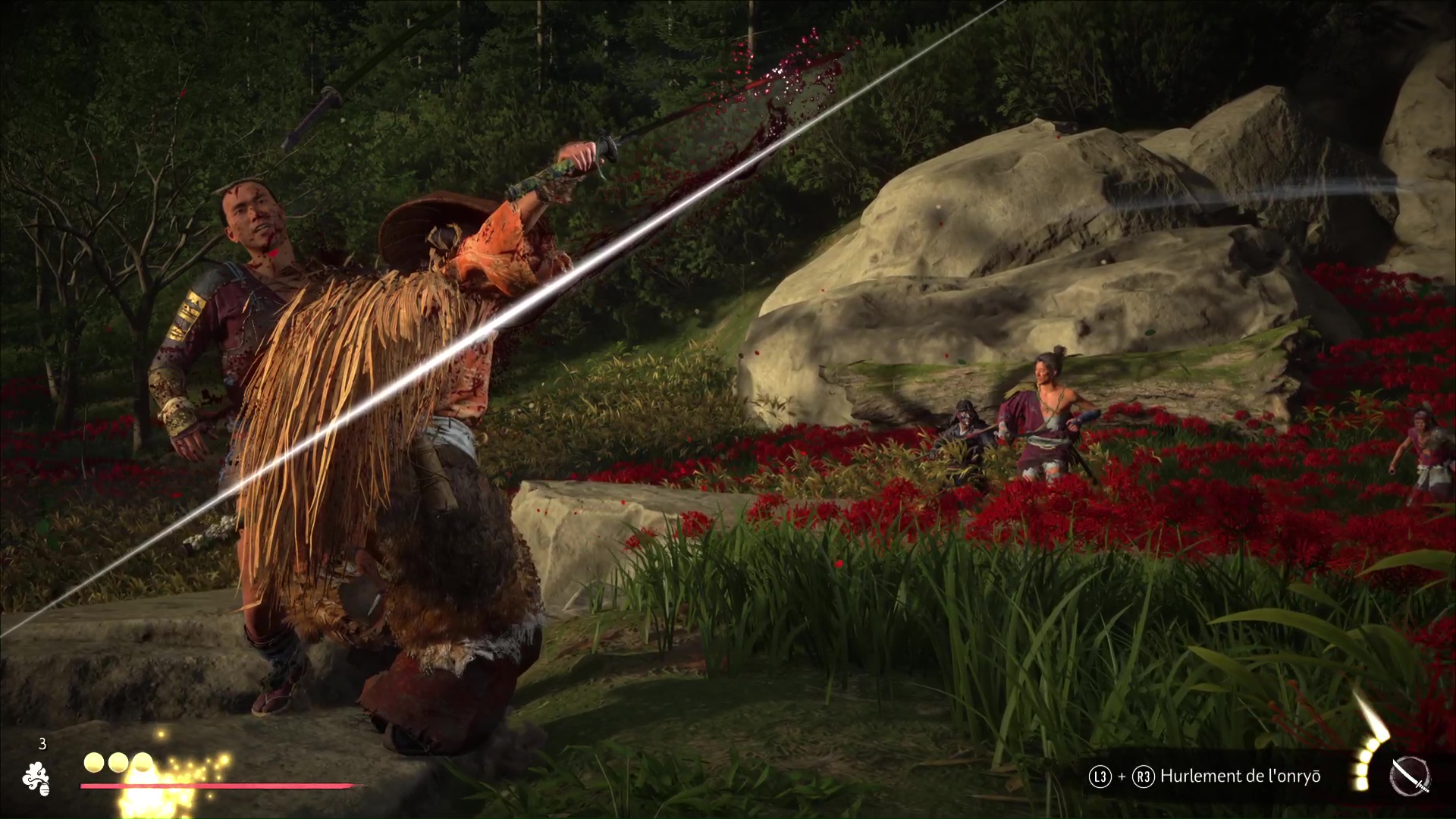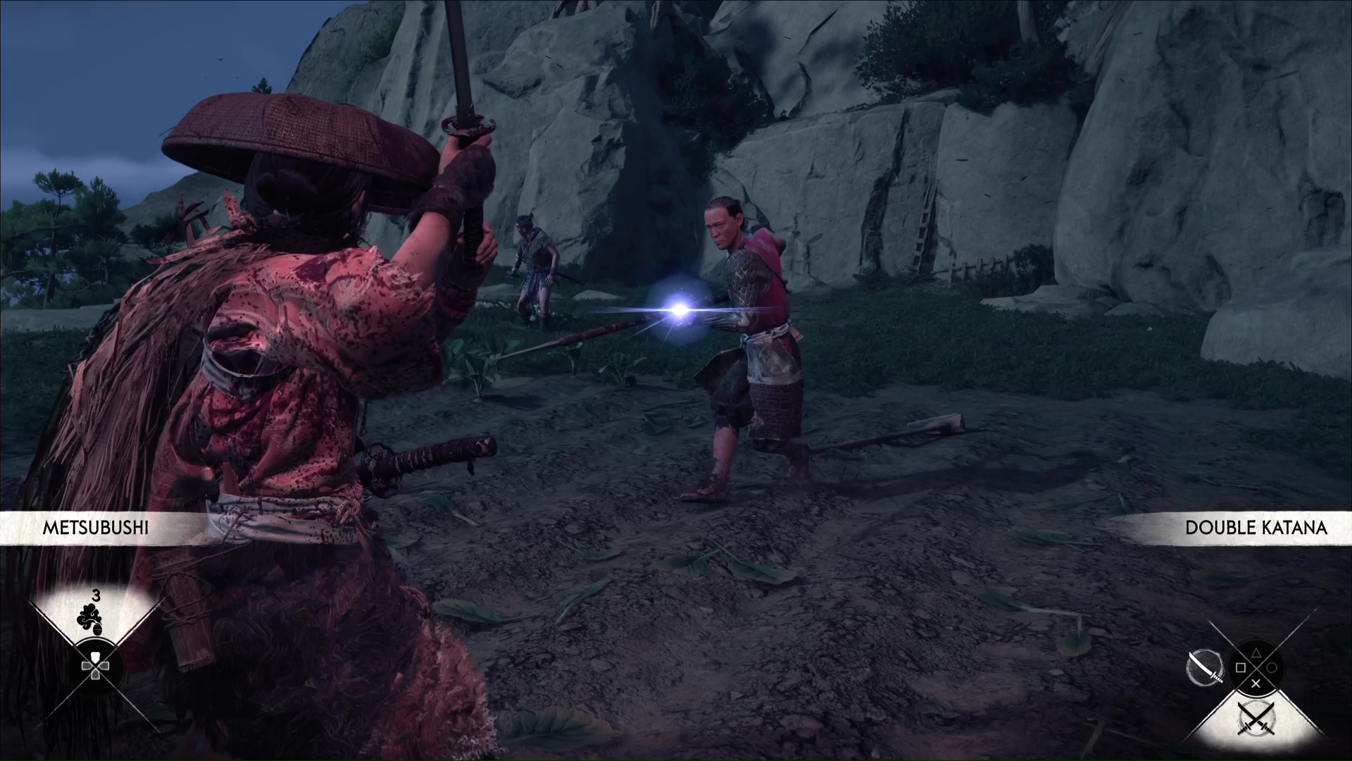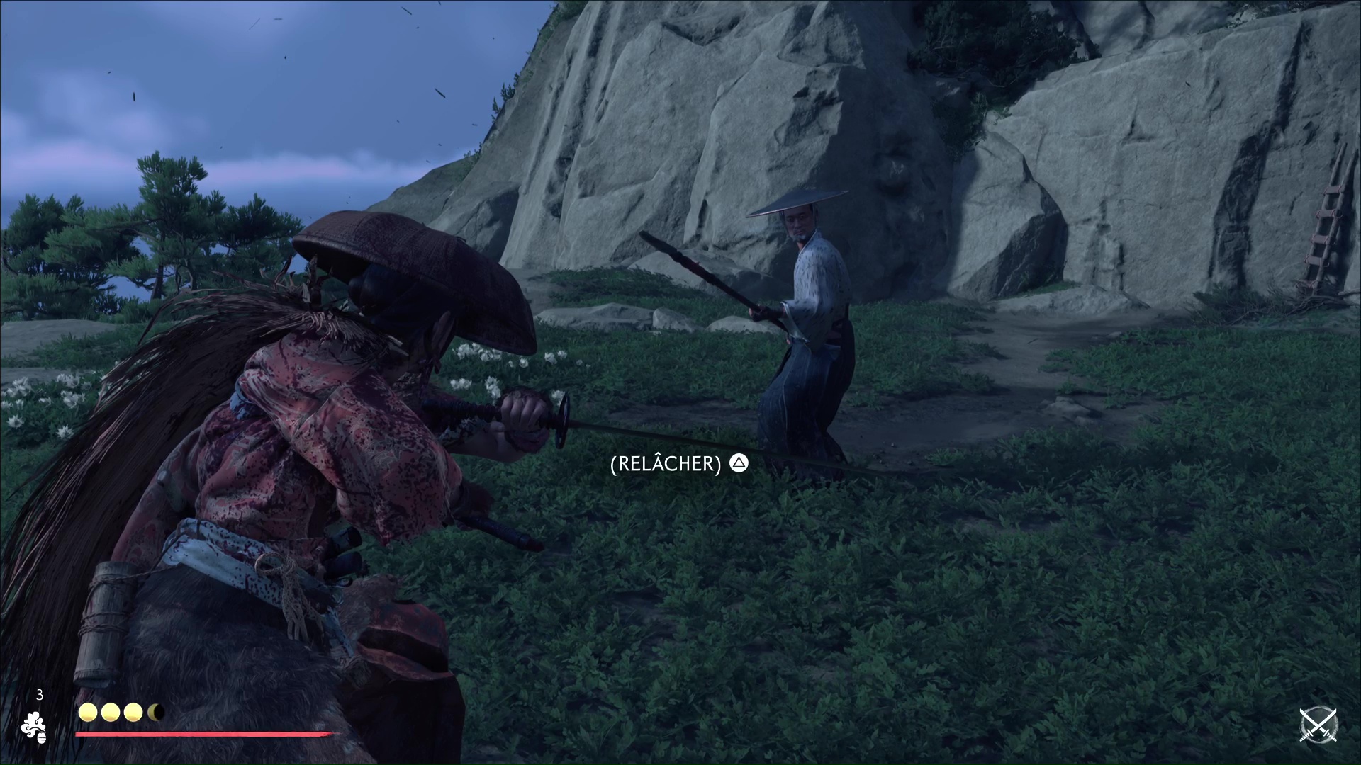 Suivez ce que vous avez appris : double katana pour les lances, katana contre katana. Une deuxième vague arrive ensuite, puis une troisième, avant qu’un ronin ne vienne vous menacer directement. Battez quelques hommes avant de lancer une attaque chargée sur le ronin suivie d’attaques successives.