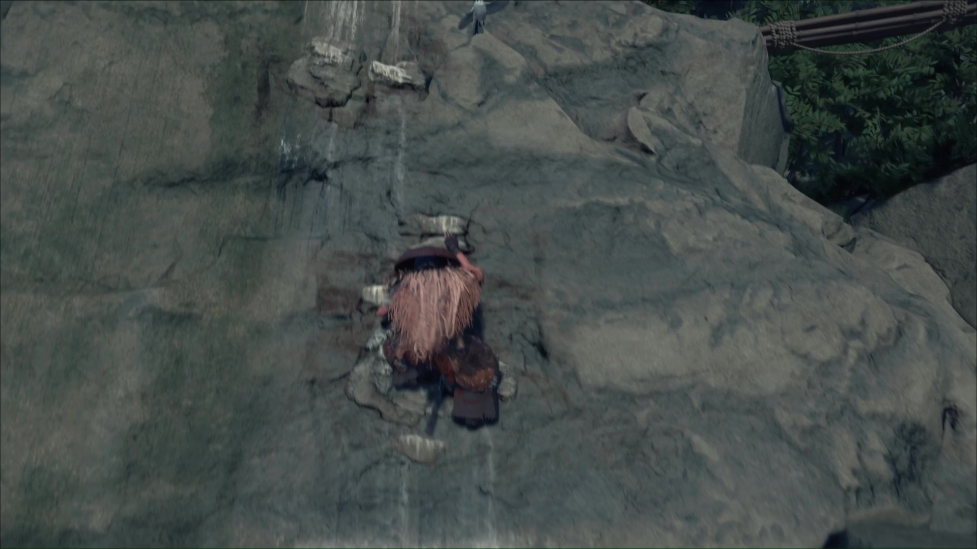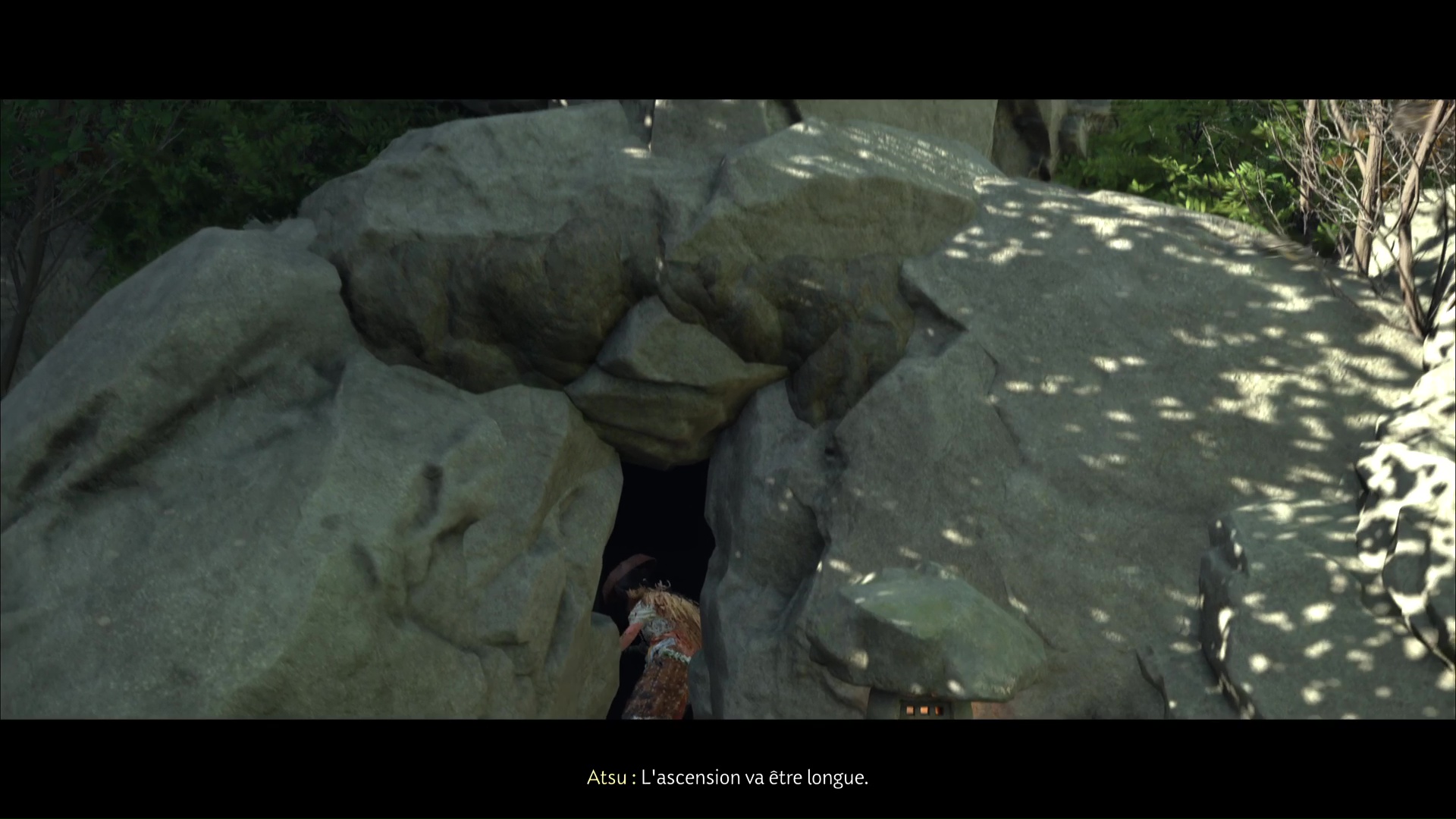 De retour au contrôle d’Atsu, suivez le sentier jusqu’à devoir escalader des prises murales, sur la droite. Hissez-vous puis accrochez-vous au tronc en face. Montez ensuite petit à petit la montagne jusqu’à devoir sauter au-dessus d’une pente glissante.