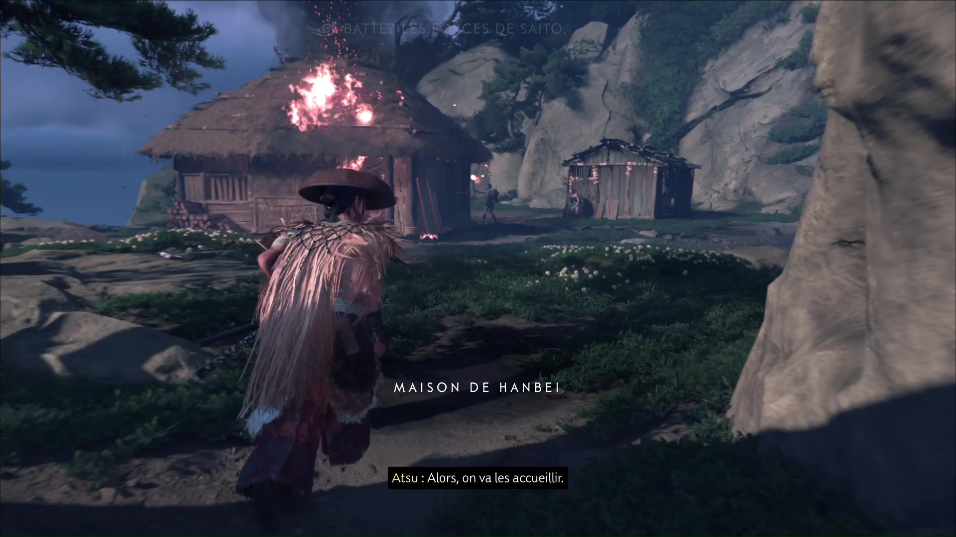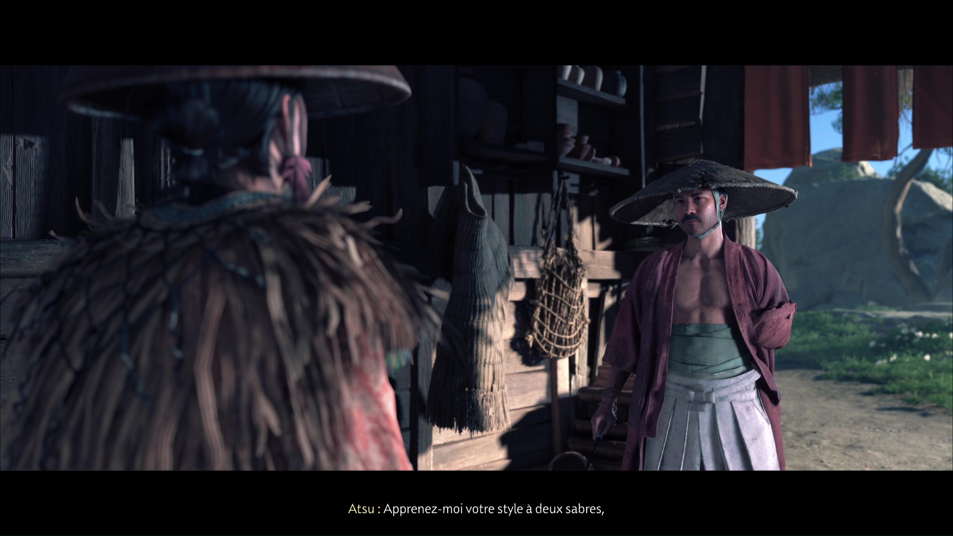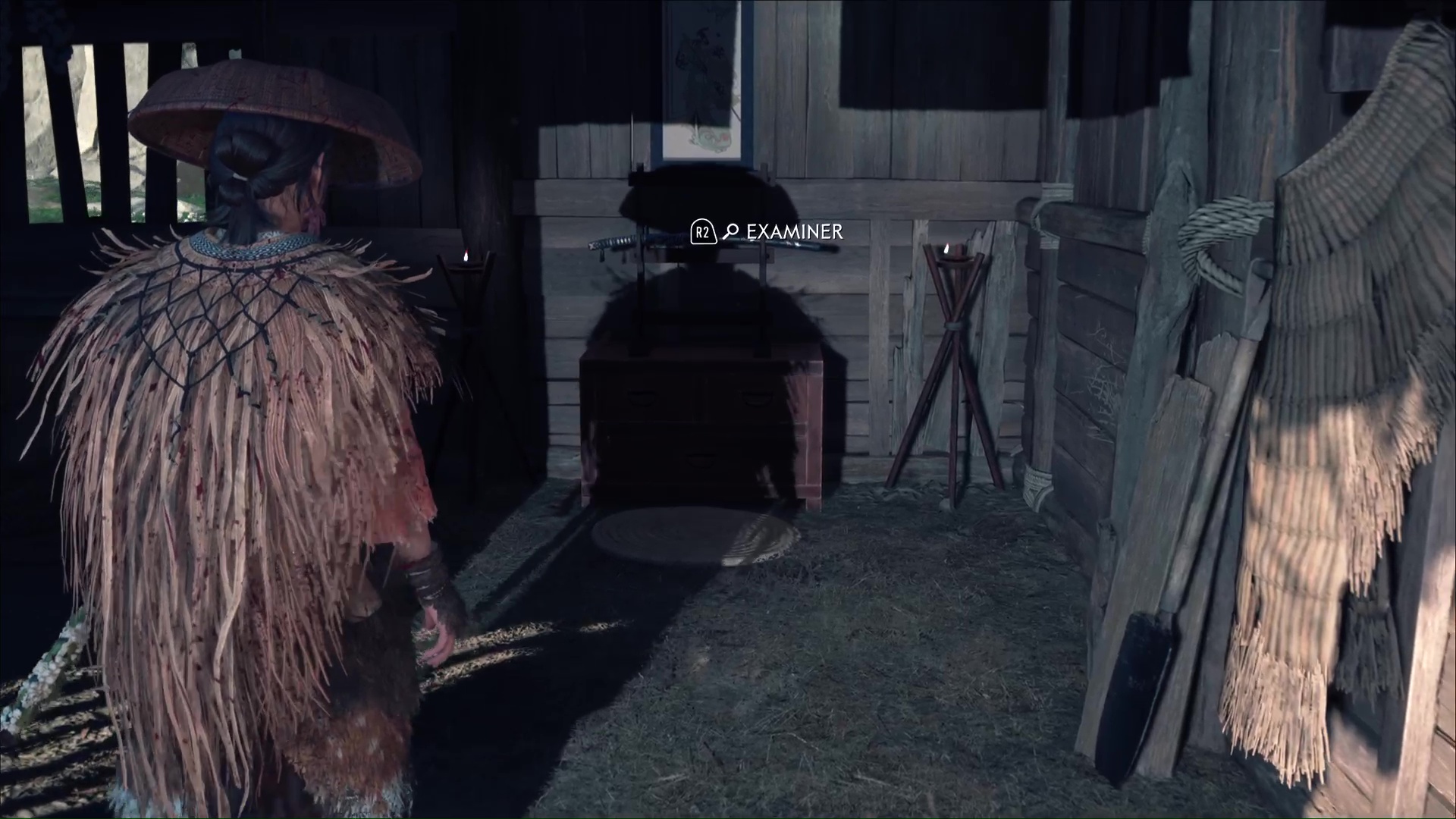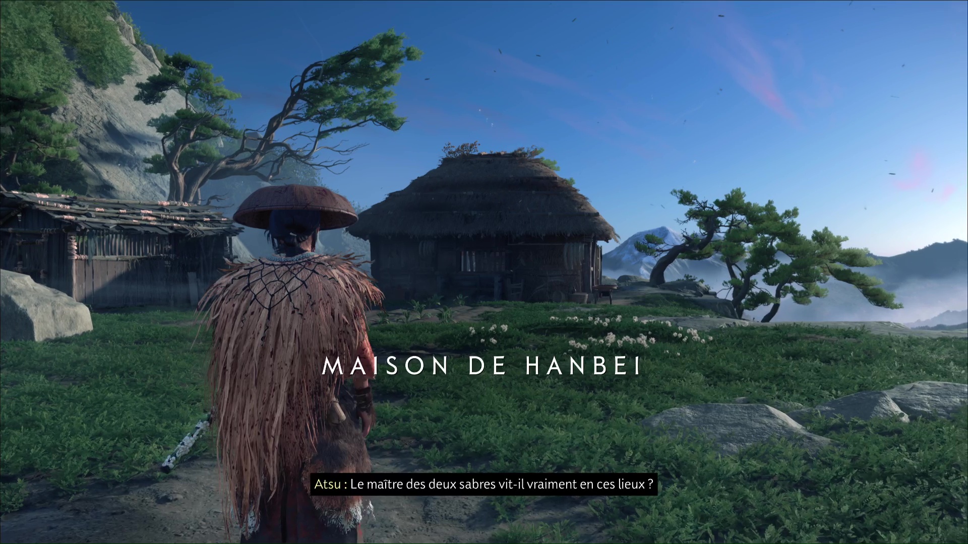 Une fois arrivé en haut, vous êtes arrivé chez Hanbei. Devant la maison, faites le tour pour entrer par derrière. Atsu remarquera un katana. Allez l’examiner avant qu’Hanbei ne débarque.