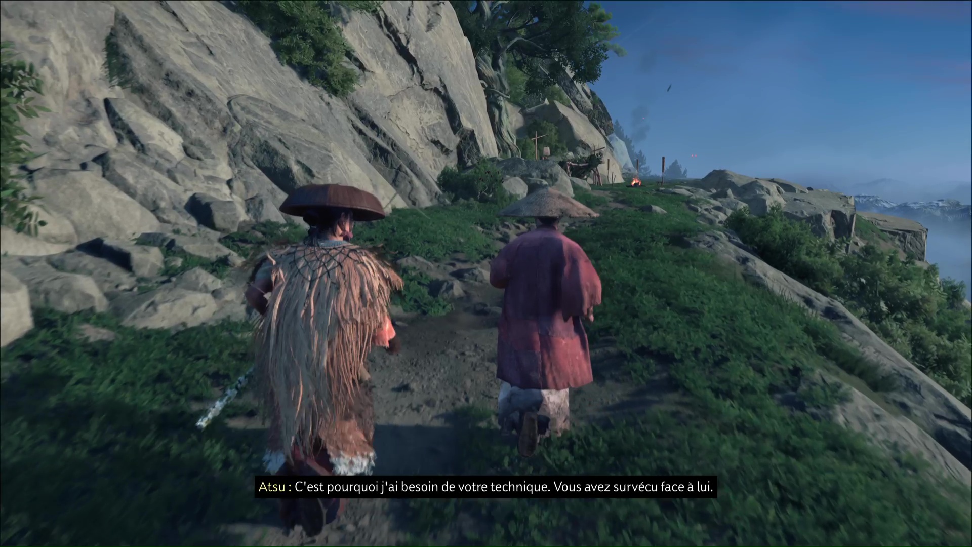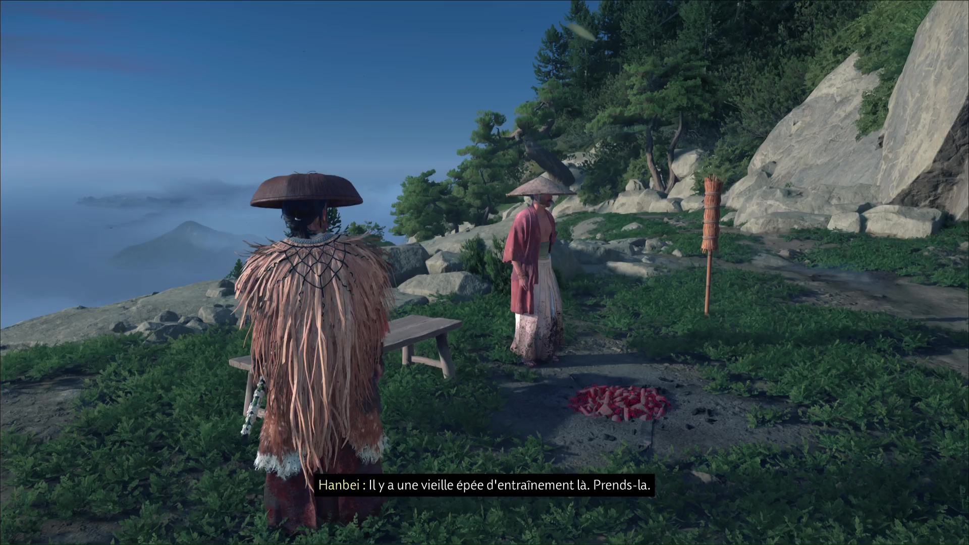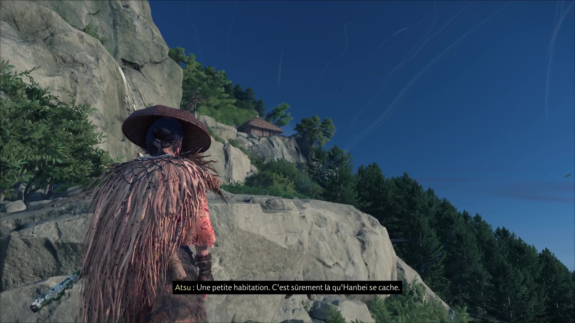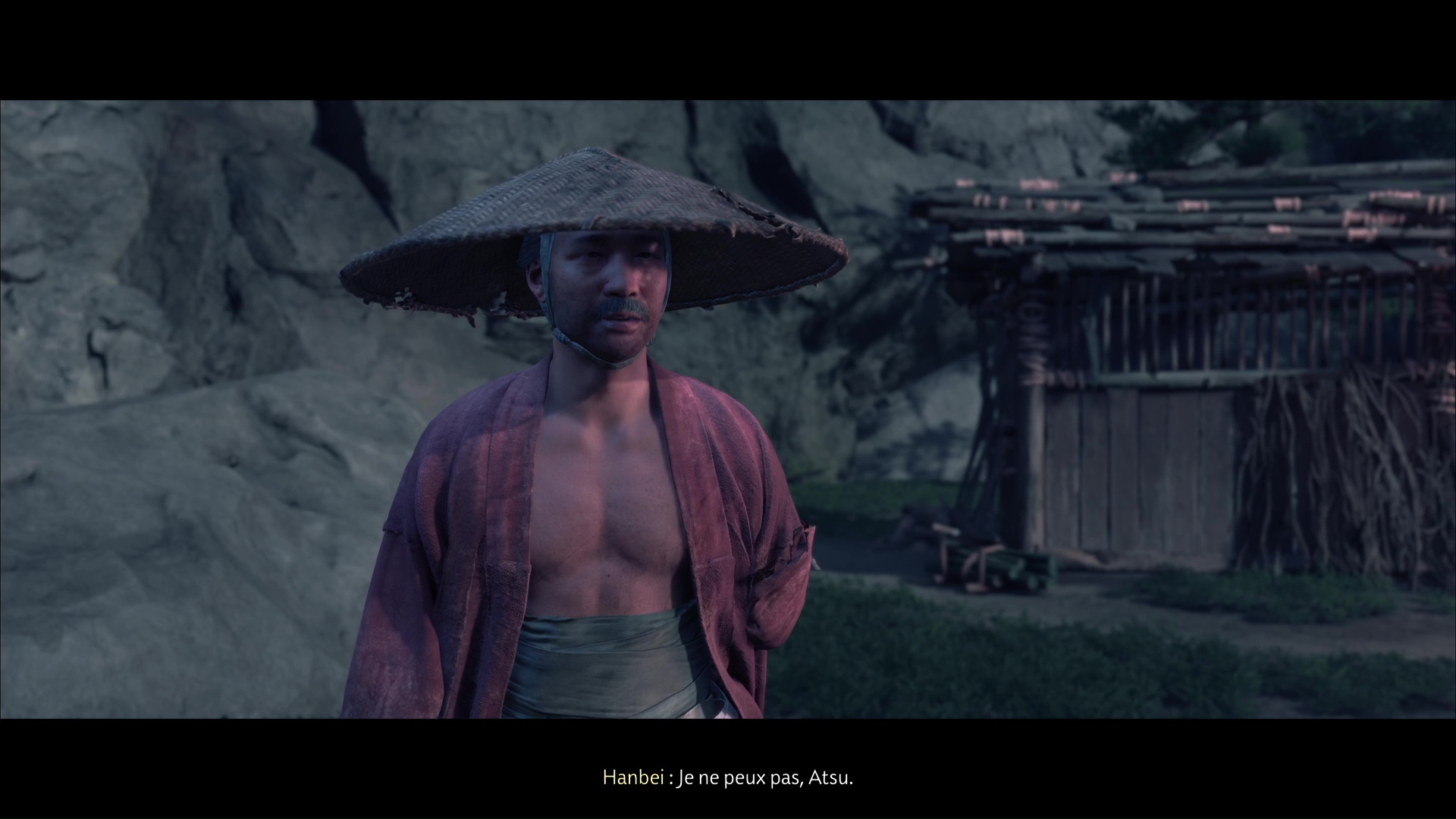Une fois arrivé en haut, vous êtes arrivé chez Hanbei. Devant la maison, faites le tour pour entrer par derrière. Atsu remarquera un katana. Allez l’examiner avant qu’Hanbei ne débarque.