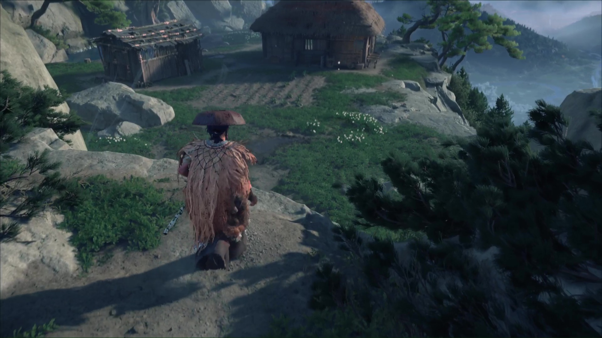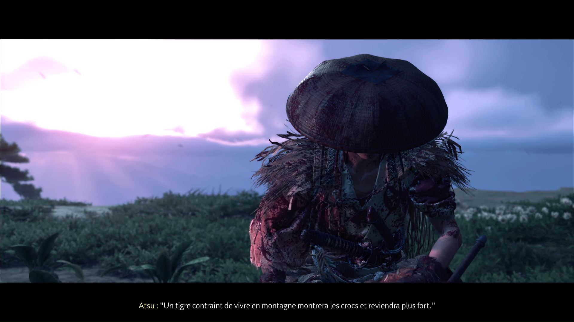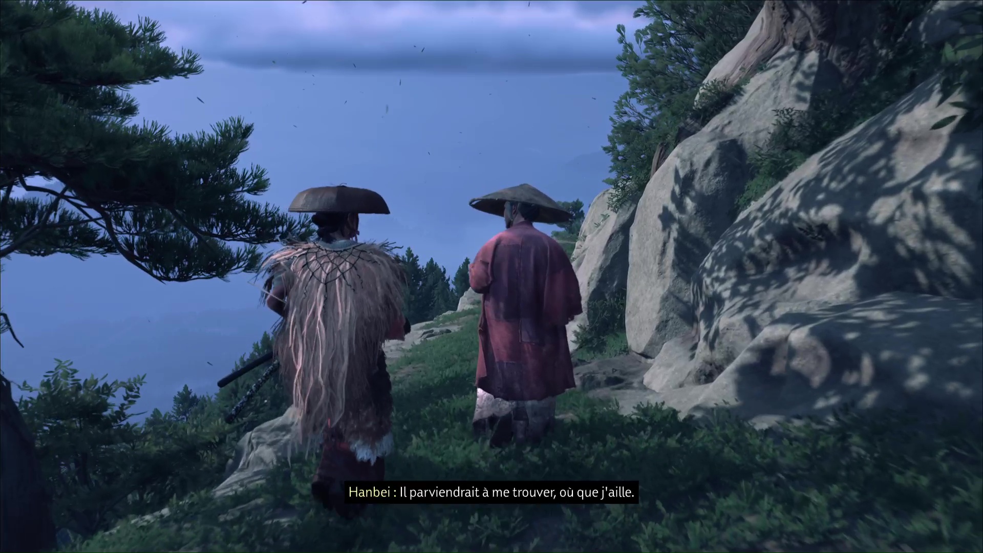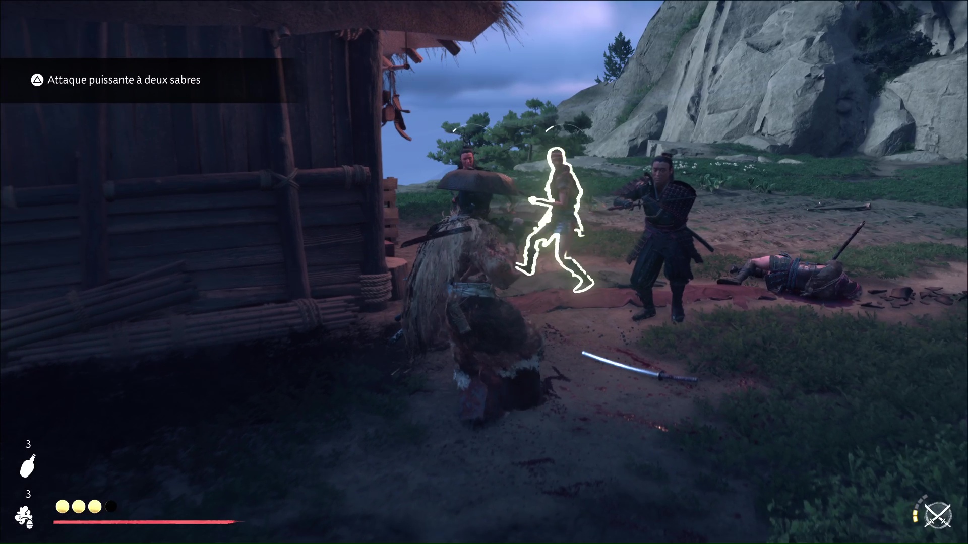 Une fois arrivé en haut, vous êtes arrivé chez Hanbei. Devant la maison, faites le tour pour entrer par derrière. Atsu remarquera un katana. Allez l’examiner avant qu’Hanbei ne débarque.