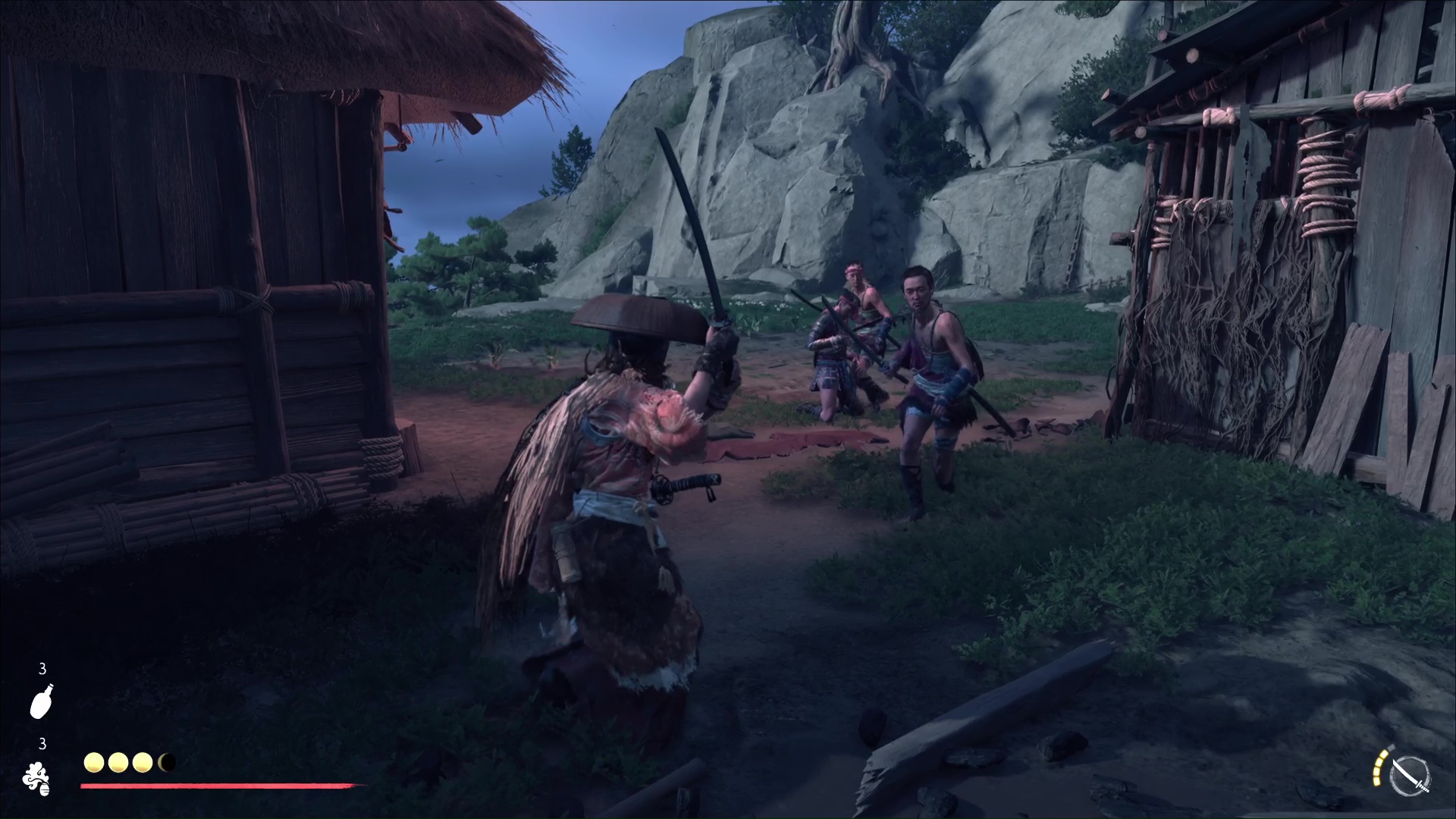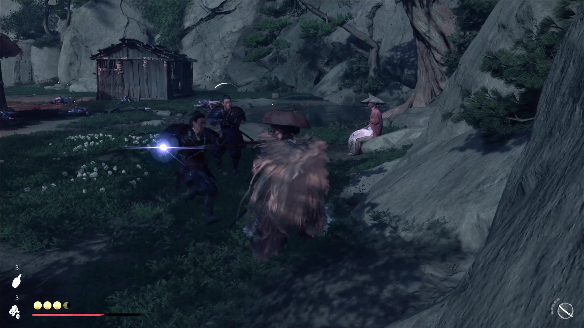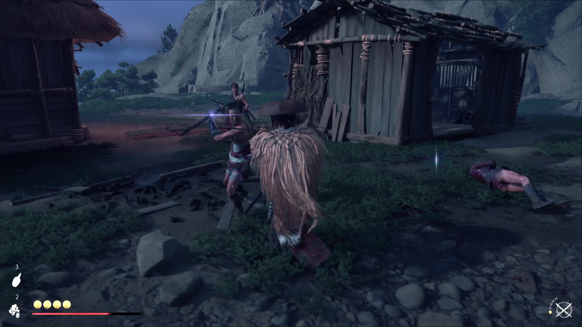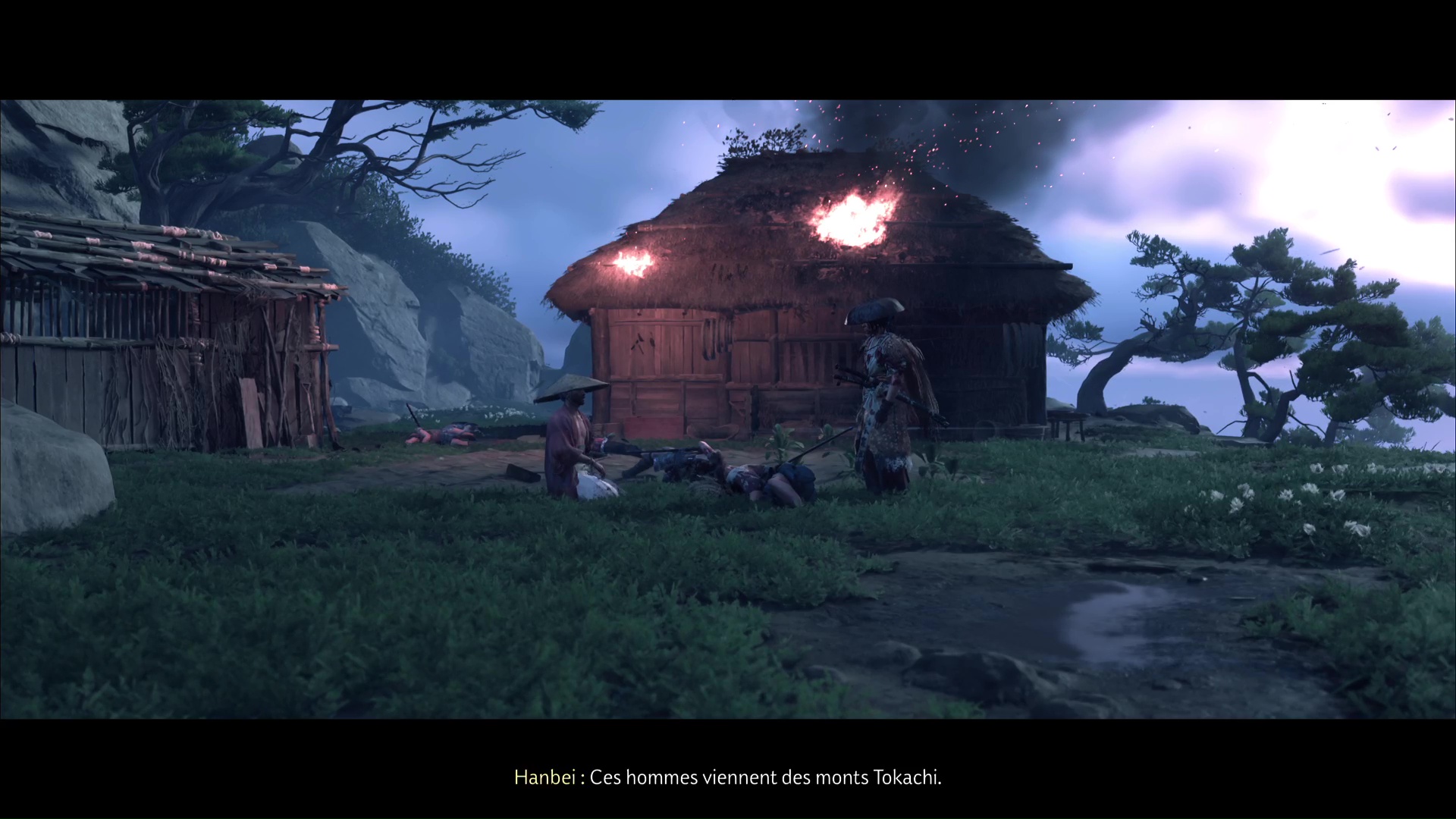 Une fois arrivé en haut, vous êtes arrivé chez Hanbei. Devant la maison, faites le tour pour entrer par derrière. Atsu remarquera un katana. Allez l’examiner avant qu’Hanbei ne débarque.