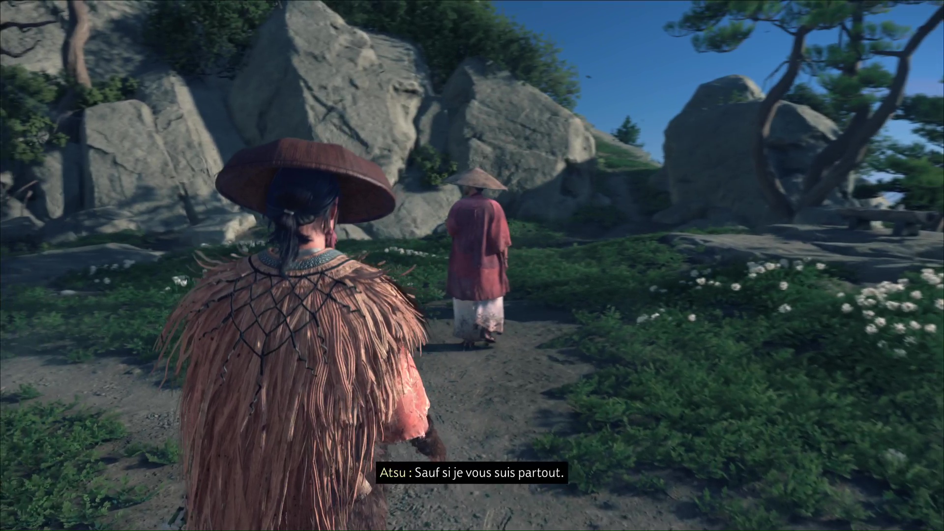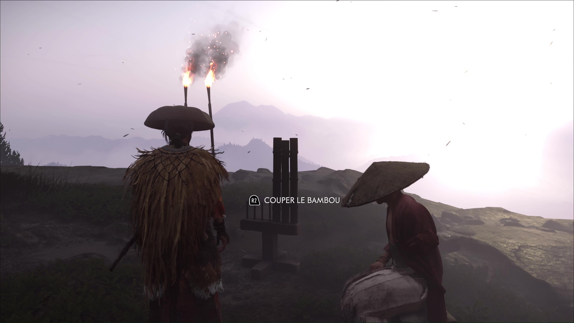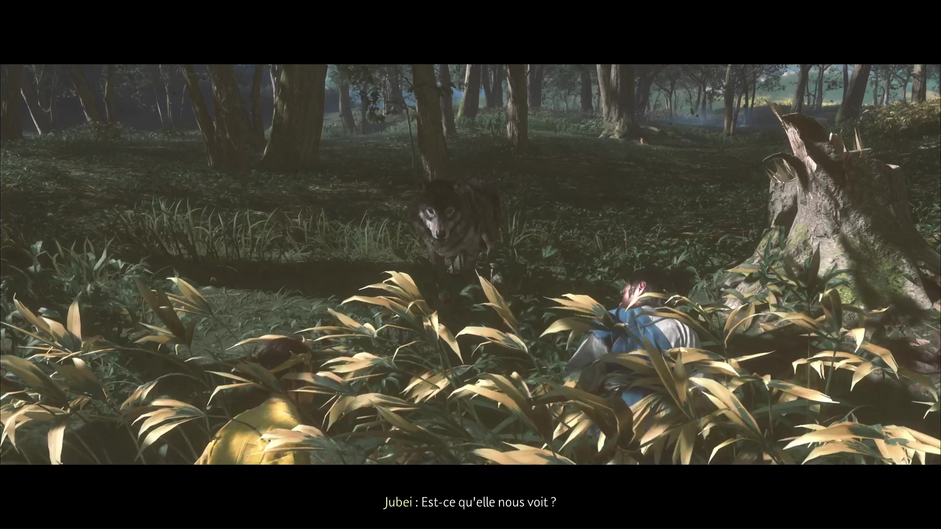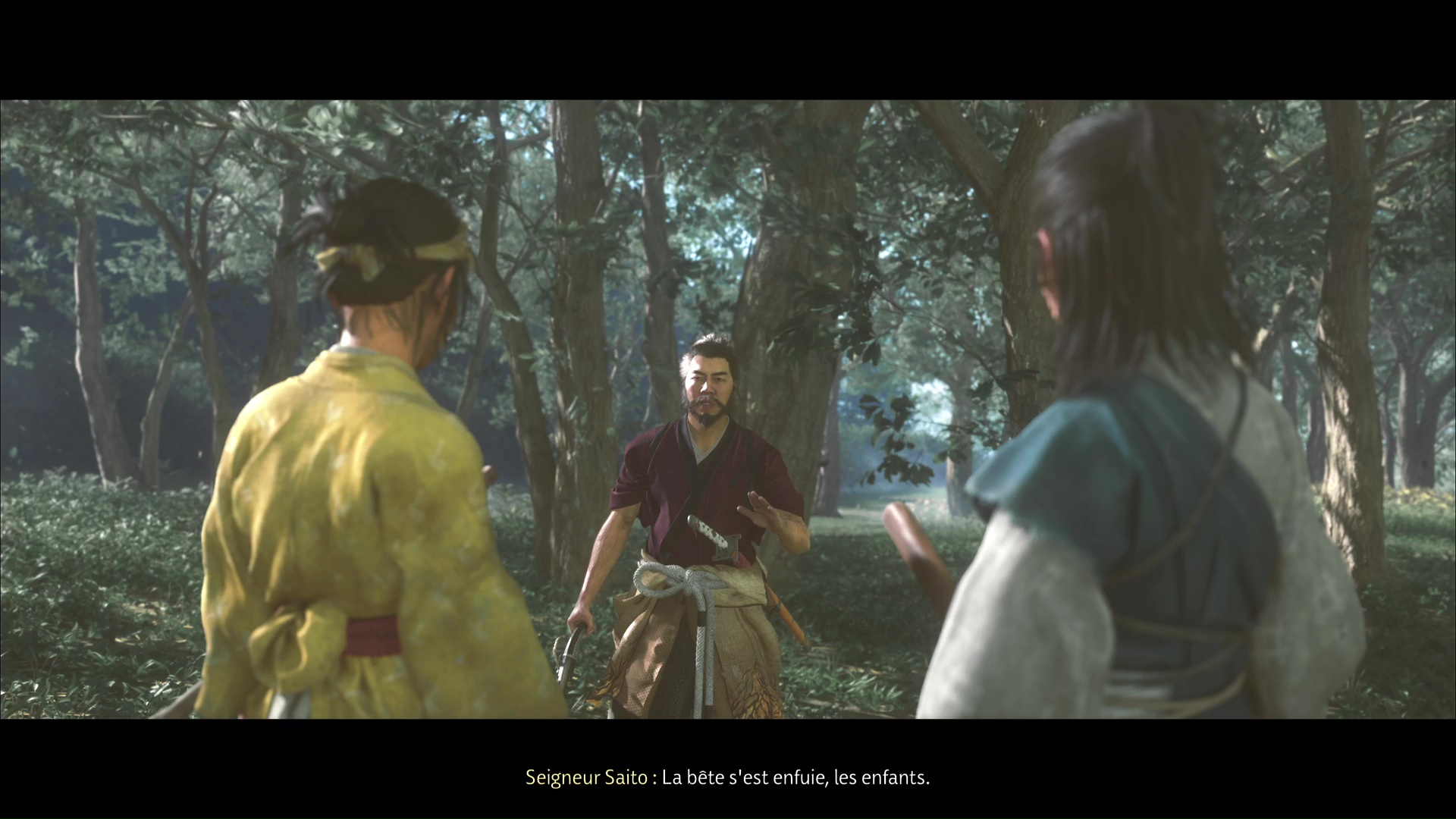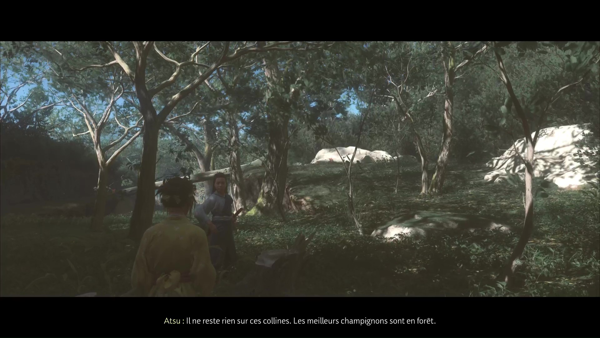 Après un peu de repos, c’est reparti pour du découpage de bambou. Cette fois, la séquence est plus facile et, que vous réussissiez ou non, une cinématique se lance la nuit suivante. Un flashback jouable en découle, où vous retrouvez Atsu et Jubei en promenade forestière.