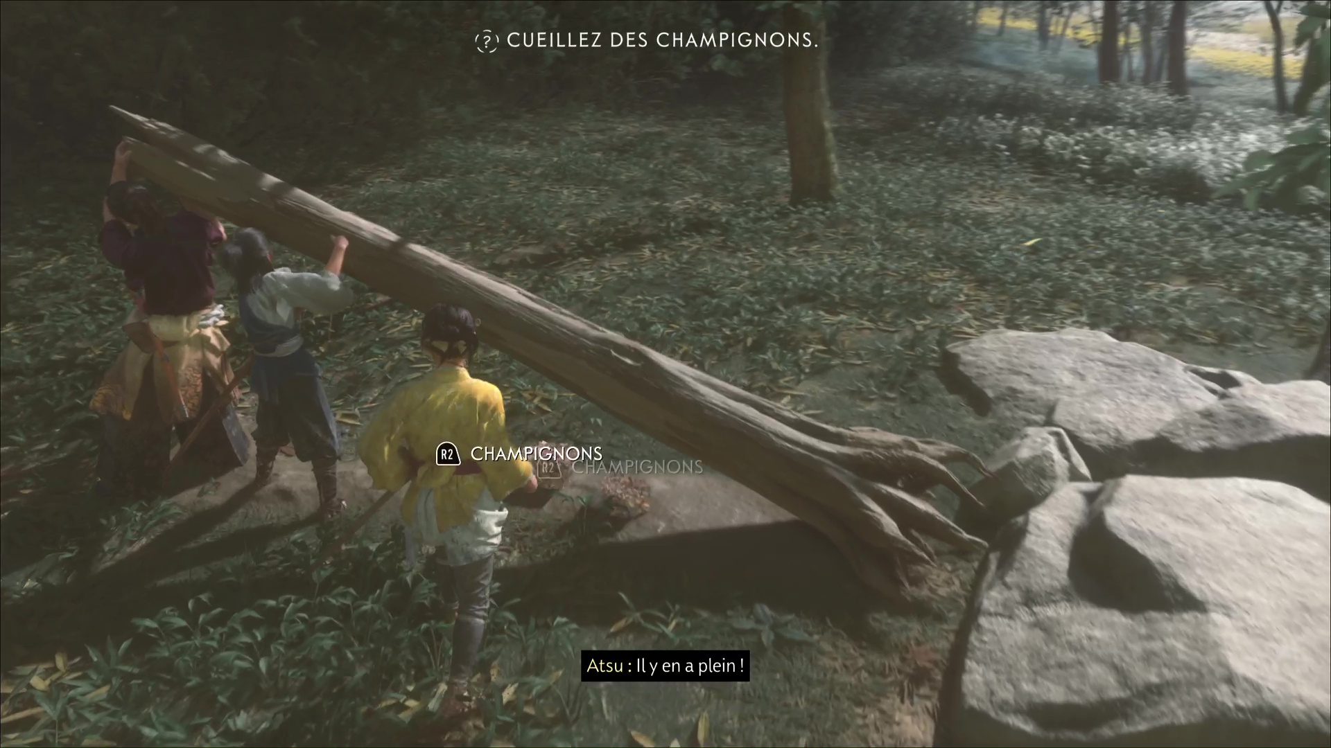Cueillez quelques champignons et avancez jusqu’à la louve que Jubei a repéré. Soudain, un tir retentit, c’est le Seigneur Saito. Reprenez la route en sa compagnie et cueillez les champignons quand Jubei et Saito soulèveront l’arbre mort.