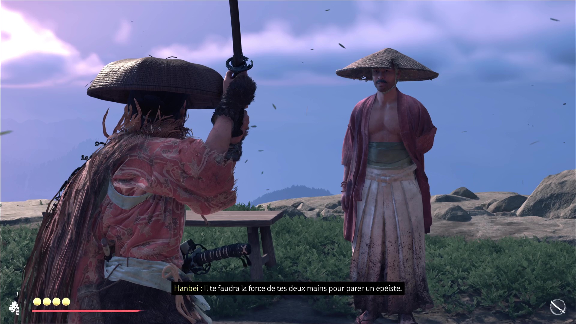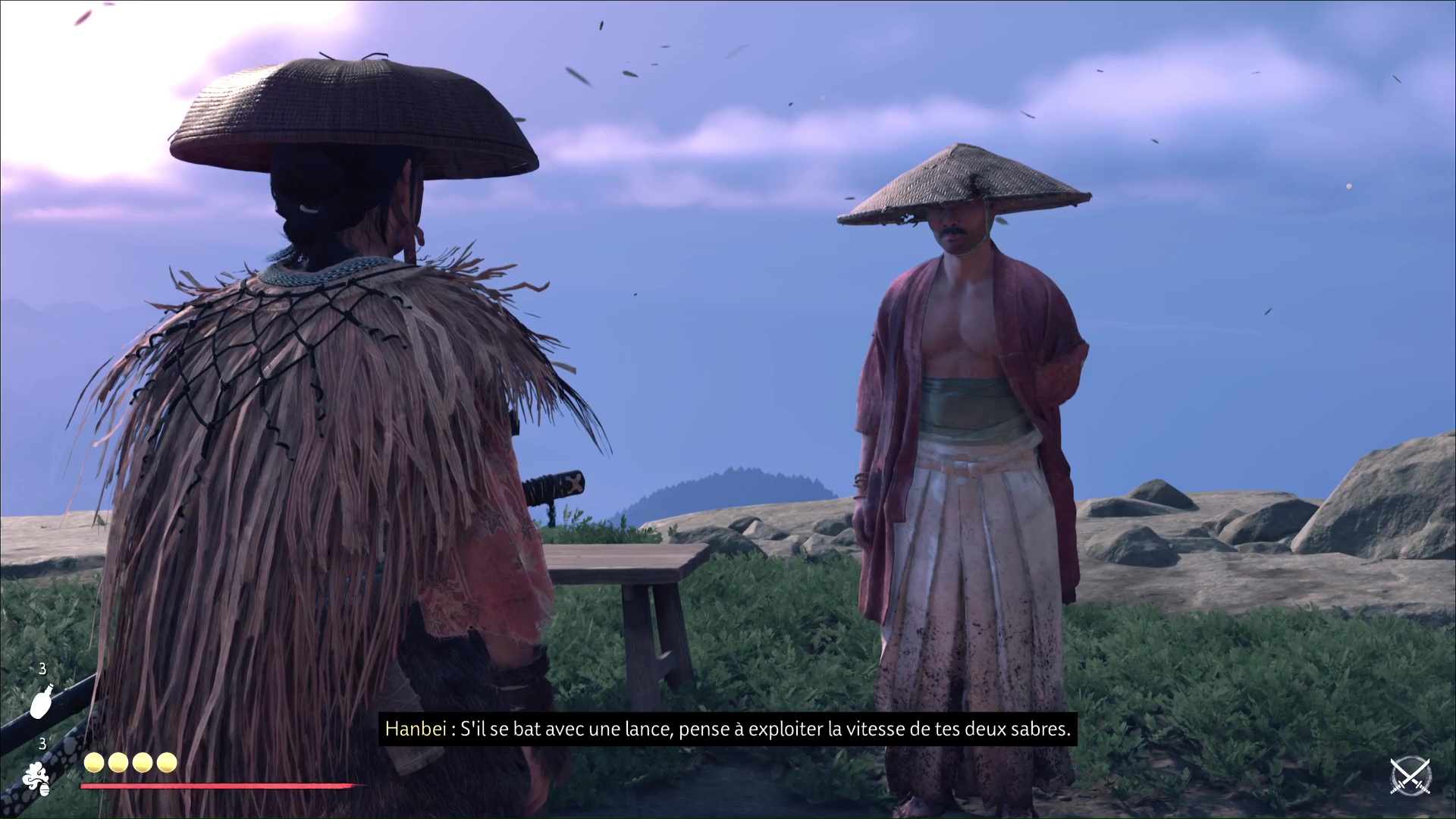 Hanbei vous conseille d’utiliser le double katana contre les ennemis équipés d’une lance. Sortez le katana quand il vous demandera la meilleure arme contre un autre katana, puis sortez les doubles lames quand il s’agira d’équiper la bonne arme face aux lances.