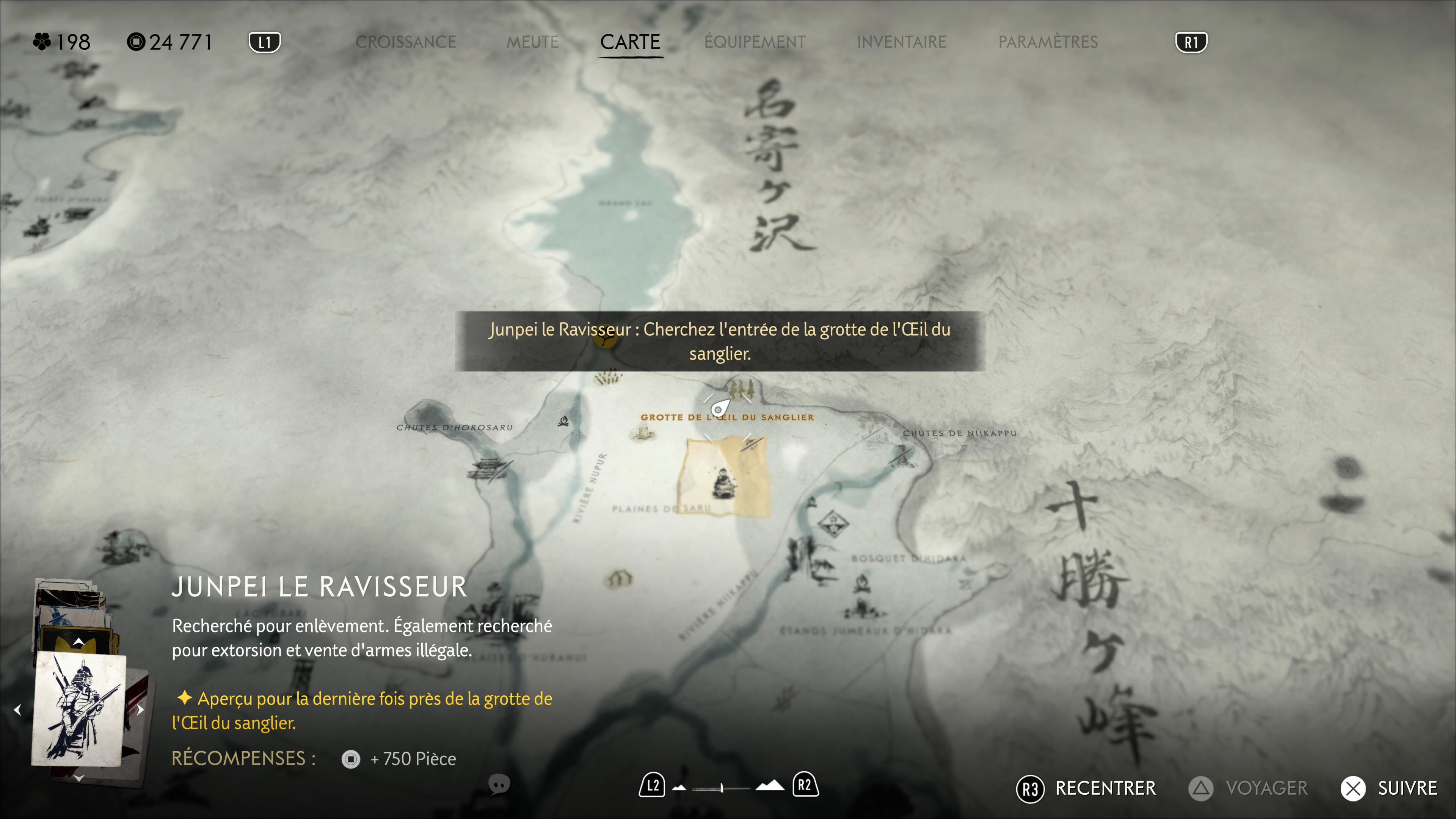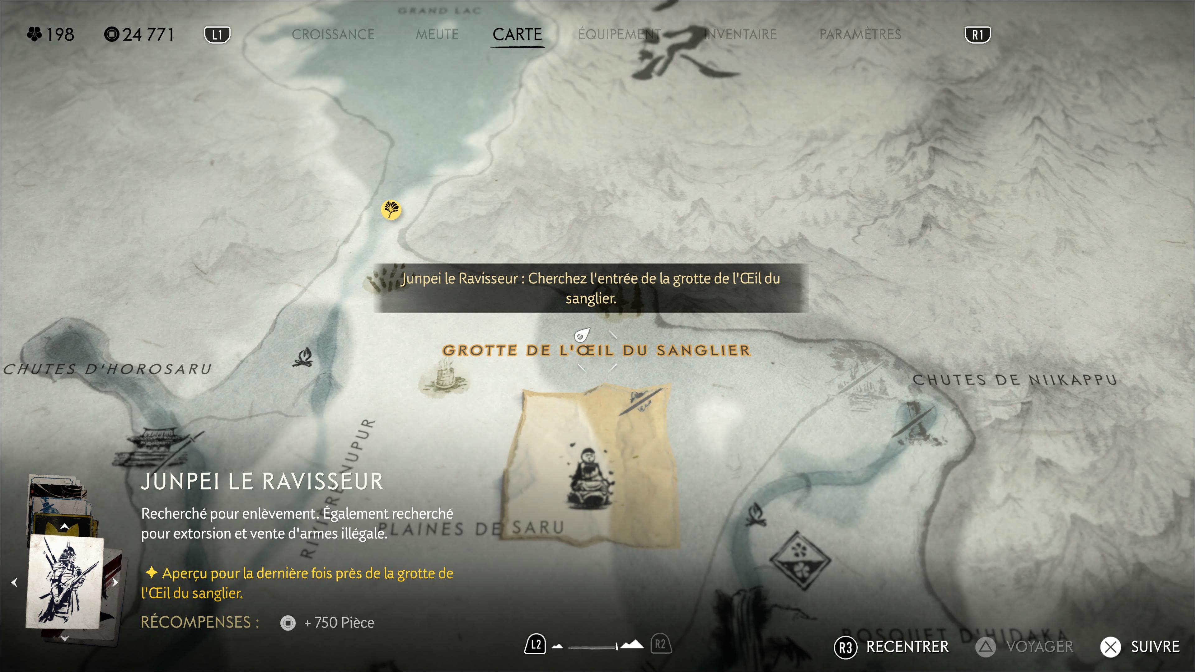 Enfin, une autre prime est à débusquer et à tuer, et il s’agit de Junpei le Ravisseur. Vous le trouverez vers le nord de la région, en passant par la Grotte de l’Œil du sanglier.
