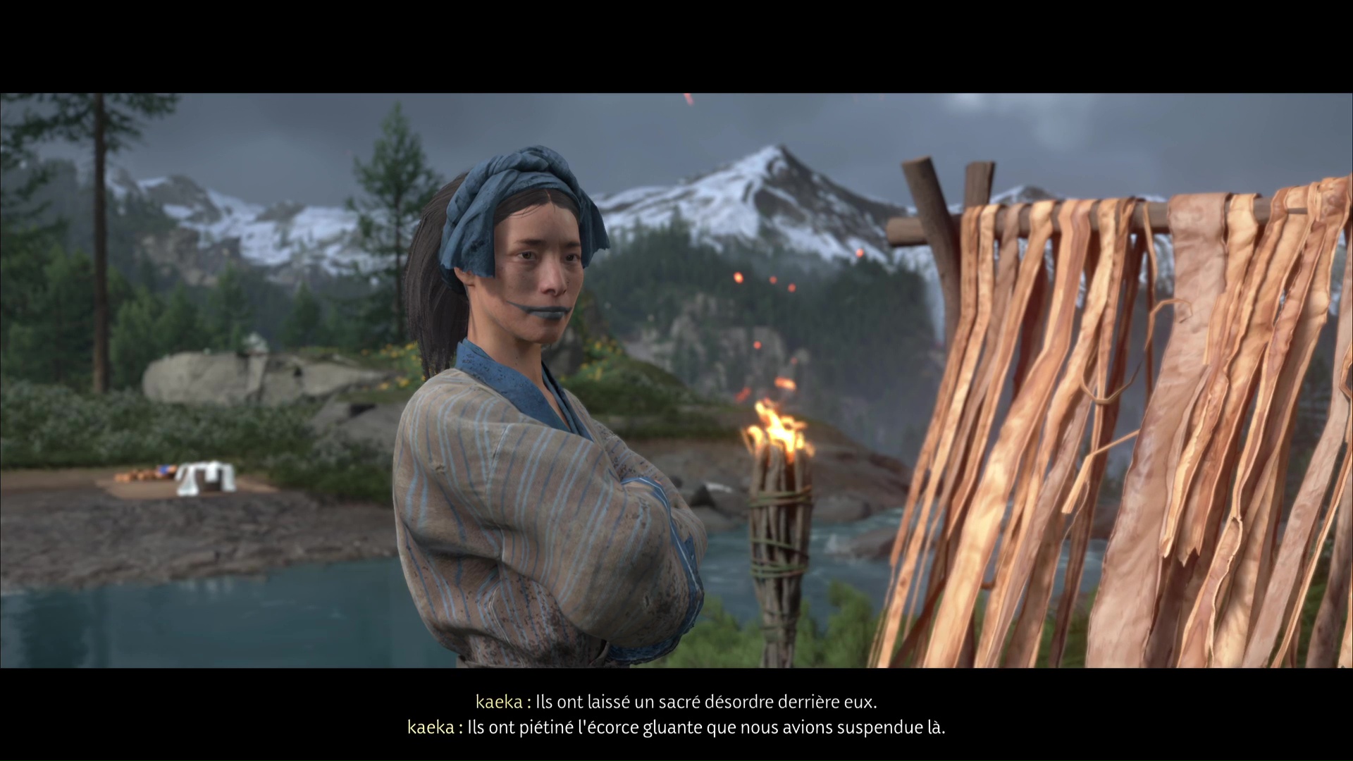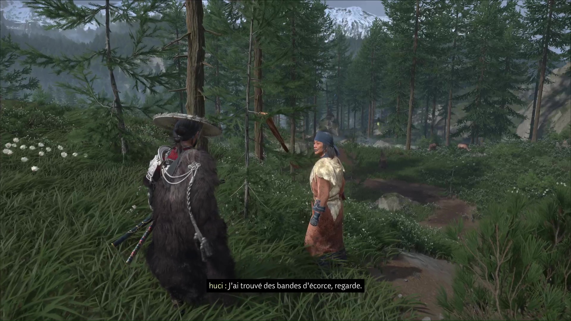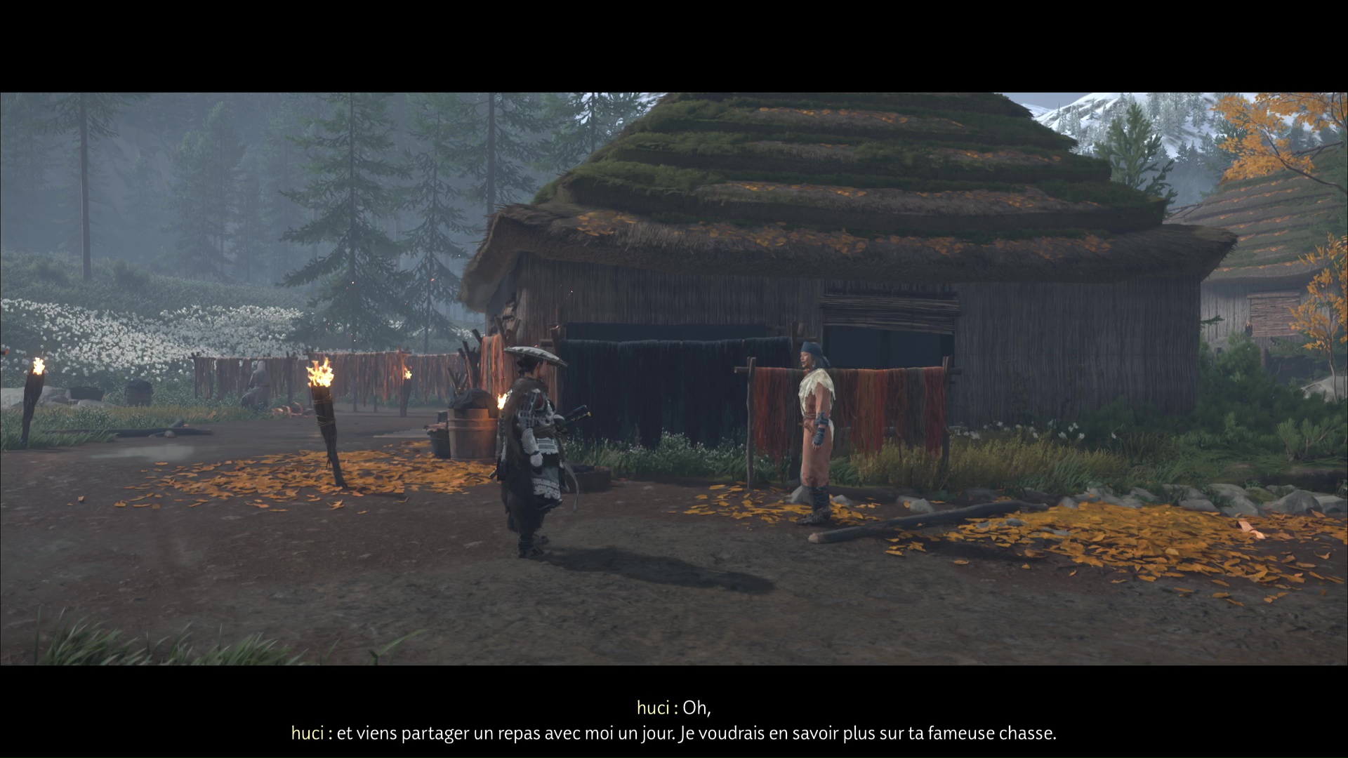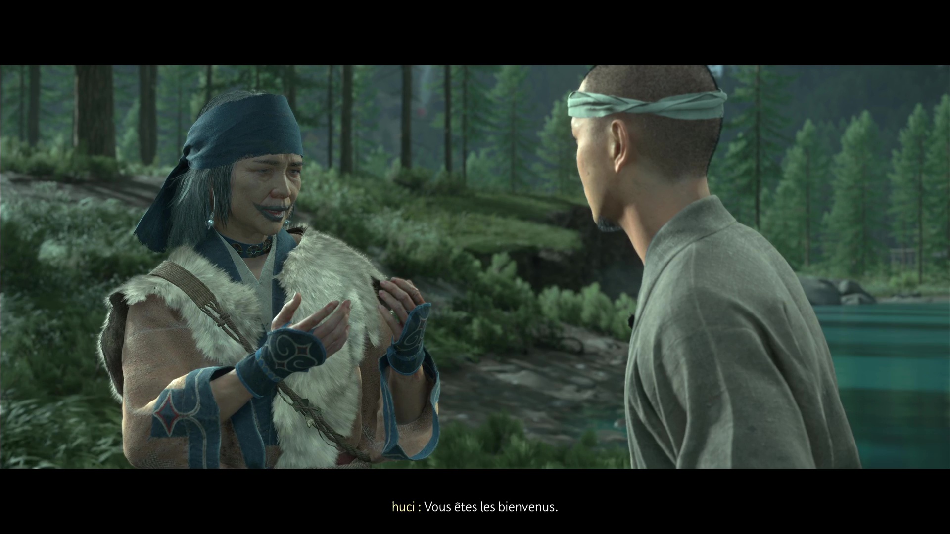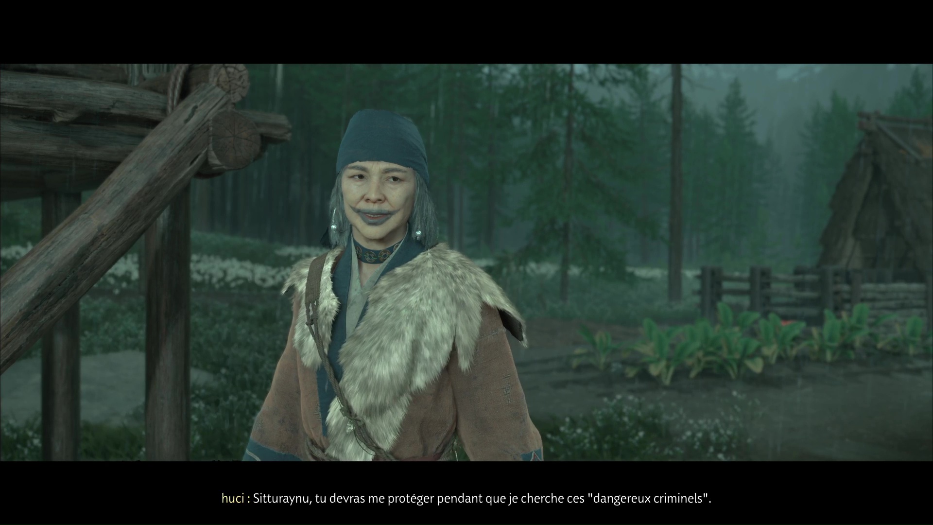 Débarquer dans les Terres sauvages de Nayoro délivre une parenthèse dans l’histoire principale de Ghost of Yōtei et offre un moment relativement dépaysant. En effet, c’est ici que réside une grande partie de la communauté aïnoue que vous pouvez croiser dans le jeu. L’une d’entre elle, nommée huci, vous a accompagné jusqu’à son village. Et maintenant, elle a besoin d’Atsu pour traquer des criminels.
