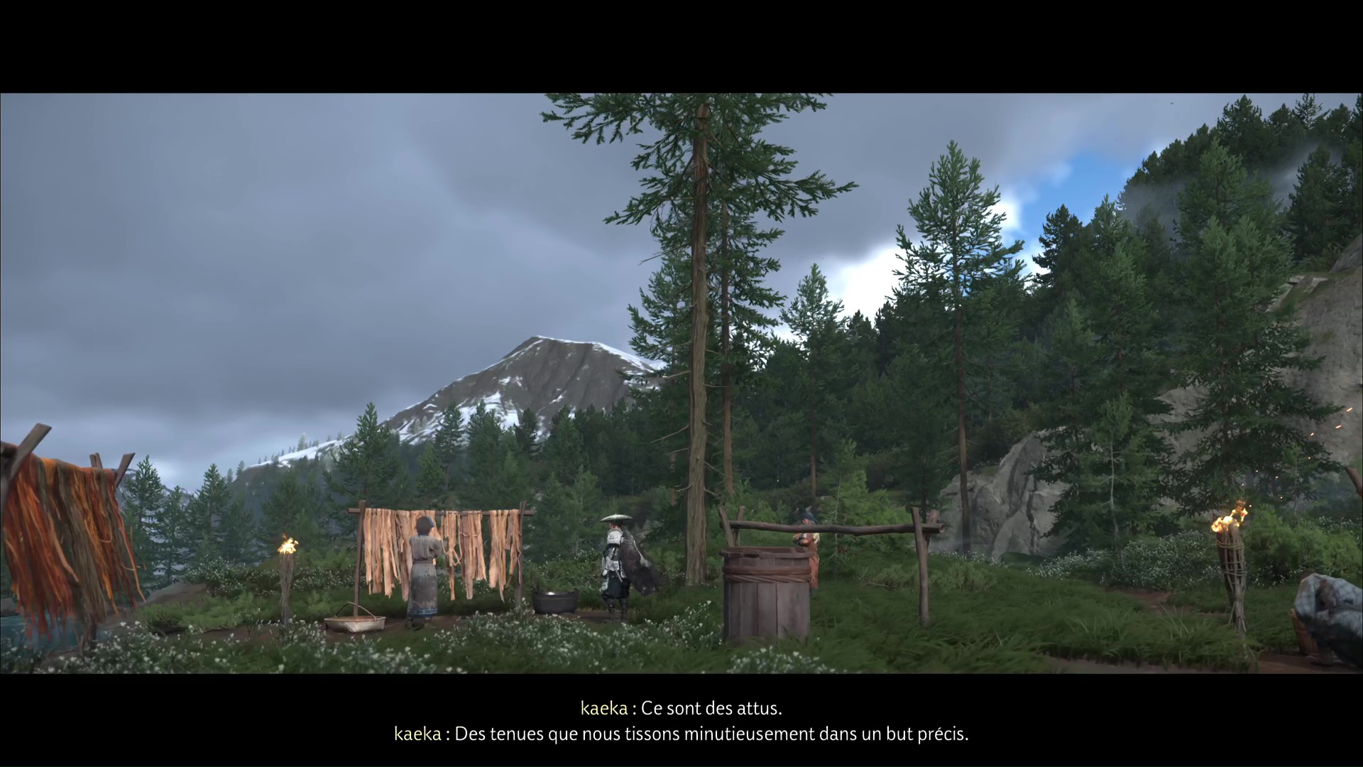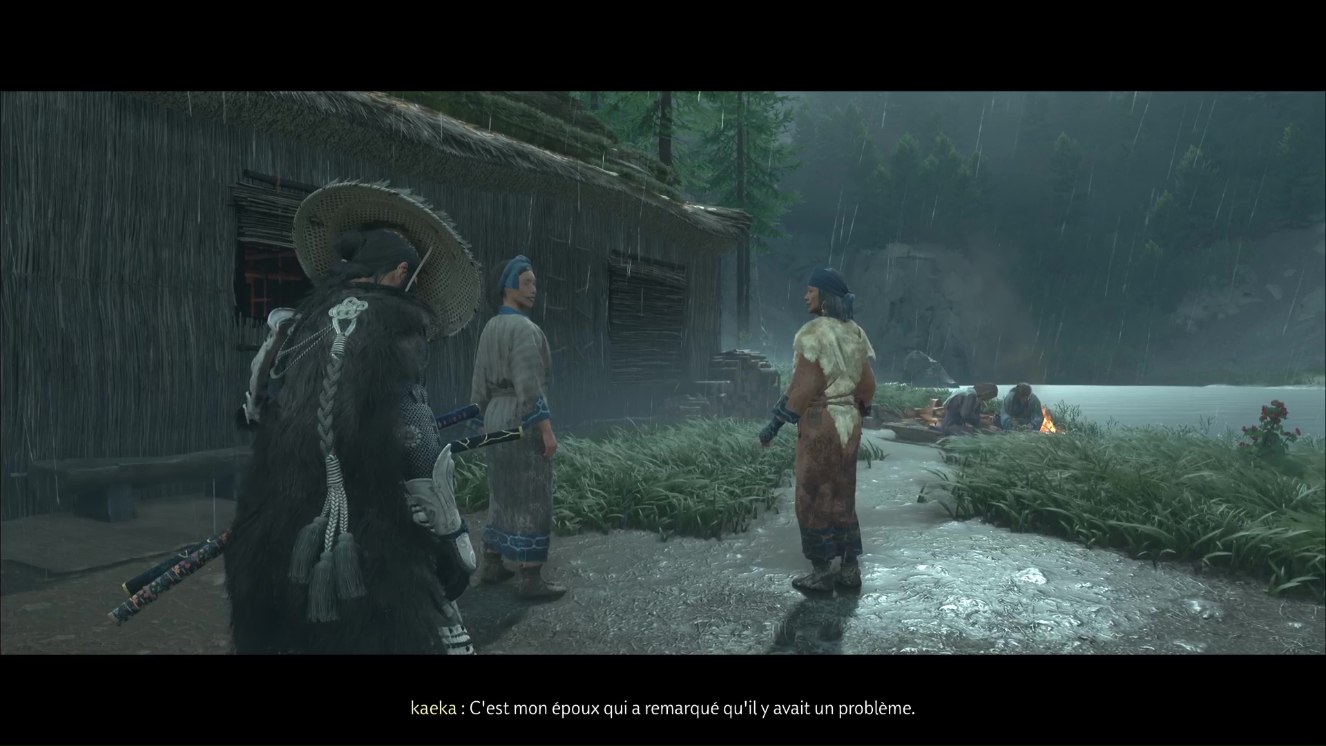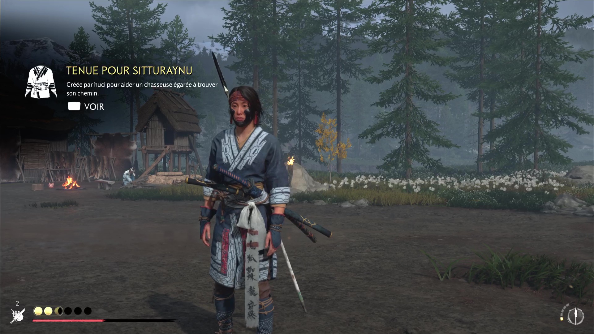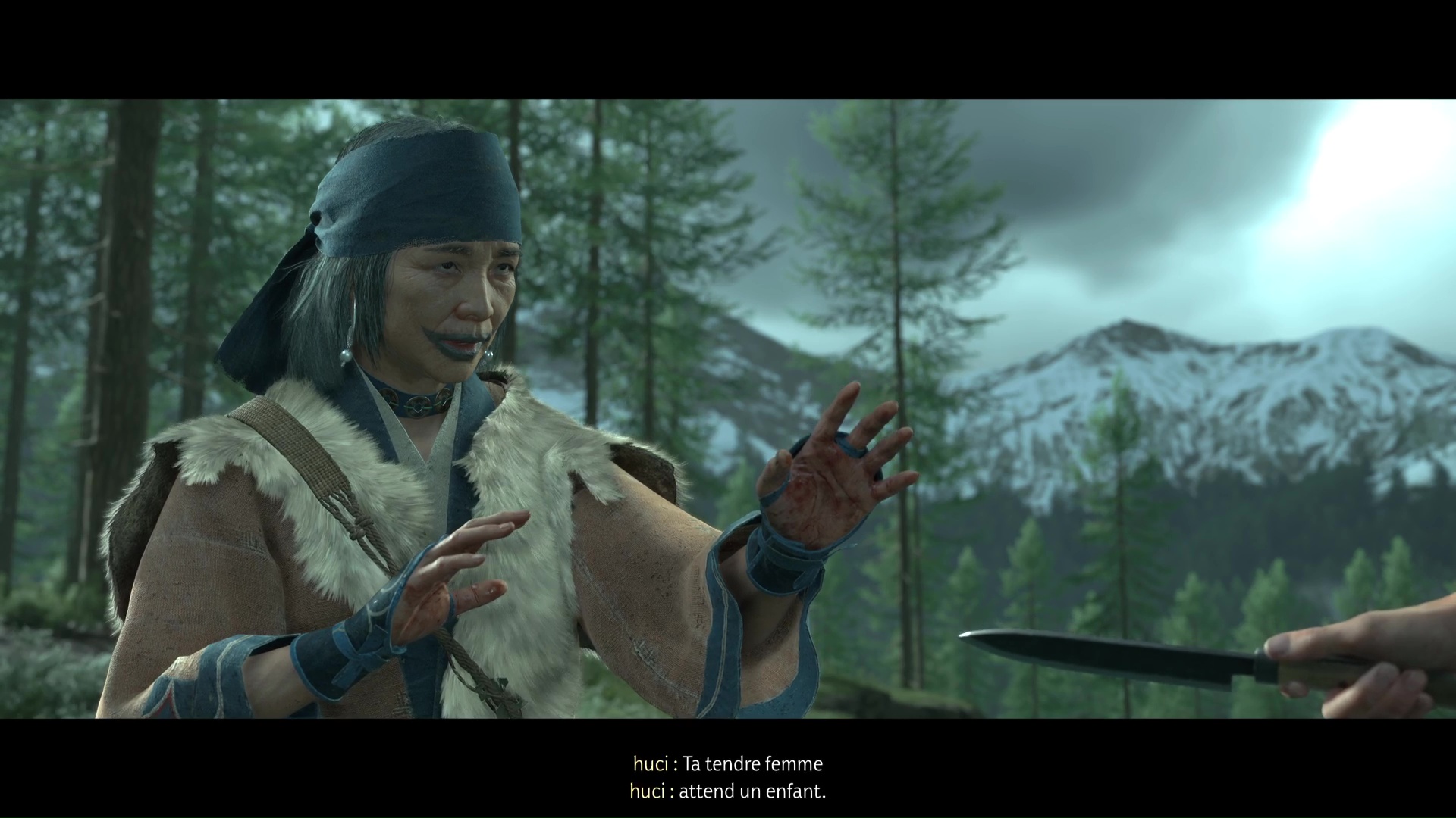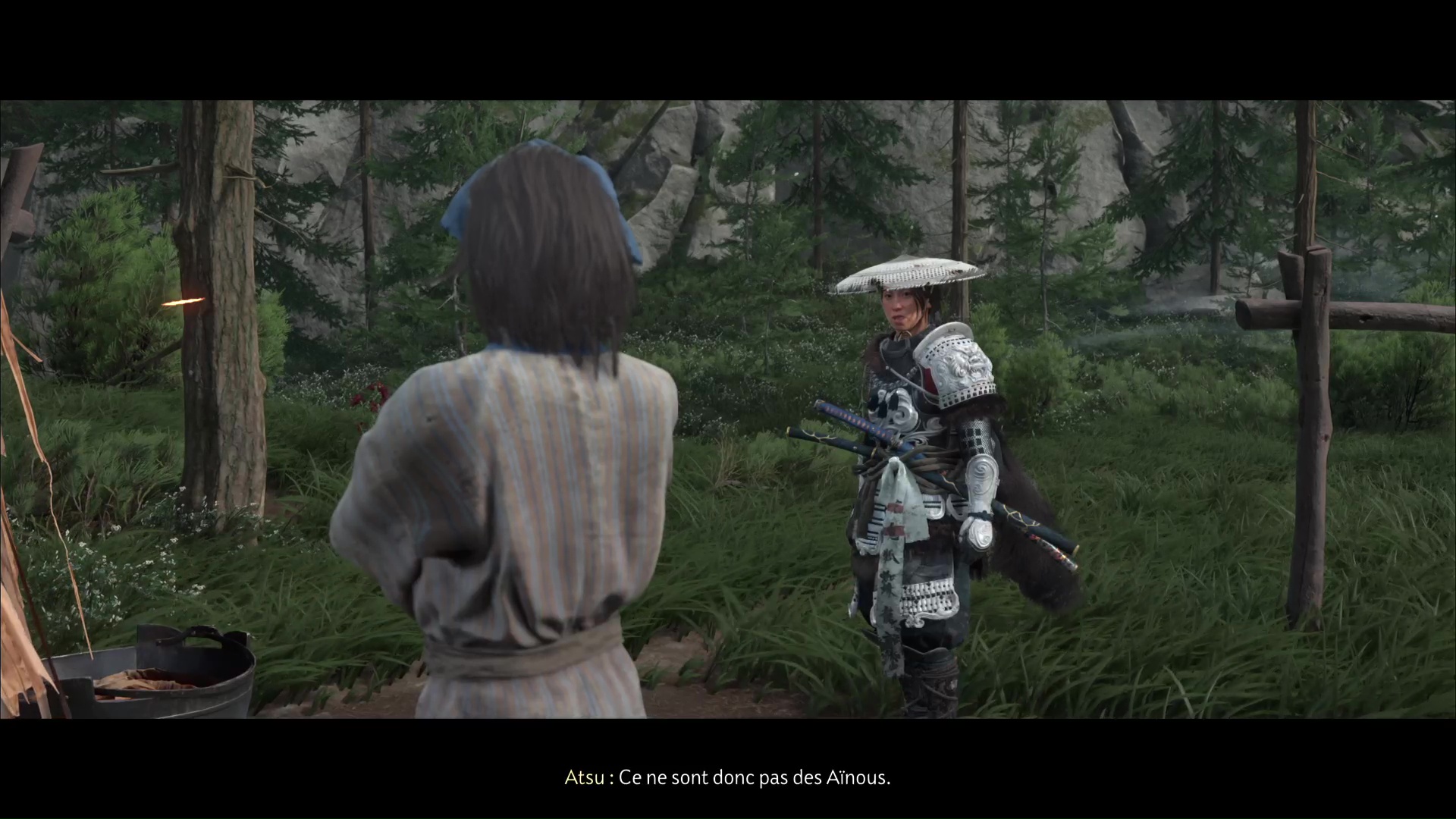Débarquer dans les Terres sauvages de Nayoro délivre une parenthèse dans l’histoire principale de Ghost of Yōtei et offre un moment relativement dépaysant. En effet, c’est ici que réside une grande partie de la communauté aïnoue que vous pouvez croiser dans le jeu. L’une d’entre elle, nommée huci, vous a accompagné jusqu’à son village. Et maintenant, elle a besoin d’Atsu pour traquer des criminels.