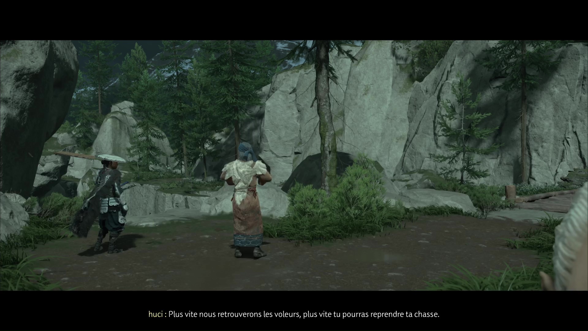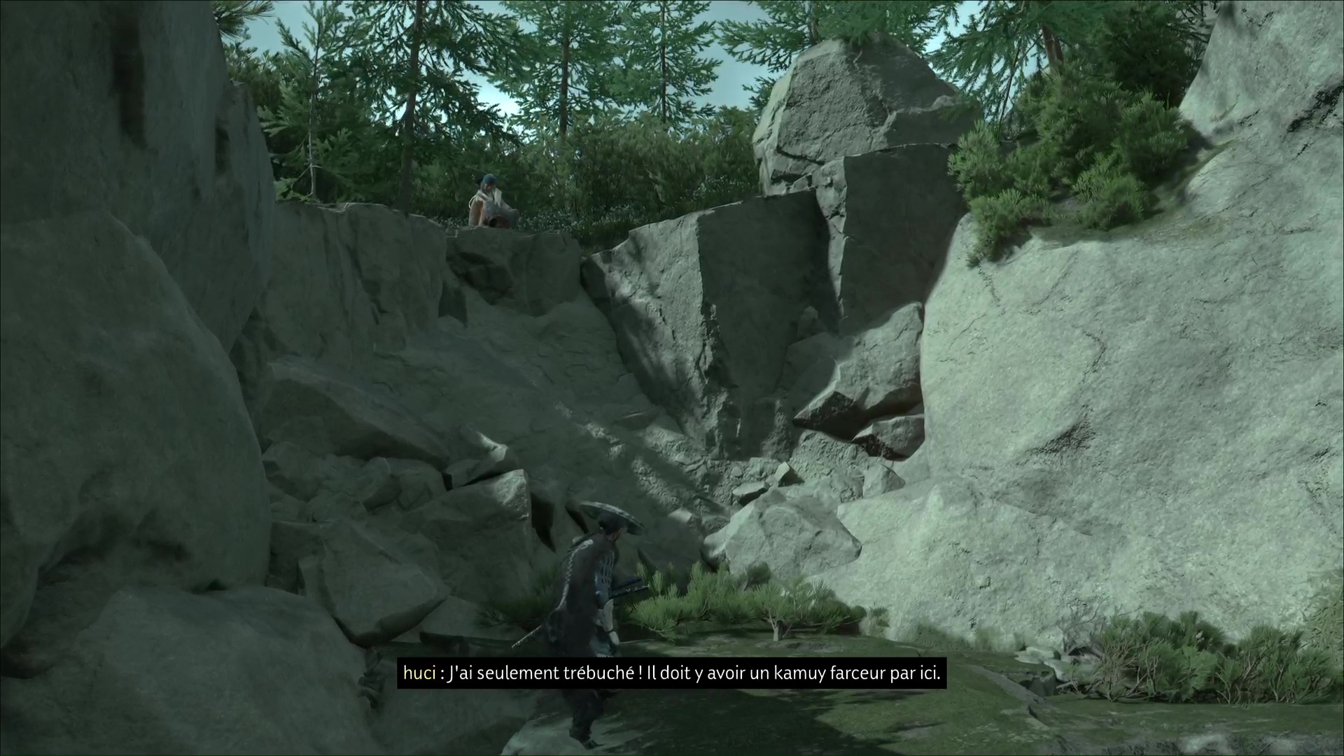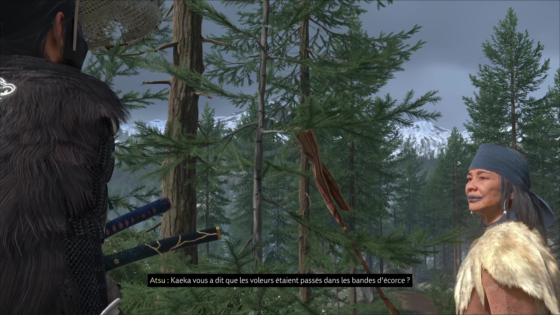 Retrouvez-la ensuite à Husko Kotan dans les hauteurs du village, en train de discuter avec son fils. Parlez-lui pour lancer le récit. Elle souhaite traquer des criminels et Atsu ne va pas laisser une vieille femme s’aventurer toute seule dans ce genre de péripéties. Vous la retrouverez légèrement au sud-est, derrière les chutes de Nayoro.