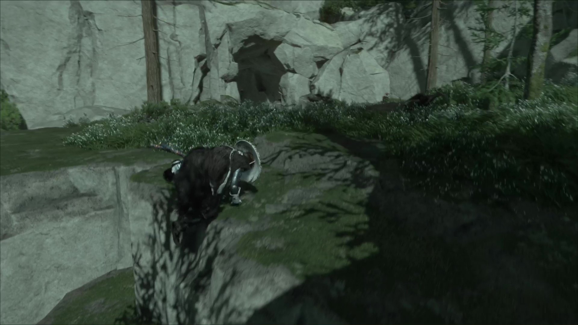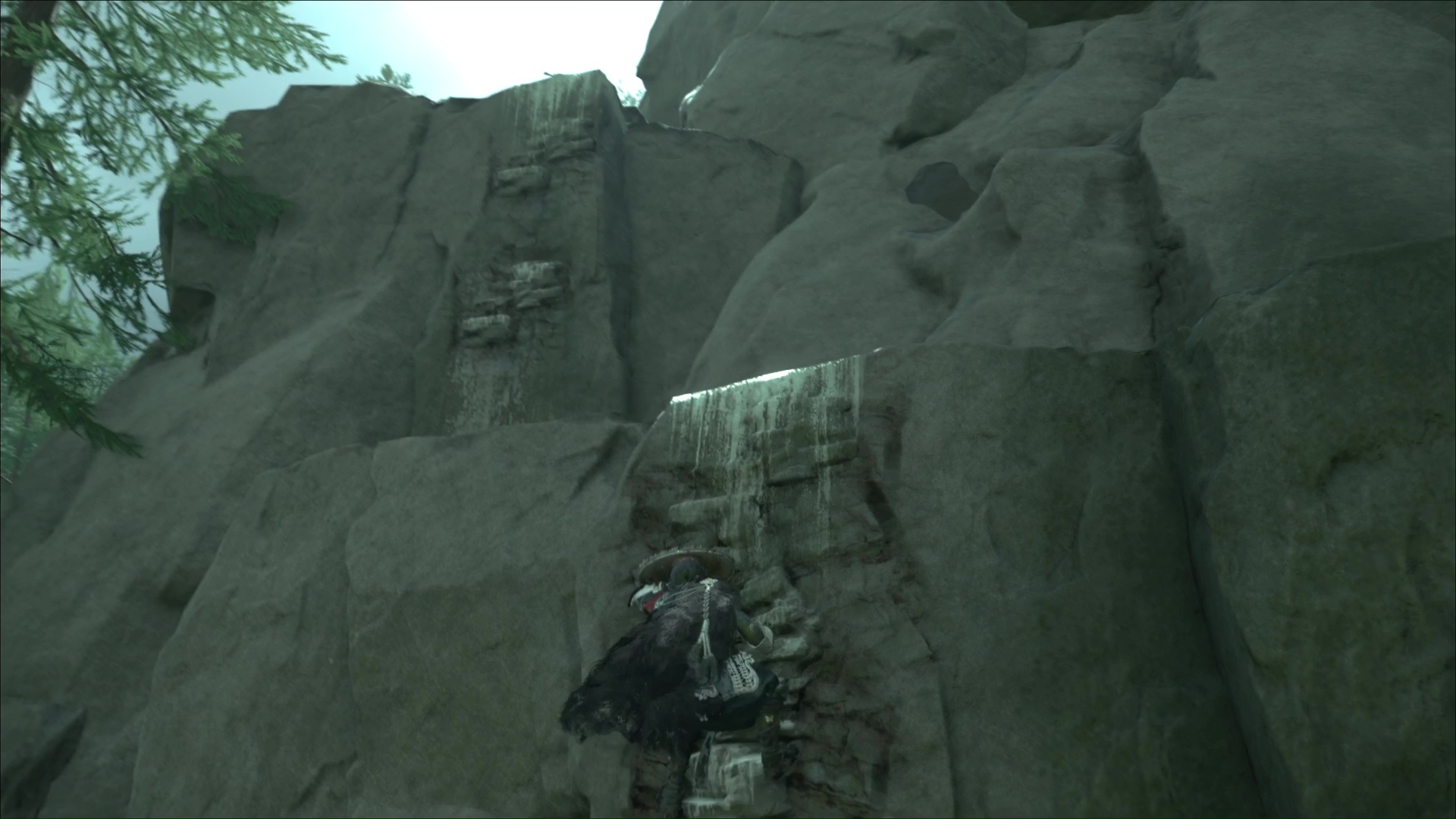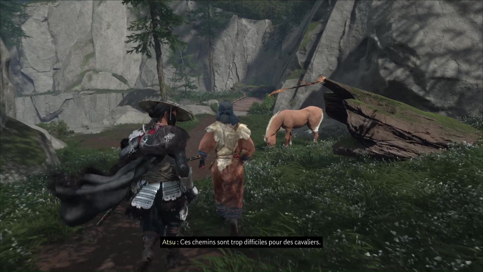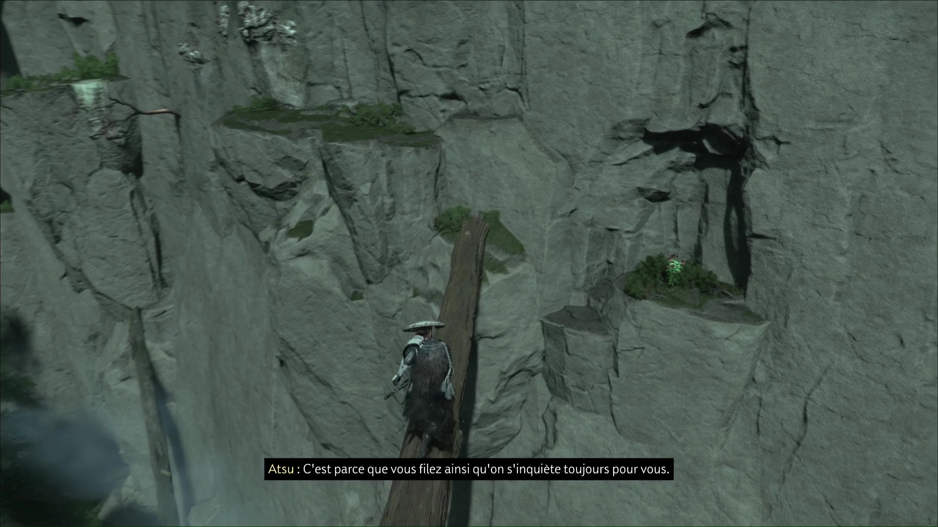 huci suggère de se séparer pour maximiser les chances de les trouver. L’aïnoue va suivre le chemin traditionnel tandis qu’Atsu va explorer plus bas. Vous glissez donc une pente. En bas, marchez sur l’arbre couché puis escaladez les prises rocheuses pour progresser.