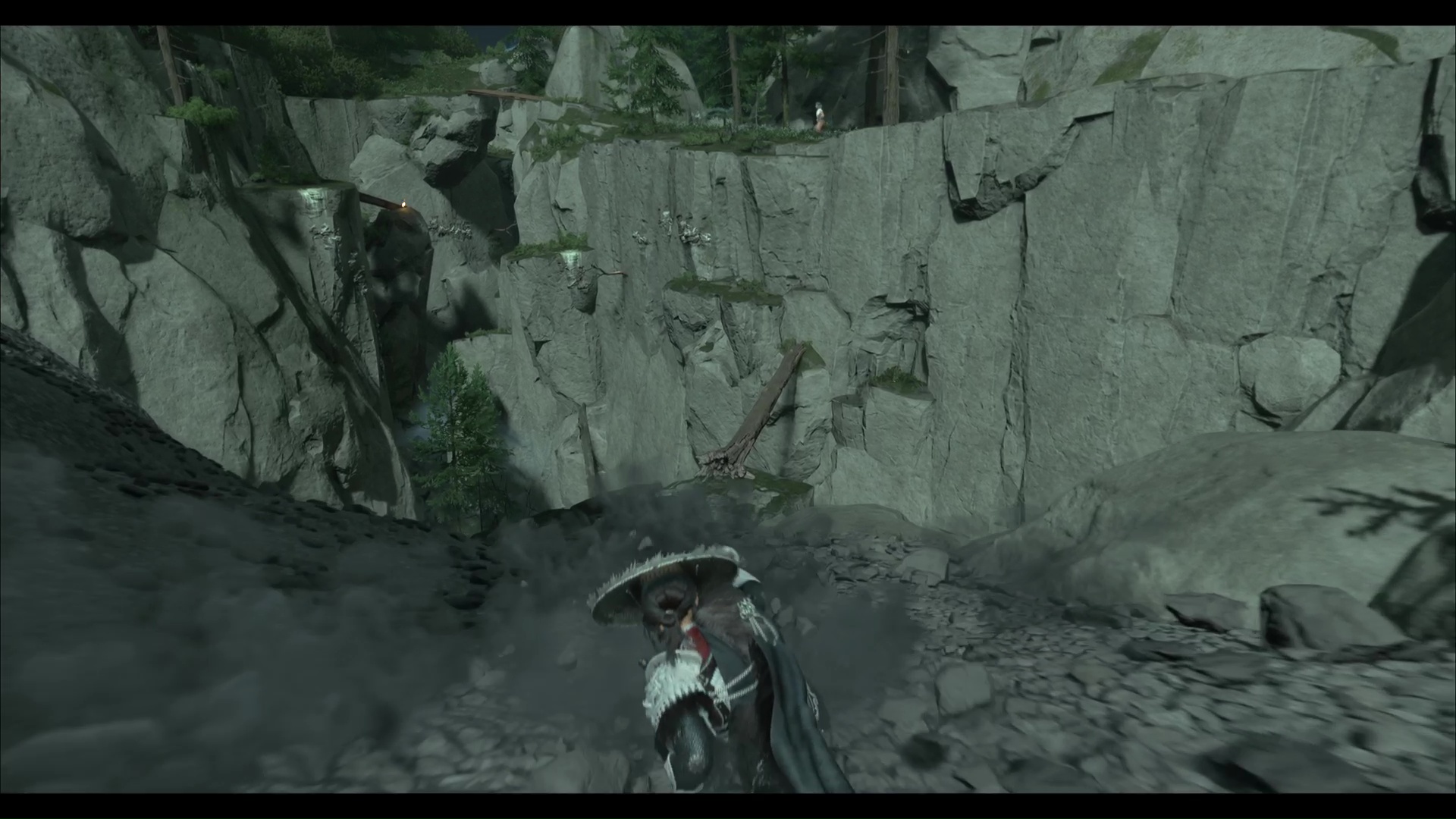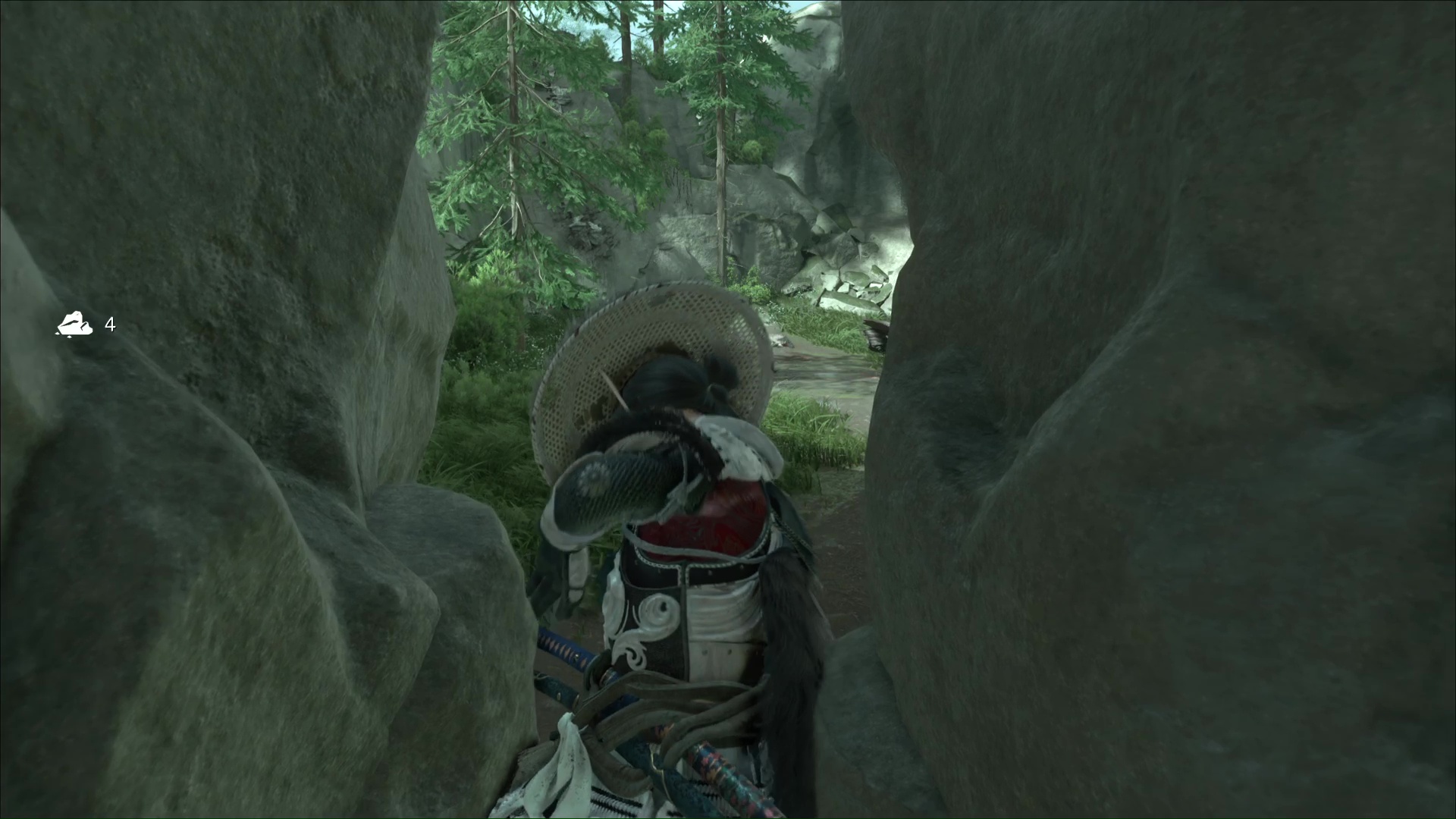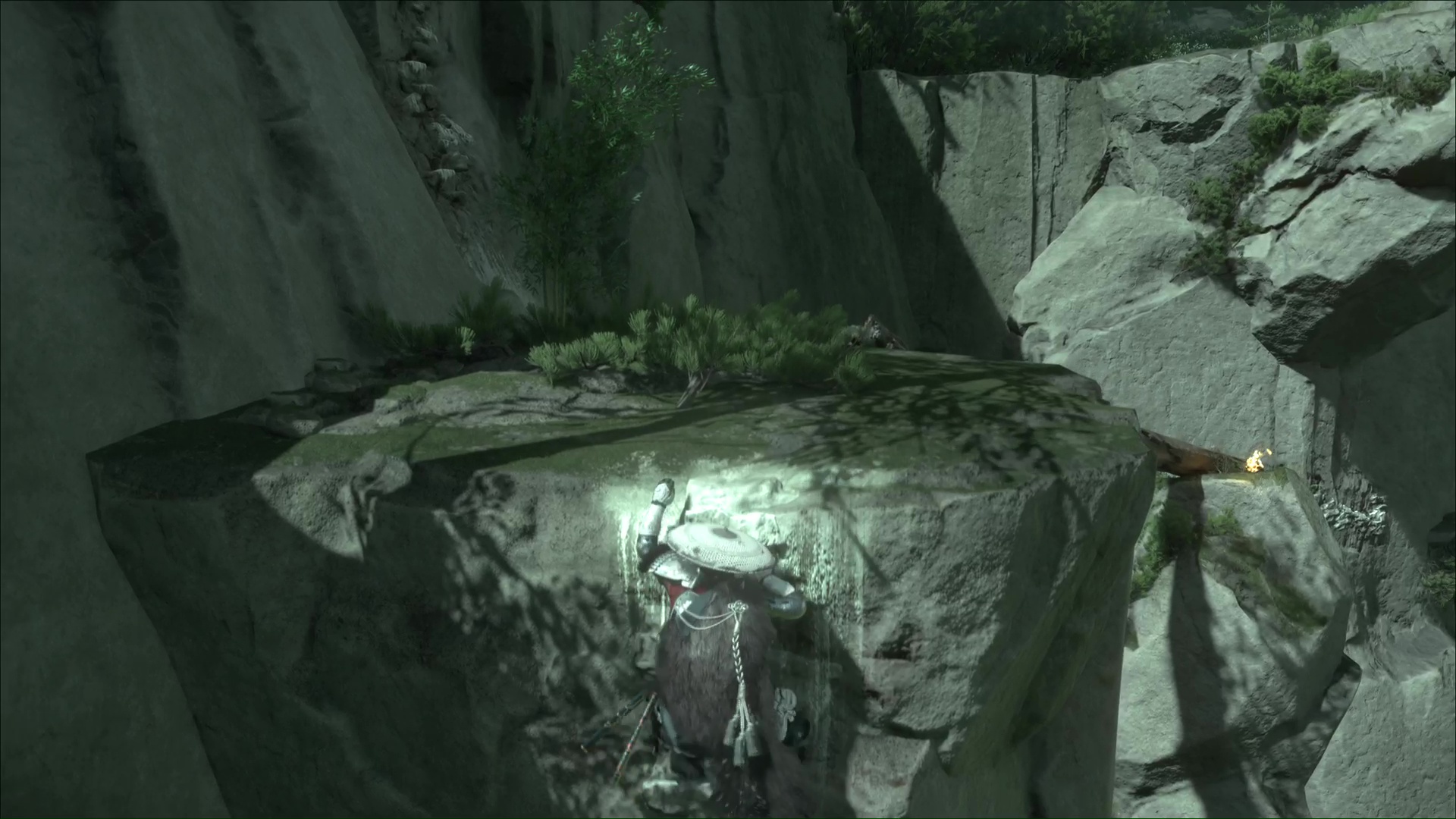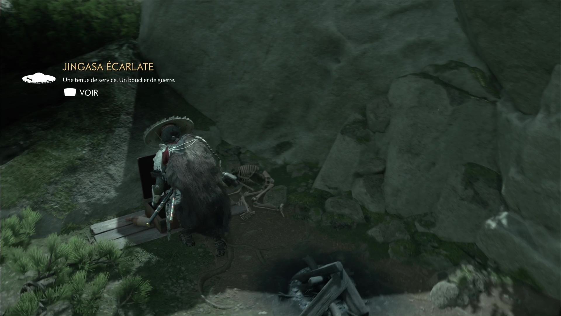 Hissez-vous puis, au lieu d’avancer, allez sur la gauche pour monter de nouvelles prises. Tout en haut, vous arrivez à un petit camp abandonné. Dans le coffre de gauche, vous trouverez un jingasa écarlate, un chapeau.