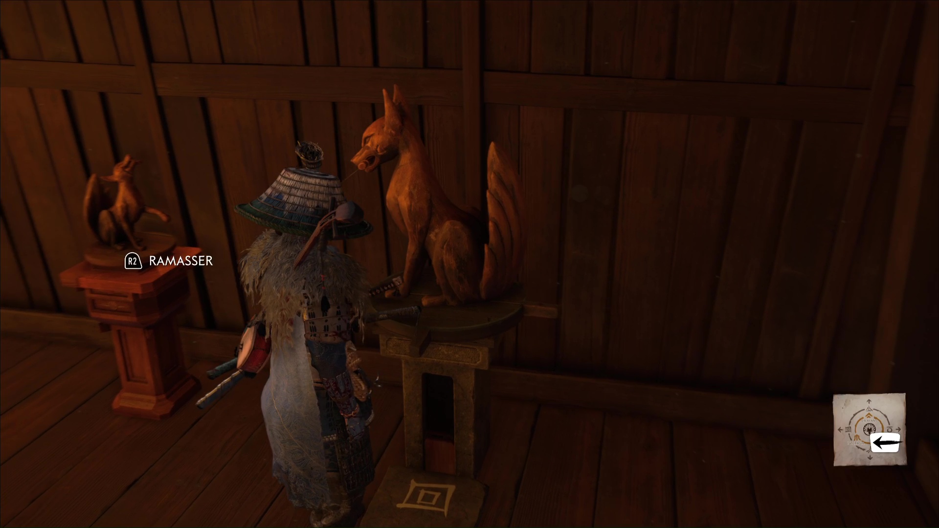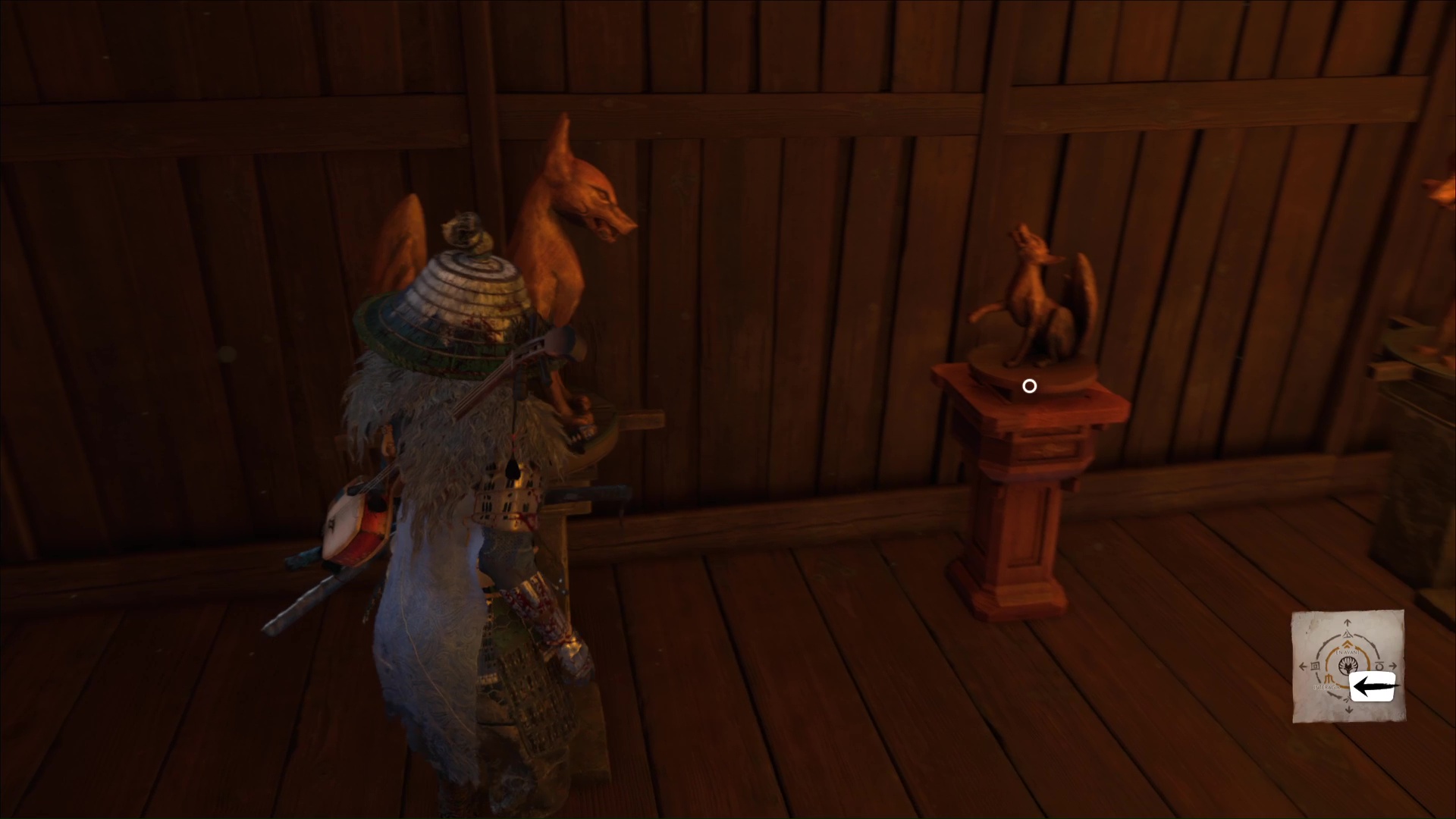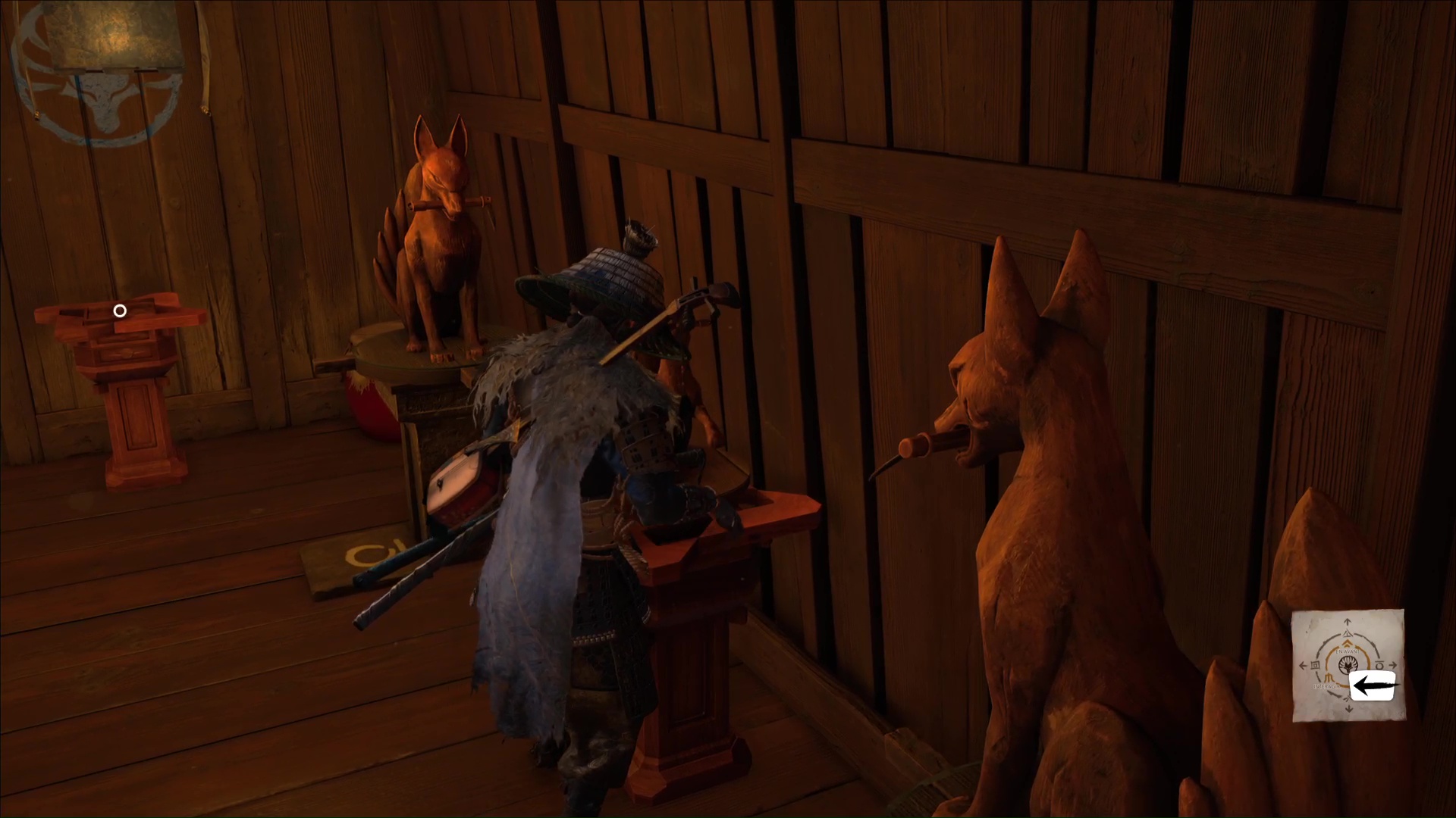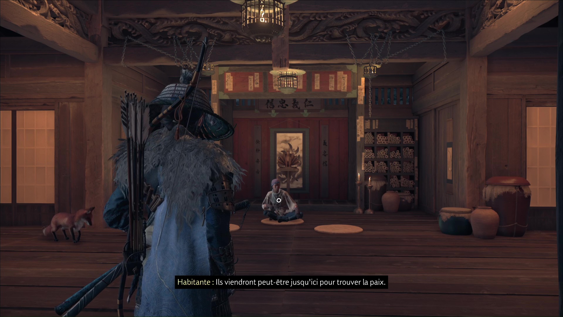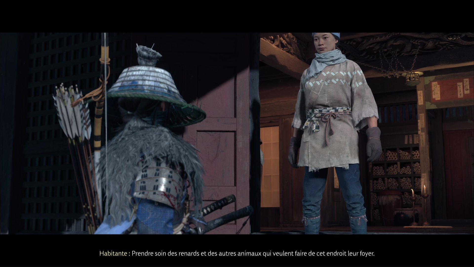L’habitante vous demande ensuite de prendre soin des renards, qui viendront trouver refuge ici. D’ailleurs, lorsque vous aurez complété tous les terriers de renards, vous débloquerez un masque en vous adressant à la gardienne de ces lieux. Terminez le récit en quittant le bâtiment par la droite.