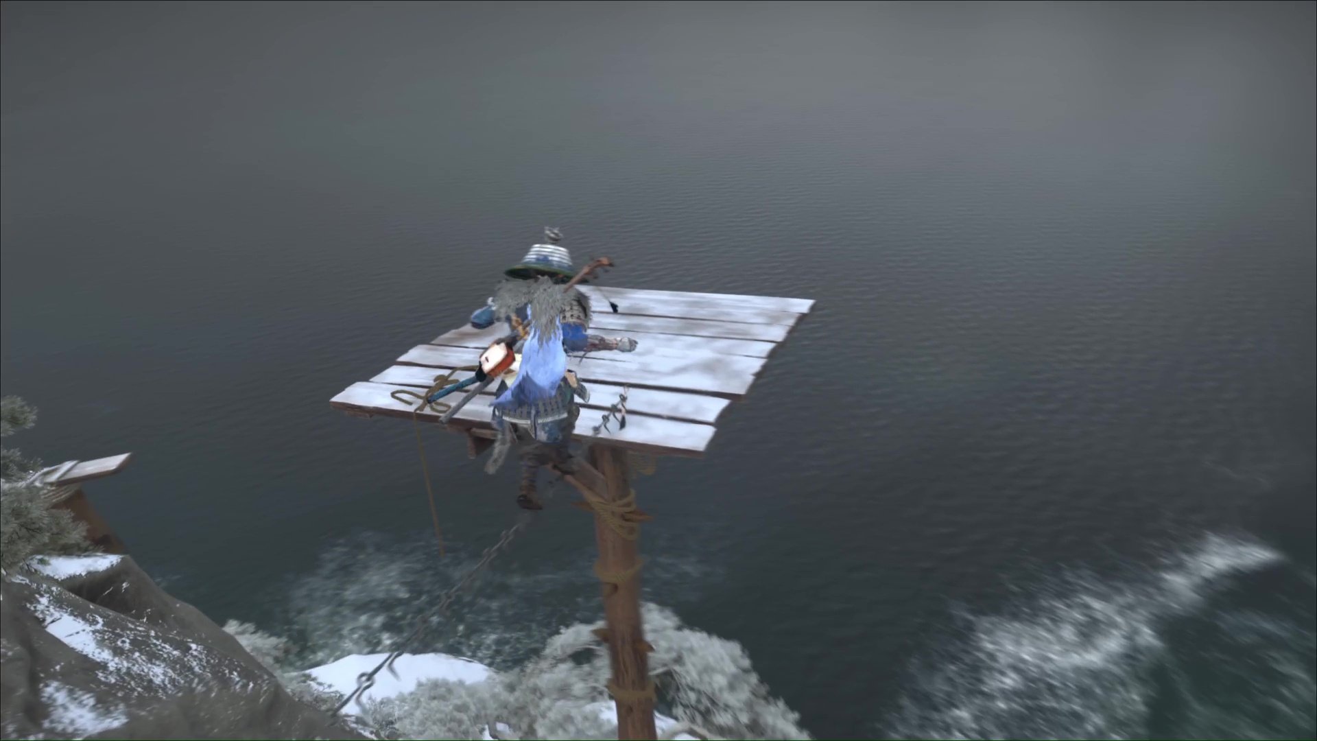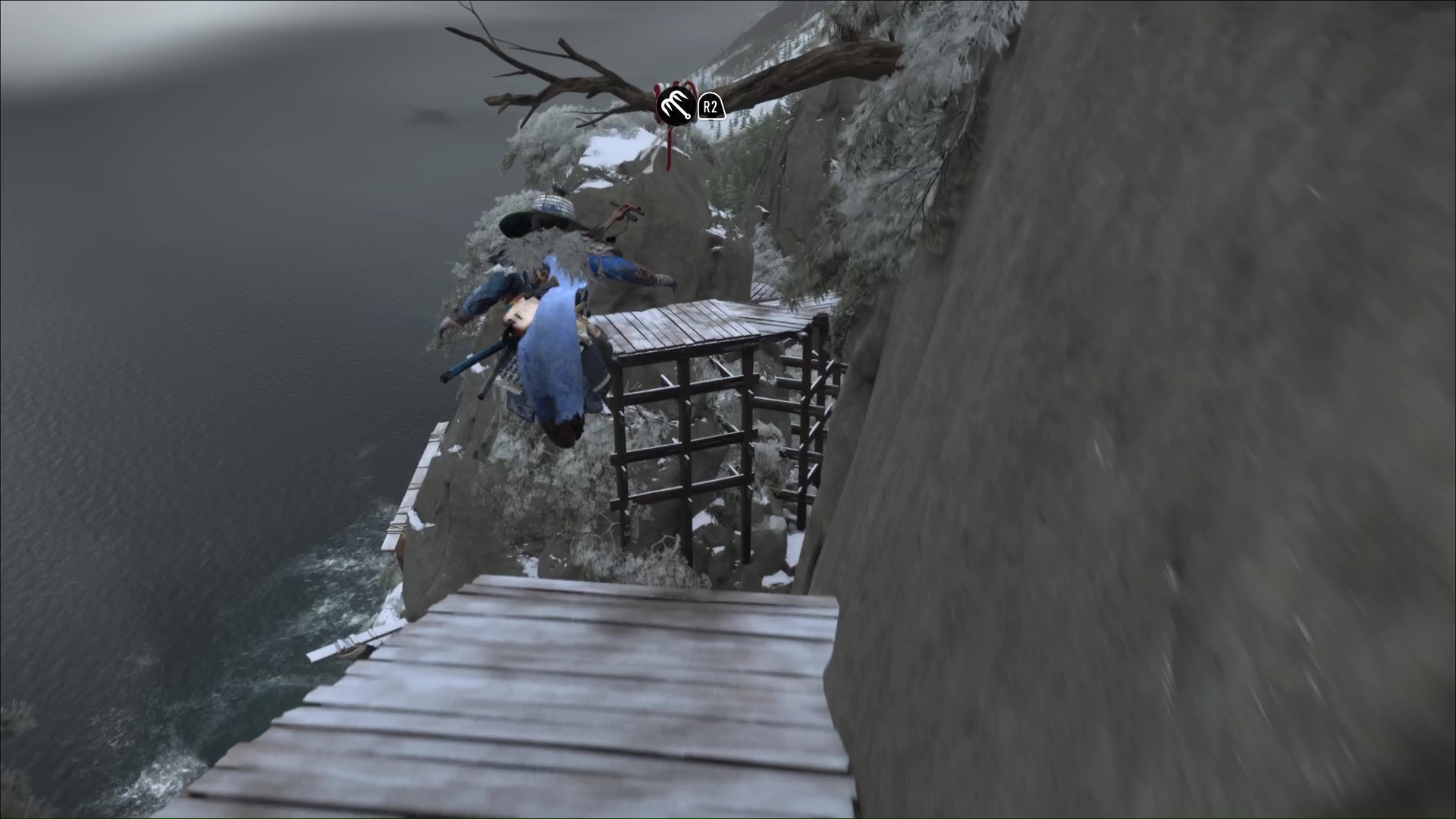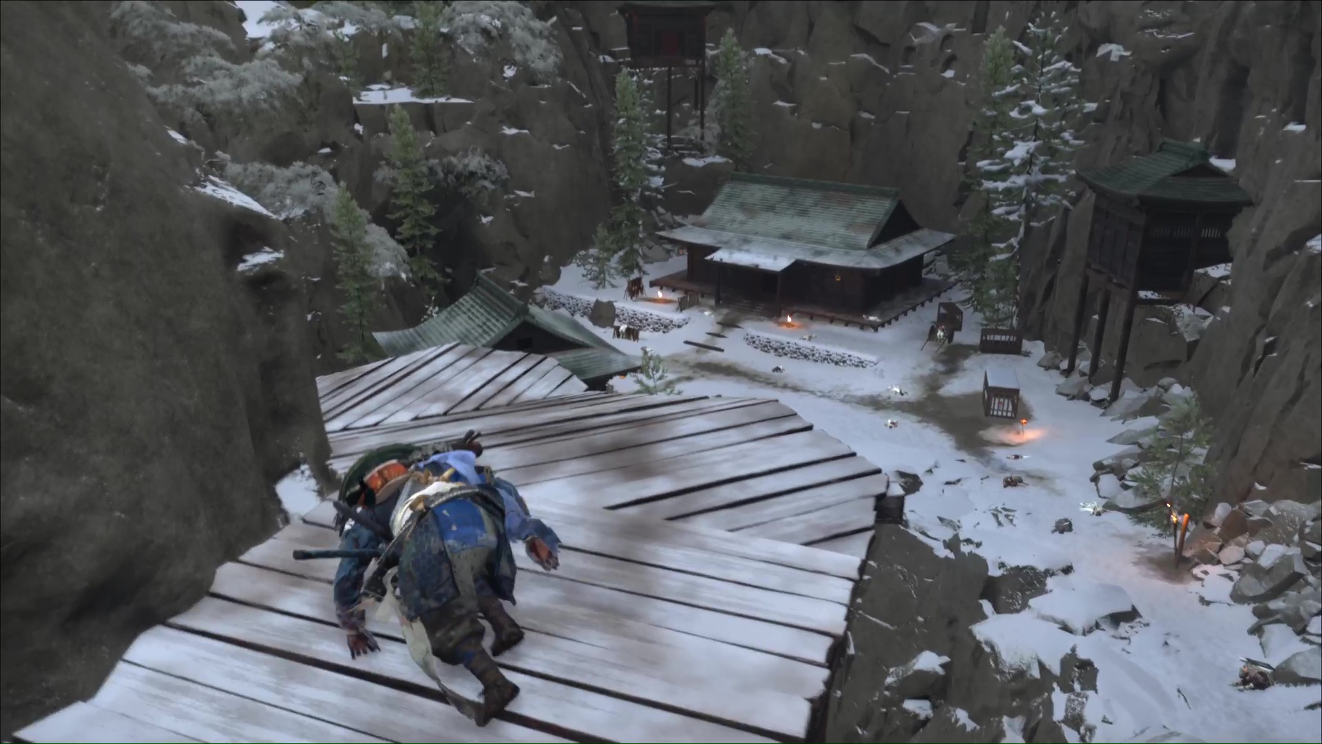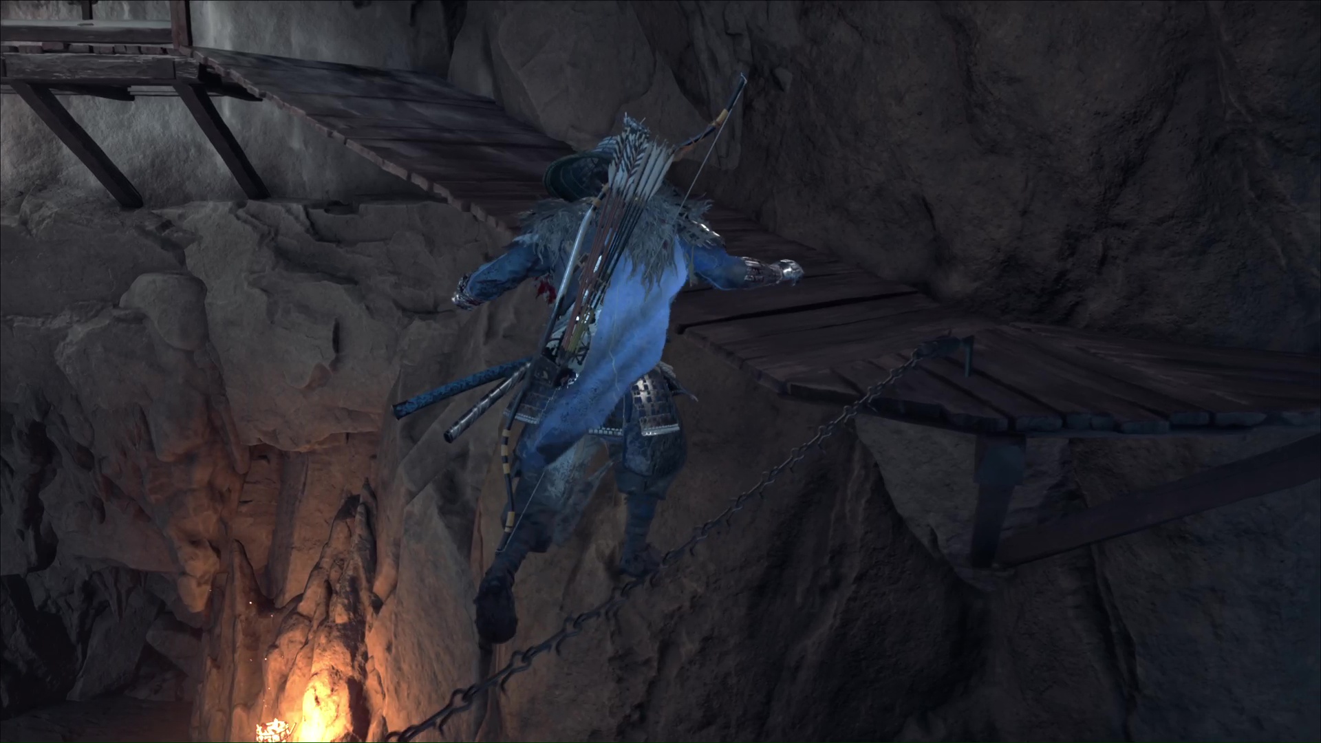 Poussez cette porte et vous serez à présente dans le Repaire du camp de chasse. Tournez la tête sur la droite et commencez un petit parcours de plateforme. Sautez au grappin sur une branche pour atterrir sur une plateforme en face.