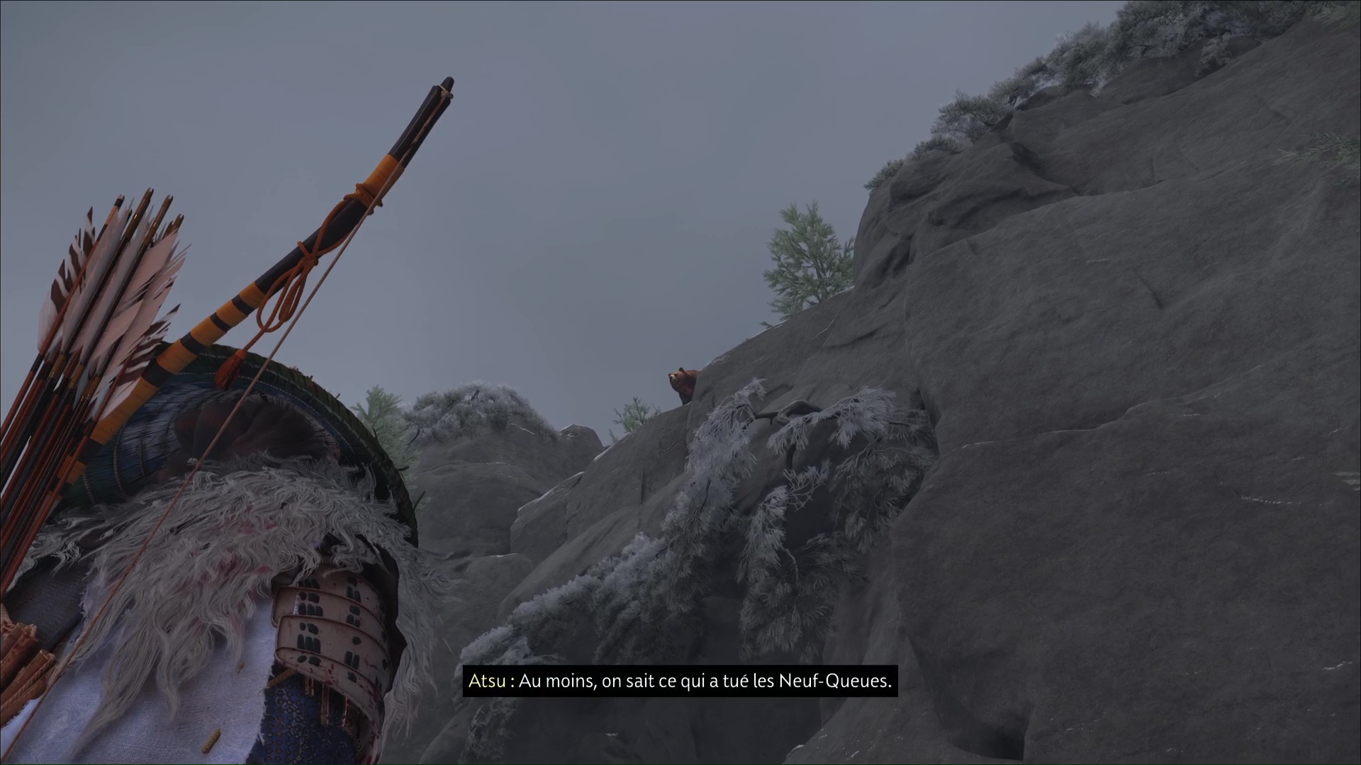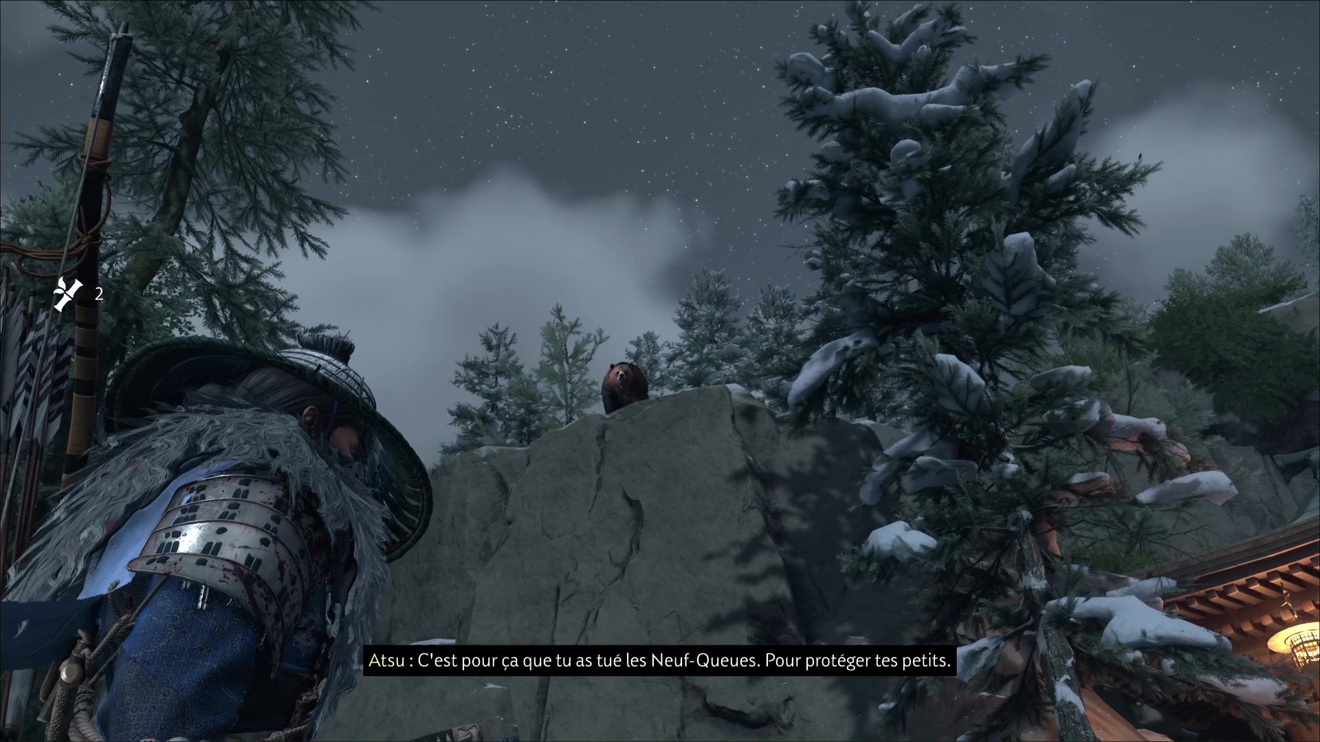 Examinez les corps pour constater que la cause des meurtres n’est pas forcément humaine. Quelques mètres plus loin, un renard est enfermé dans une cage. Libérez-le et suivez-le. Soudain, Atsu aperçoit, en hauteur, un ours, probablement le responsable de la tuerie.