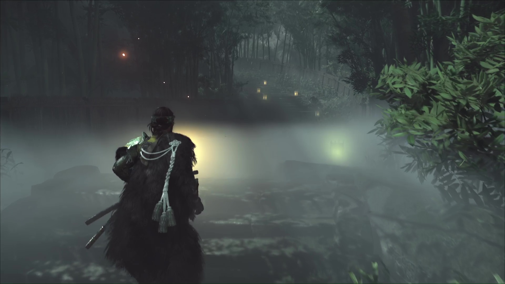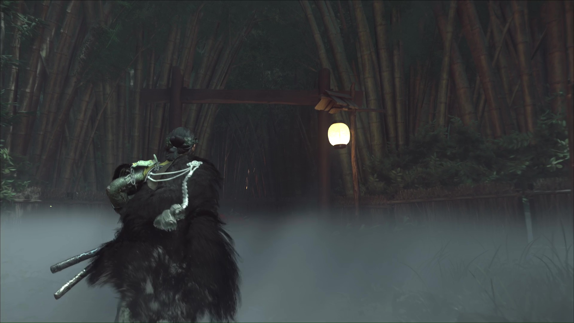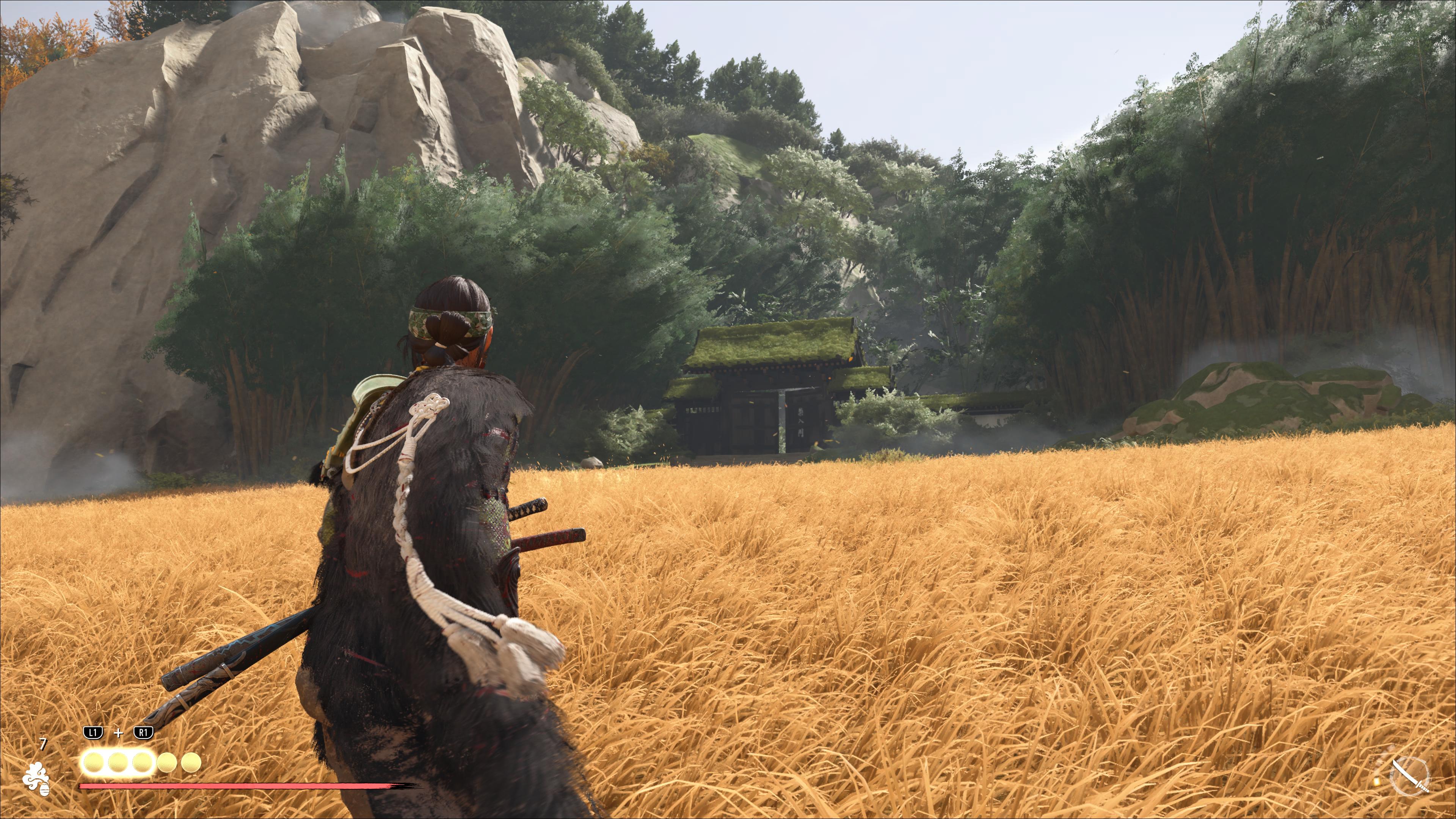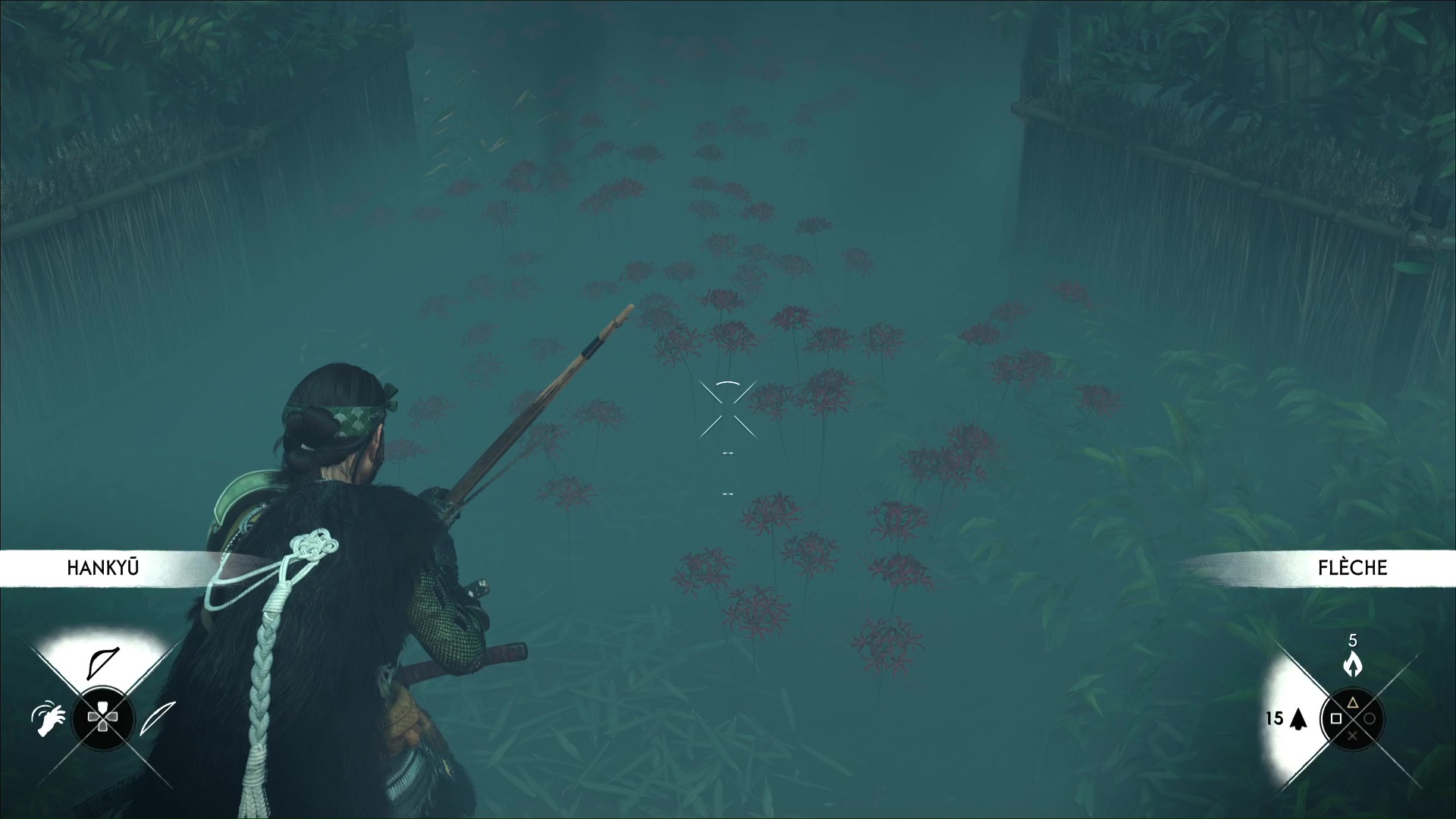 Commencez par aller sur la gauche. Cherchez une lanterne suspendue qui marque l’entrée d’une forêt de bambous. Entrez à l’intérieur pour arriver à un bambou d’entraînement. Vous allez devoir le couper mais, surtout, faire d’abord apparaître les bambous via une petite énigme d’orientation.