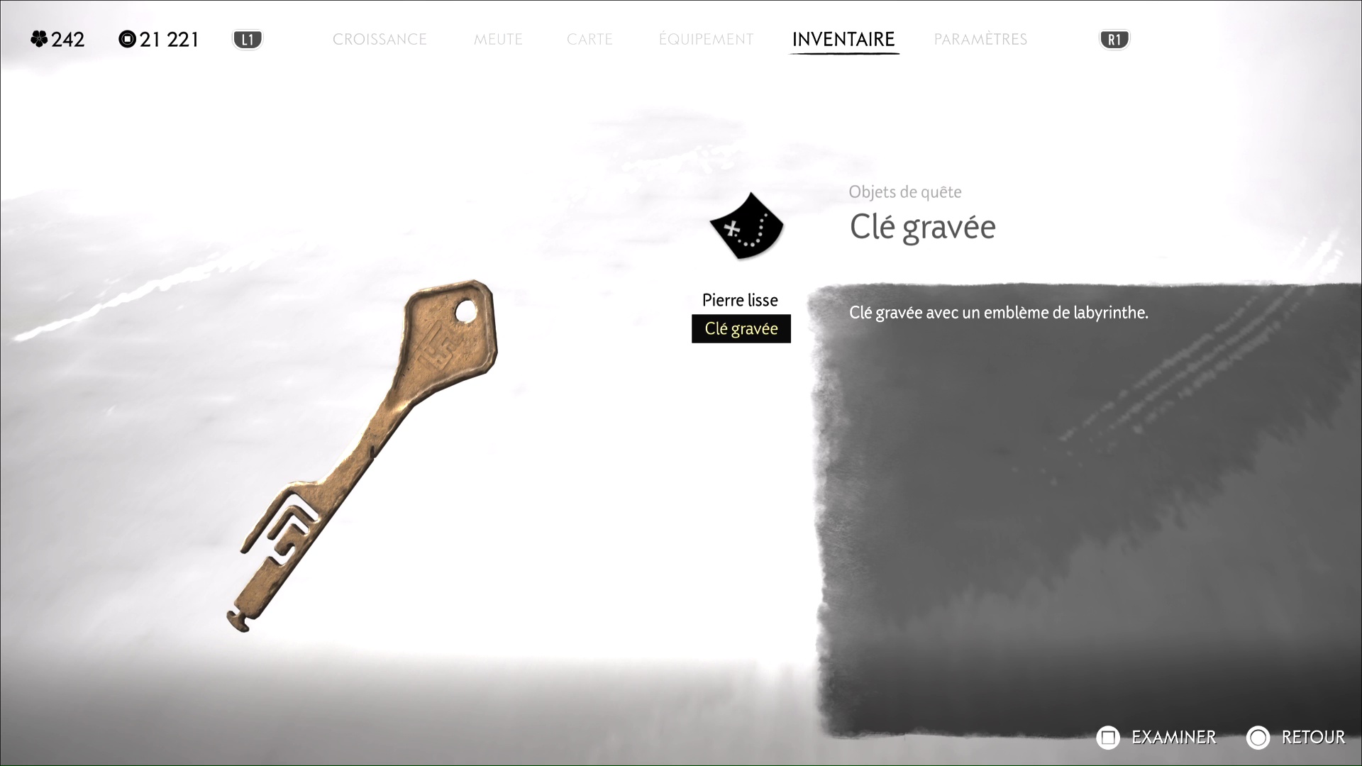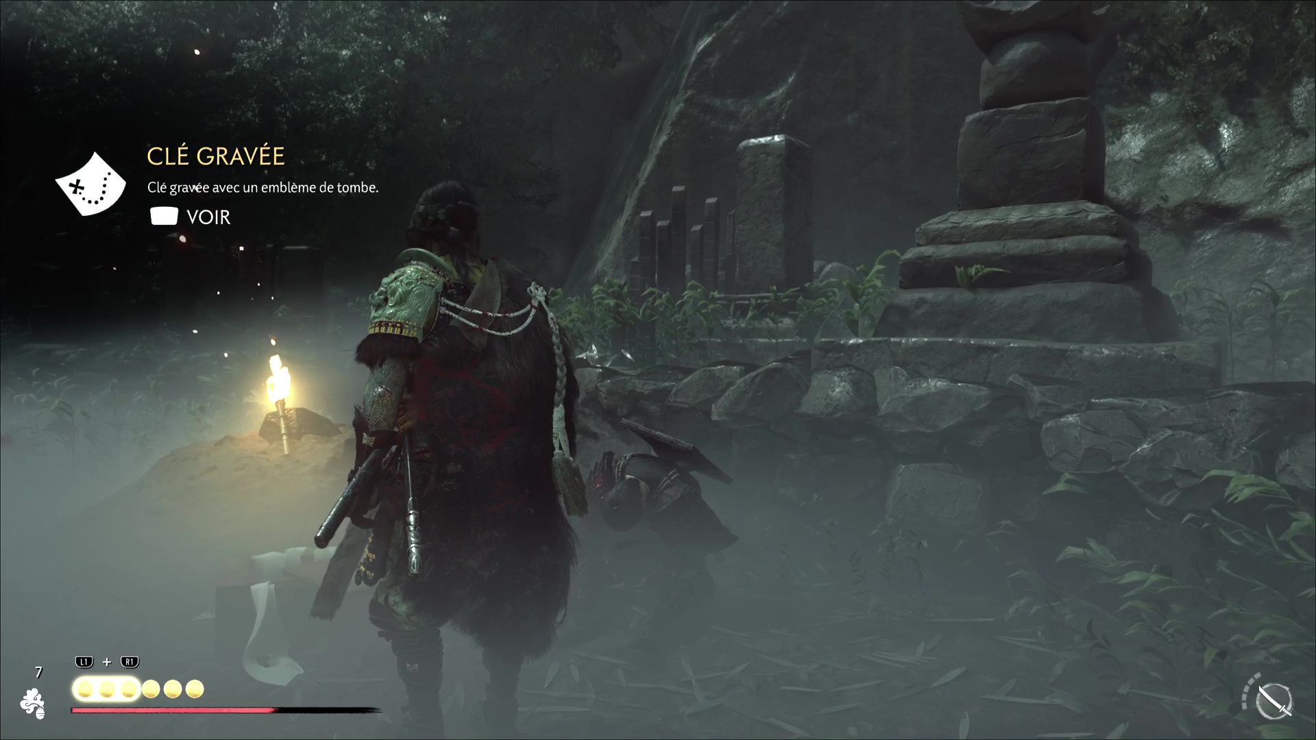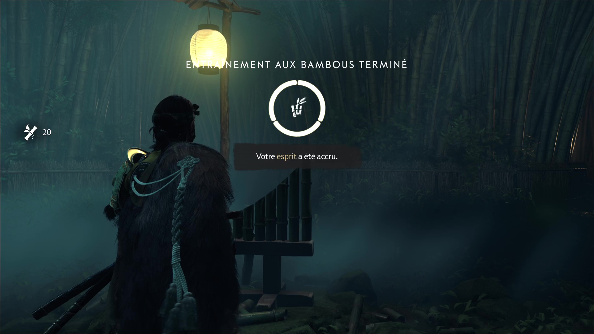 Vous réapparaîtrez alors de nouveau devant le stand d’entraînement, mais un bambou aura été ajouté. Répétez l’opération jusqu’à rendre le stand disponible avec trois bambous, puis réussissez-le comme les autres pour non seulement débloquer votre augmentation d’esprit mais aussi récupérer la Clé gravée en forme de labyrinthe.