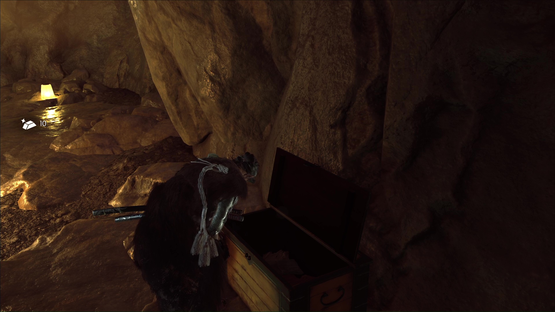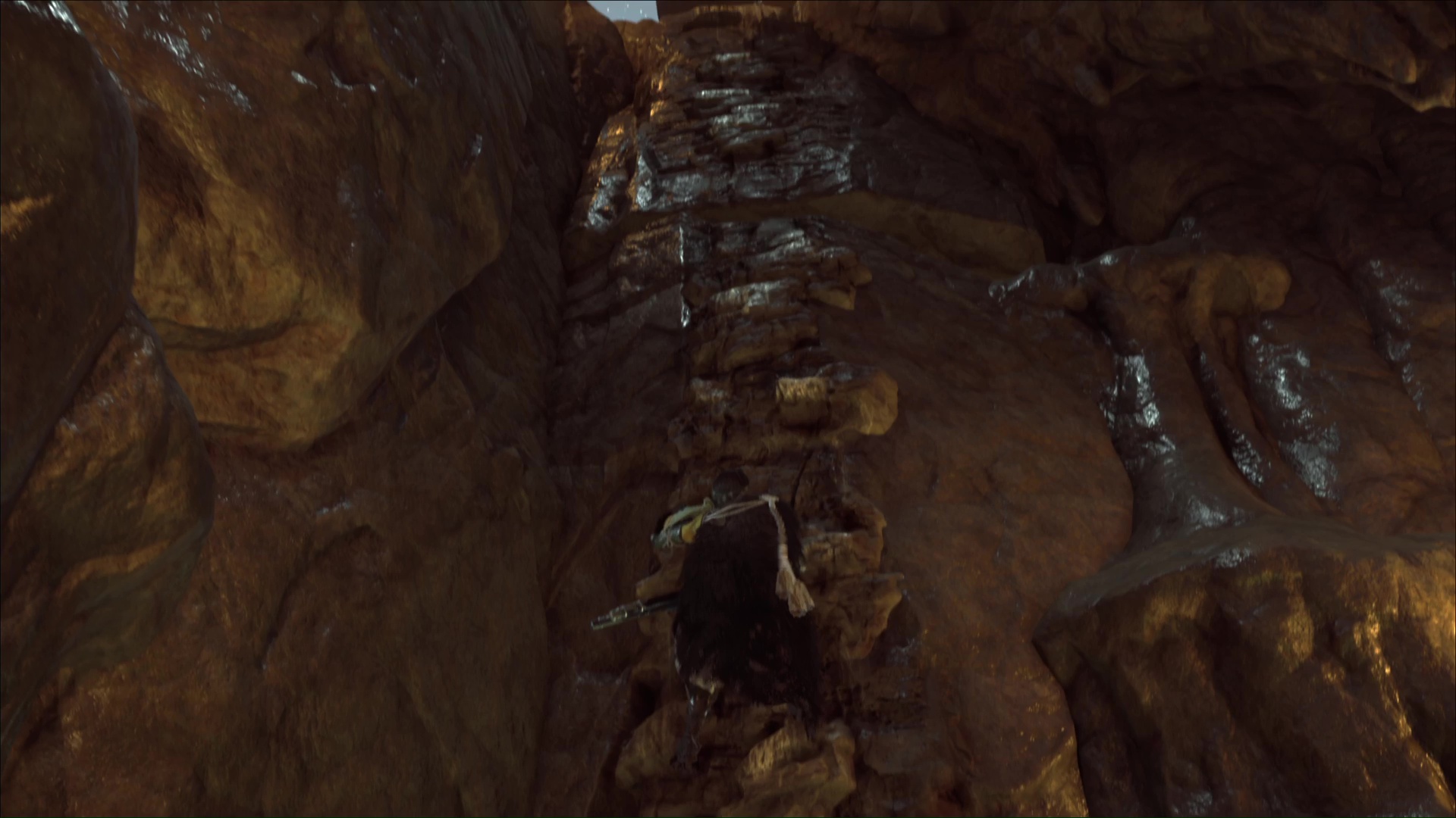 Avancez en récupérant les ressources naturelles ou dans des coffres, tout en suivant le chemin de cadavres. Après une petite montée, vous arrivez devant des prises rocheuses à escalader.